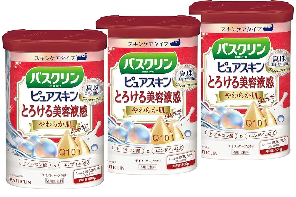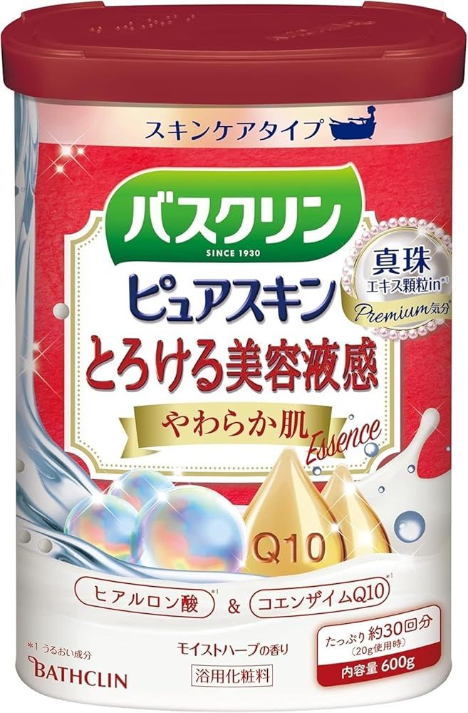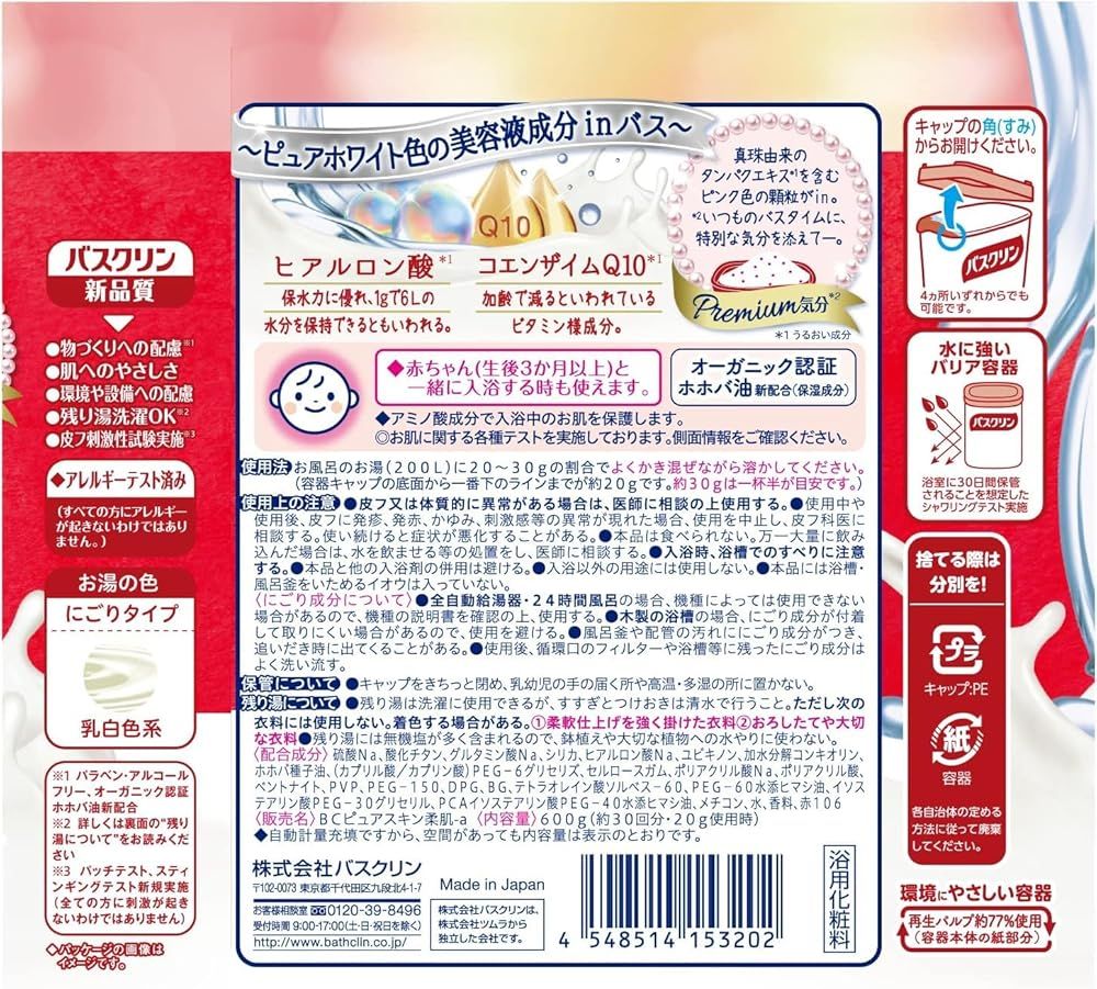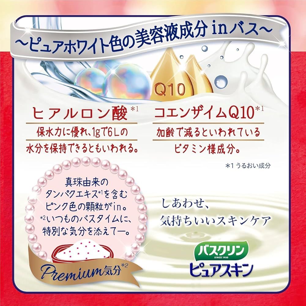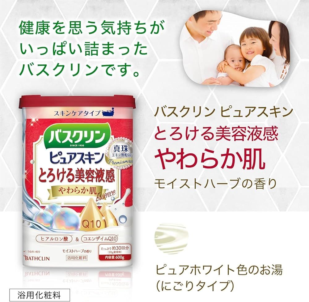 商品紹介 「しあわせ、気持ちいいスキンケア」キレイをサポートするスキンケアタイプの入浴剤です。ヒアルロン酸&コエンザイムQ10配合。香りはモイストハーブ。お湯の色はピュアホワイト色(乳白色系/にごりタイプ) 使用上の注意 ●皮フ又は体質的に異常がある場合は、医師に相談の上使用する。●使用中や使用後、皮フに発疹、発赤、かゆみ、刺激感等の異常が現れた場合、使用を中止し、皮フ科医に相談する。使い続けると症状が悪化することがある。●本品は食べられない。万一大量に飲み込んだ場合は、水を飲ませる等の処置をし、医師に相談する。●入浴時、浴槽でのすべりに注意する。●本品と他の入浴剤の併用は避ける。●入浴以外の用途には使用しない。●本品には浴槽・風呂釜をいためるイオウは入っていない。●全自動給湯器・24時間風呂の場合、機種によっては使用できない場合があるので、機種の説明書を確認の上、使用する。●木製の浴槽の場合、にごり成分が付着して取りにくい場合があるので、使用を避ける。●風呂釜や配管の汚れににごり成分がつき、追いだき時に出てくることがある。●使用後、循環口のフィルターや浴槽等に残ったにごり成分はよく洗い流す。 原材料・成分 硫酸Na、酸化チタン、グルタミン酸Na、シリカ、ヒアルロン酸Na、ユビキノン、加水分解コンキオリン、ホホバ種子油、(カプリル酸/カプリン酸)PEG-6グリセリズ、セルロースガム、ポリアクリル酸Na、ポリアクリル酸、ベントナイト、PVP、PEG-150、DPG、BG、テトラオレイン酸ソルベス-60、PEG-60水添ヒマシ油、イソステアリン酸PEG-30グリセリル、PCAイソステアリン酸PEG-40水添ヒマシ油、メチコン、水、香料、赤106 使用方法 お風呂のお湯(200L)に20~30gの割合でよくかき混ぜながら溶かしてください。(容器キャップの底面から一番下のラインまでが約20gです。約30gは一杯半が目安です。) ご注意(免責)>必ずお読みください ●キャップをきちっと閉め、乳幼児の手の届く所や高温・多湿の所に置かない。●残り湯は洗濯に使用できるが、すすぎとつけおきは清水で行うこと。ただし次の衣料には使用しない。着色する場合がある。1柔軟仕上げを強く掛けた衣料2おろしたてや大切な衣料●残り湯には無機塩が多く含まれるので、鉢植えや大切な植物への水やりに使わない。