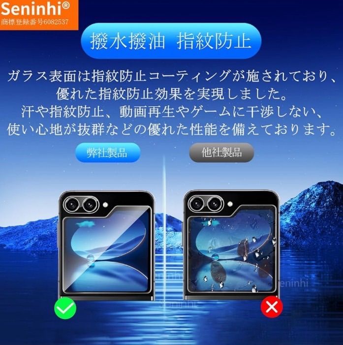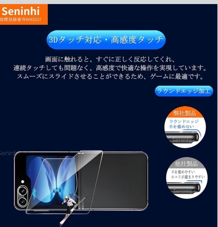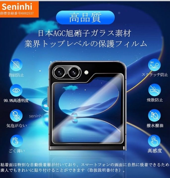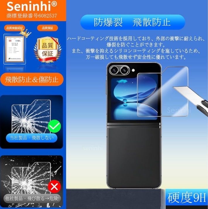 【優れるガラスを選択・硬さ9H+】 私たちの Galaxy Z flip 6 ガラスフィルムは業界最高レベルの硬さ9H+を使っており、4.5時間以上の高温処理加工しておりますので、ガラスフィルムは通常のガラスの硬さの5倍に達しました。シリコンコーティングを内蔵して、ショックを抑えることができ、画面への損害を最小限に抑えます。更に特別なデザインを使っており、保護フィルムが携帯電話の画面をしっかり保護する同時にガラスが割れでも、ガラスの破片が飛びません。安心できます。