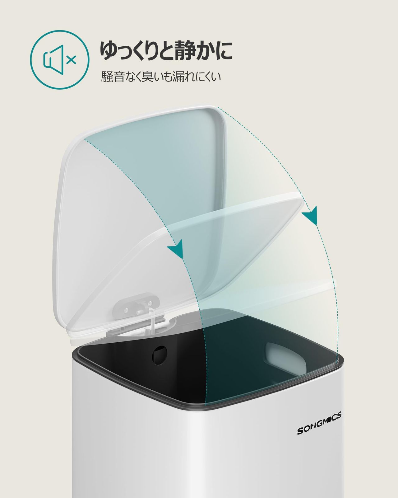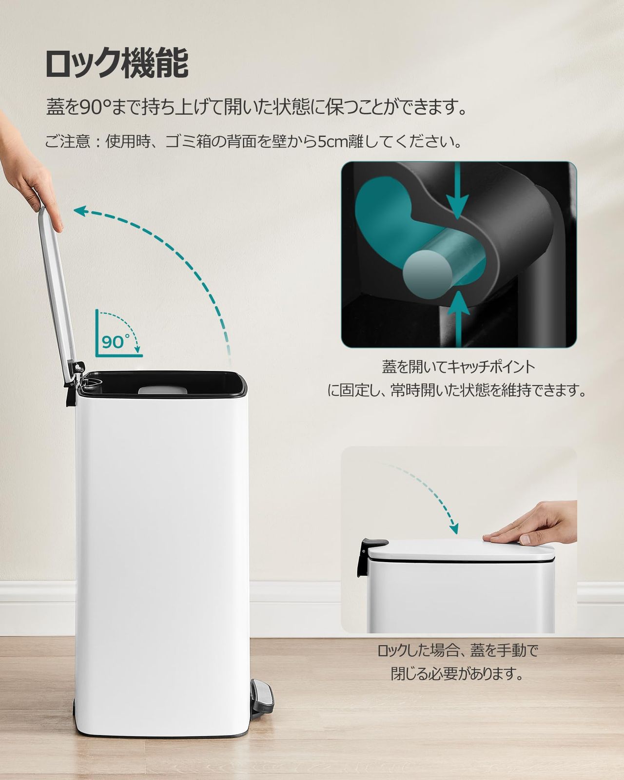 【ソフトクローズ&常時開いた機能】このゴミ箱には、静かで優しく蓋が閉まる機能があり、ゆっくり閉まります。さらに、必要に応じて蓋を手動で90°まで開いて開いた状態に保つことができ、簡単にごみを処分できます。