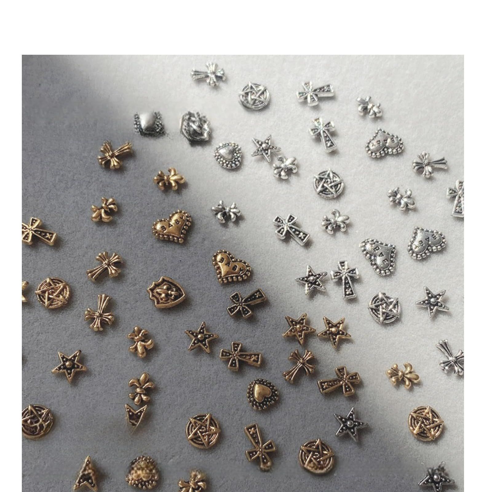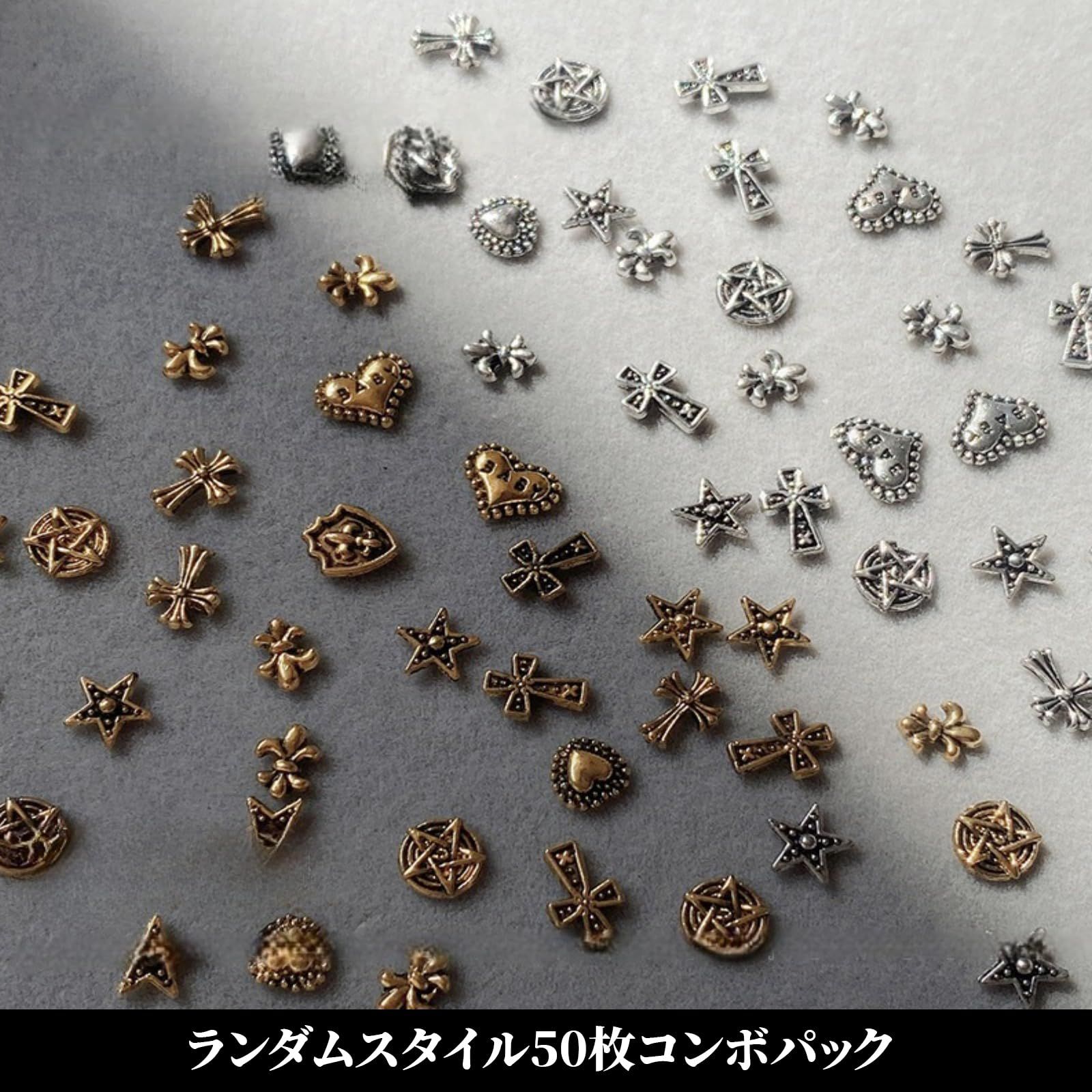 【図柄ランダム/多柄ブラインドボックス】50個 パンクネイルアートチャーム ネイルパーツ メタルパーツ 金属部品 3D スタッズ デコパーツ レトロ ネイル デザイン用品 DIY 手作り アクセサリー (銀)