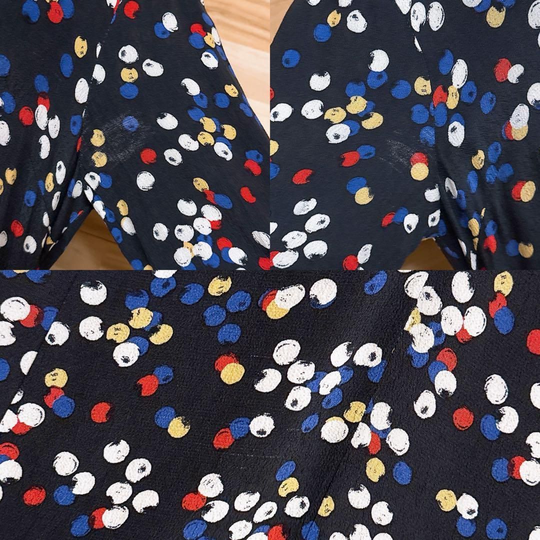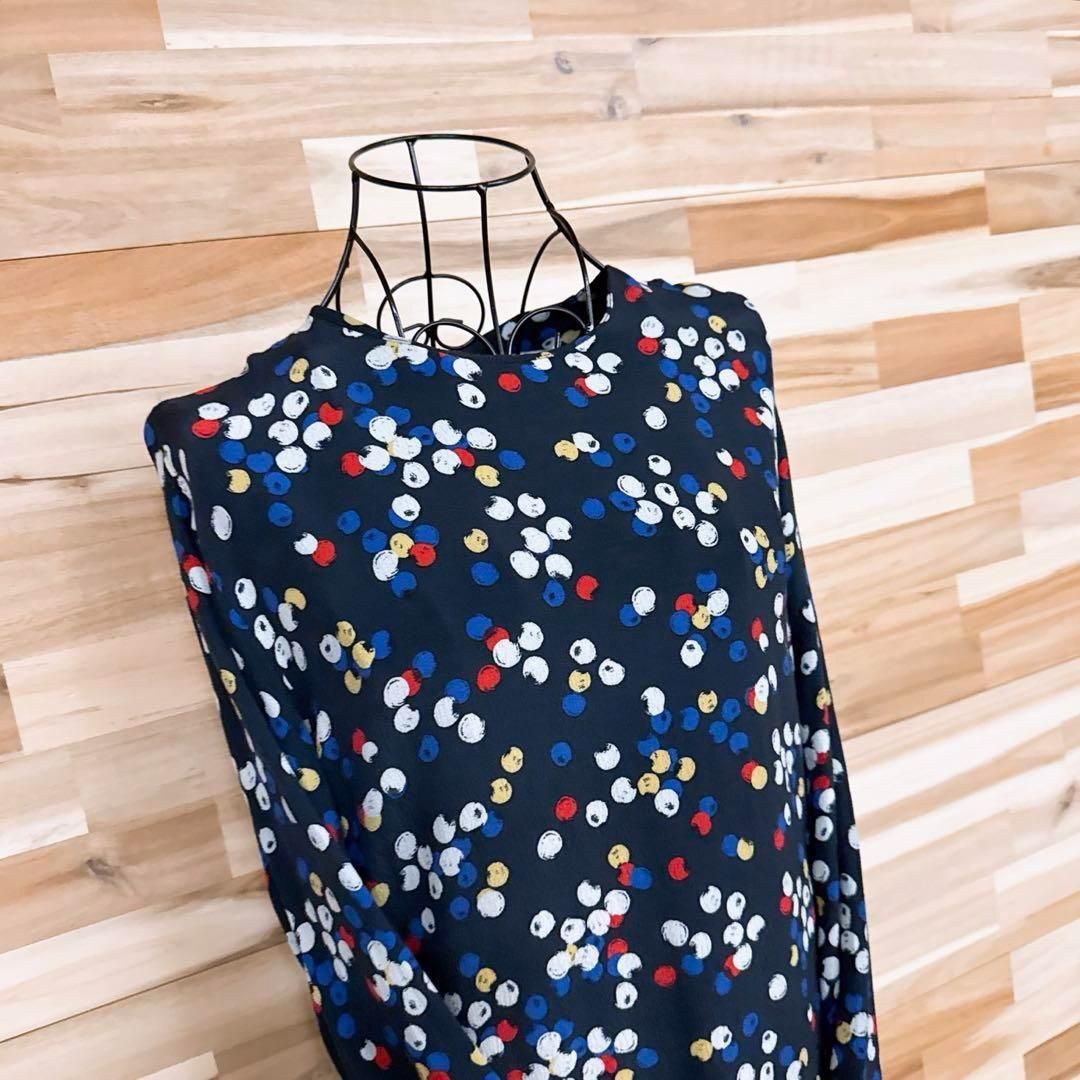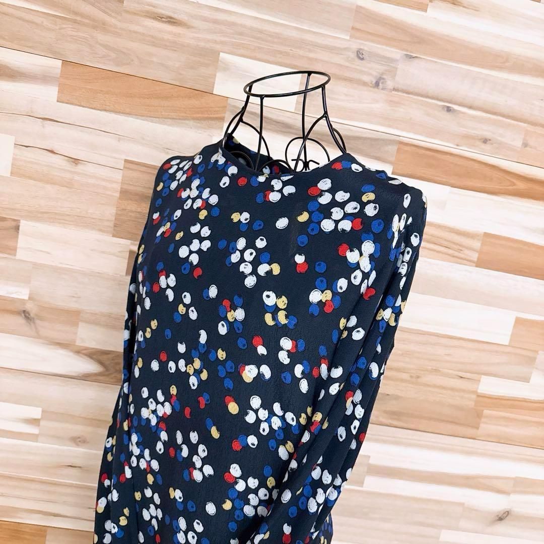 * レーヨン100% / 長袖 *落ち着きのあるネイビーの生地に、ランダムに散りばめられたカラフルなドットが映えるデザイン。さらりとしたレーヨン素材が肌に心地よく、わずかに凹凸のある「ちりめん」のような質感が上品な表情をプラス。ロング丈のシルエットがエレガントに揺れ、動くたびに華やかな印象を与えてくれる、大人オシャレなZARAのワンピースです。※LGスタイラーにて除菌リフレッシュ・スチームクリーニング済みです。