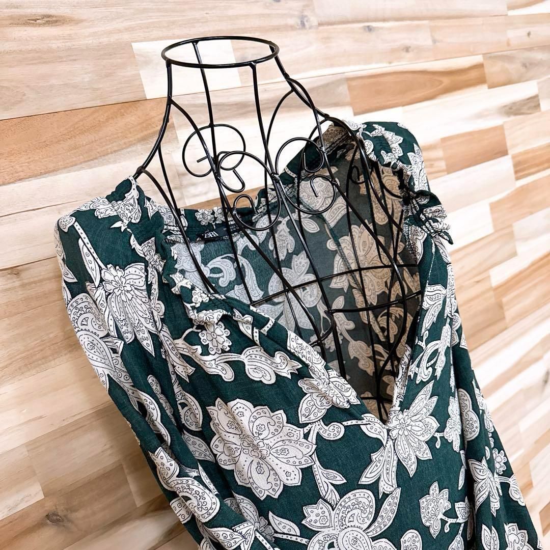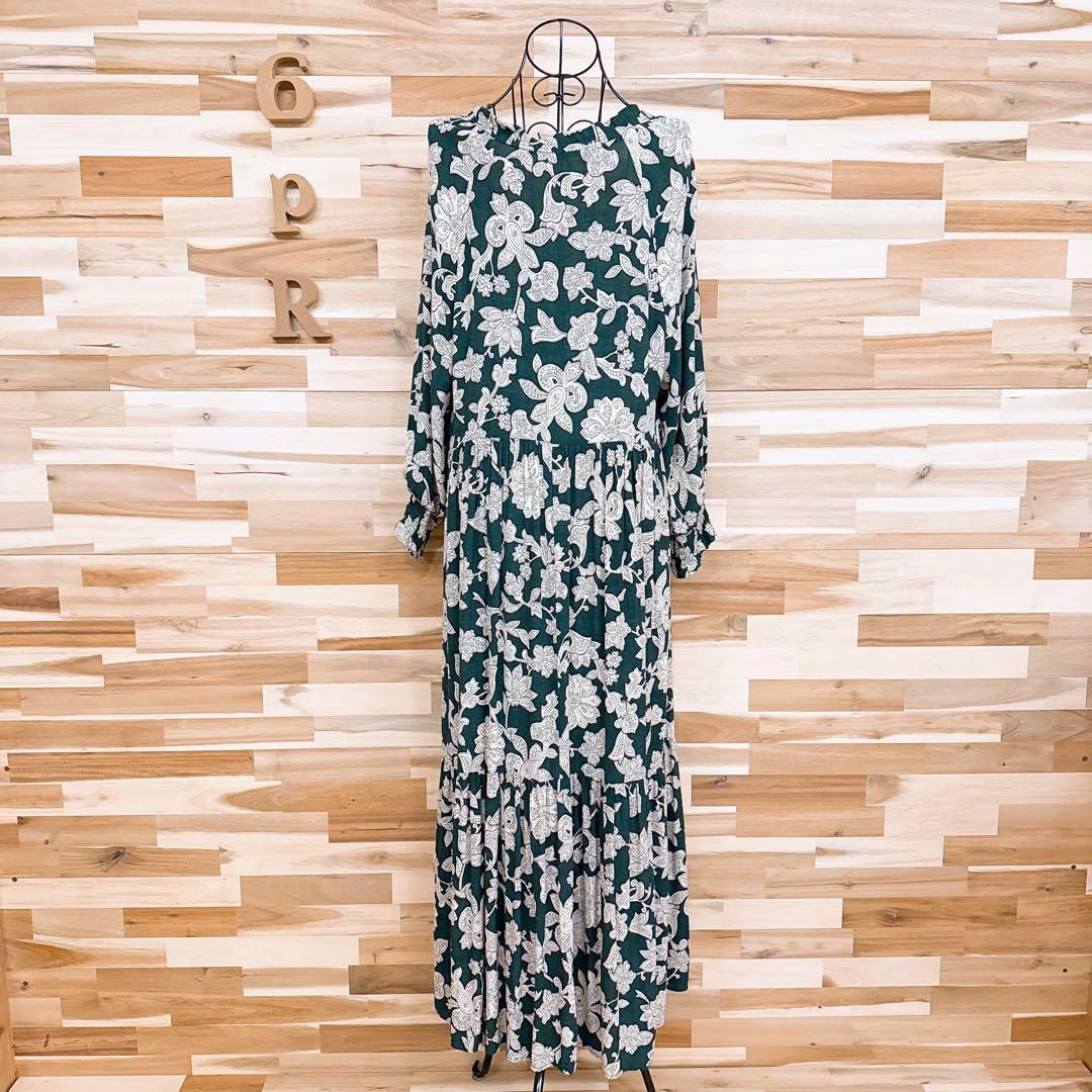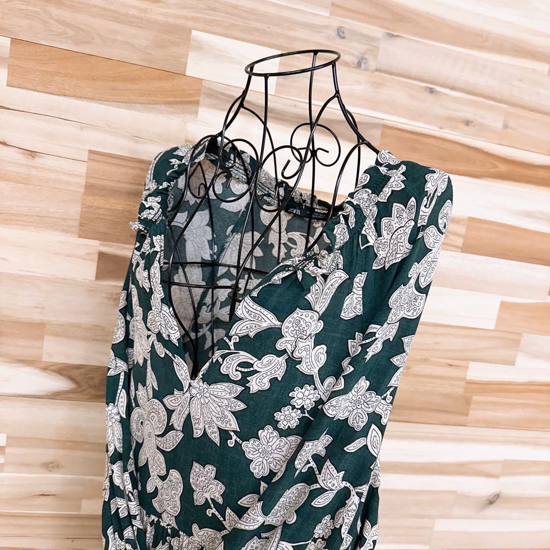 * 深めVネック / フラワー *レーヨン100%のやわらかな生地が肌に沿うようになじみ、繊細な光沢と落ち感を生む一着。ペイズリーをアレンジしたフラワーモチーフが上品に映え、ゆったりとしたシルエットが大人のリラックス感を漂わせてくれるZARAのワンピースです。※LGスタイラーにて除菌リフレッシュ・スチームクリーニング済みです。