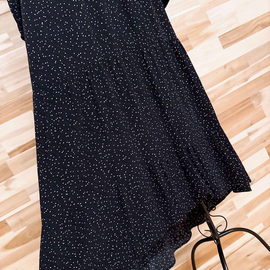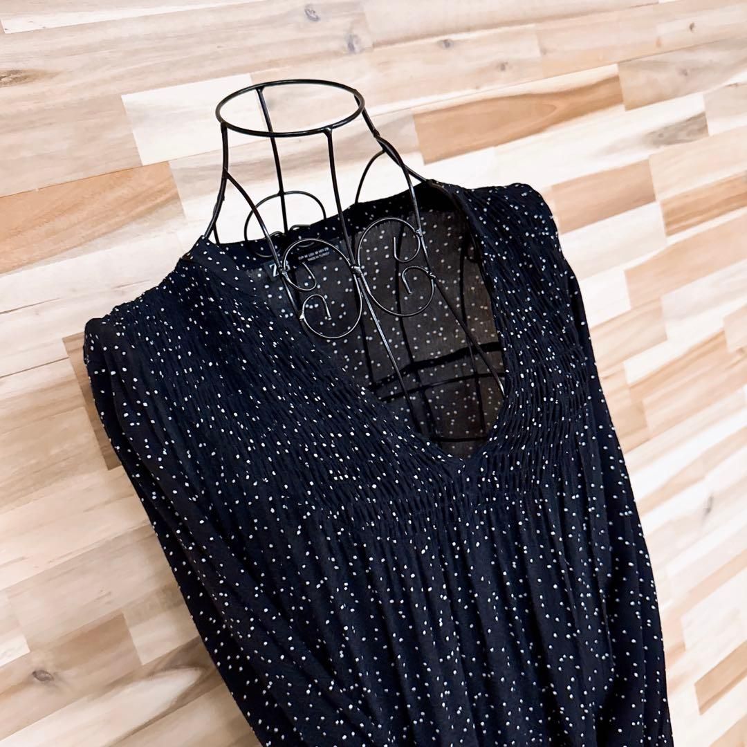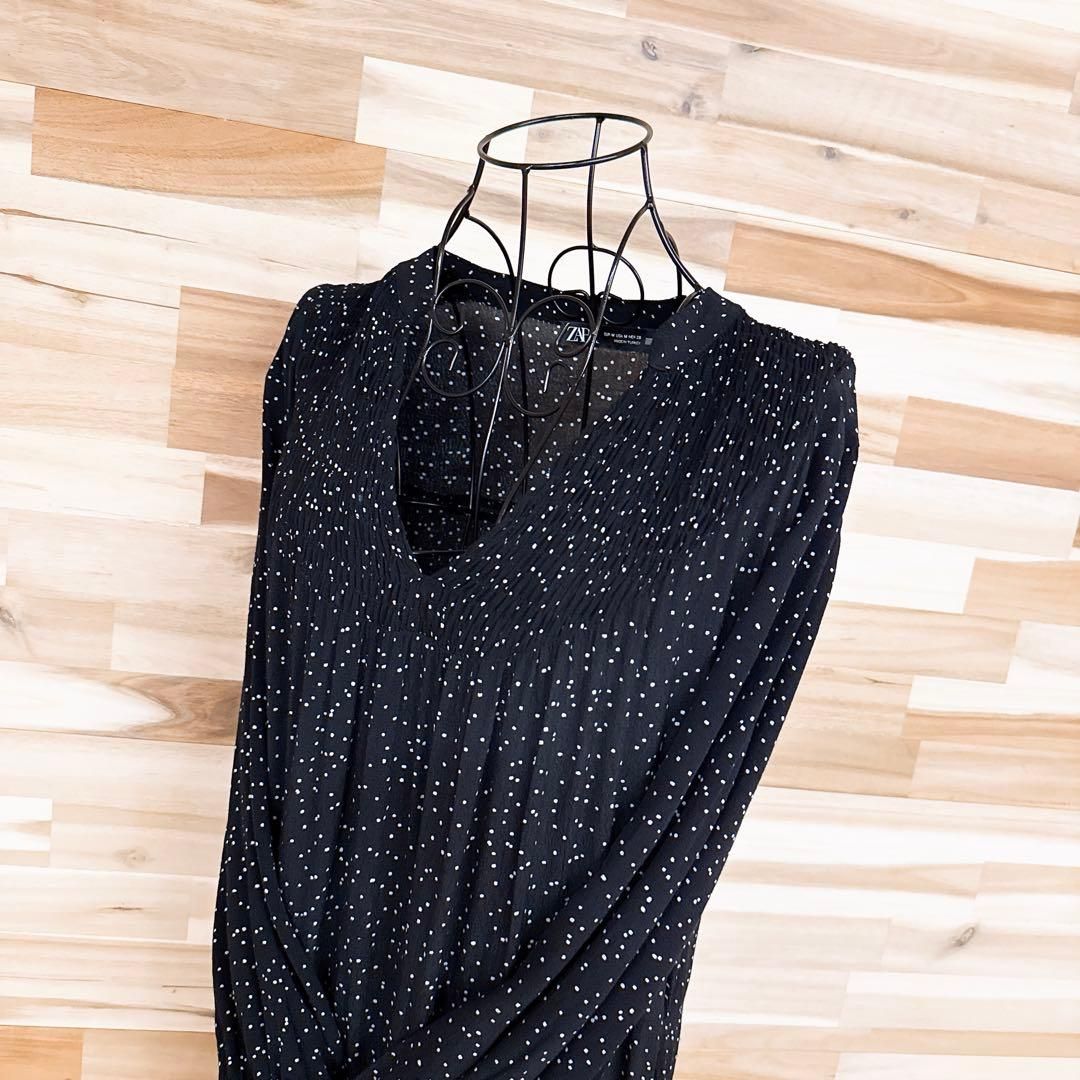 * Vネック / フィッシュテール / 水玉 *表面に僅かな凹凸のある、ちりめん調のさらりと柔らかな質感で、肌になじむような落ち感が心地よい一着。ブラックベースにちりばめられたホワイトの細かなドットが、控えめながらもリズムを感じさせるアクセントに。胸元の細やかなギャザーが立体感をプラスし、すっきりとした印象が大人オシャレなZARAのワンピースです。※LGスタイラーにて除菌リフレッシュ・スチームクリーニング済みです。