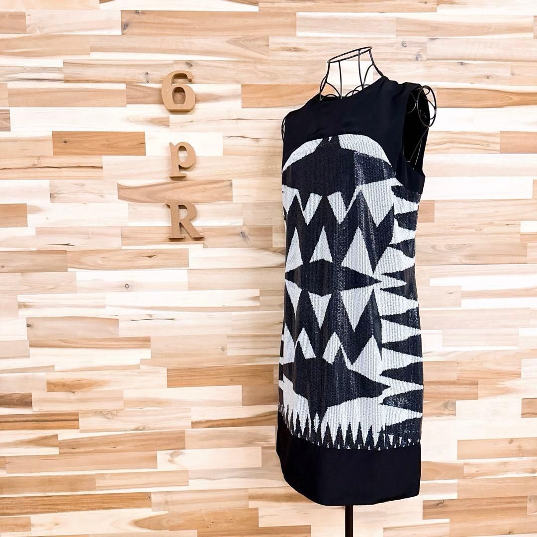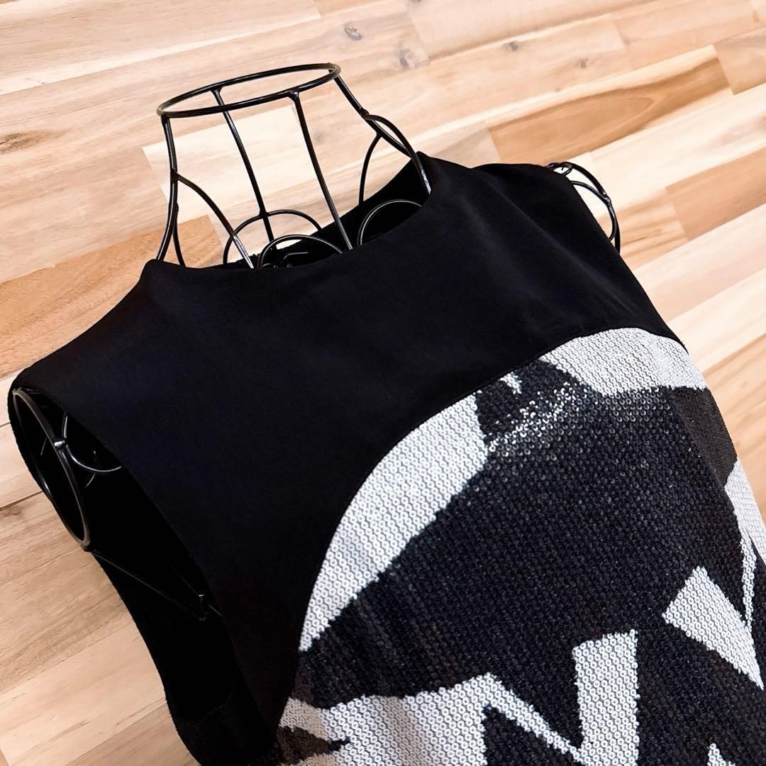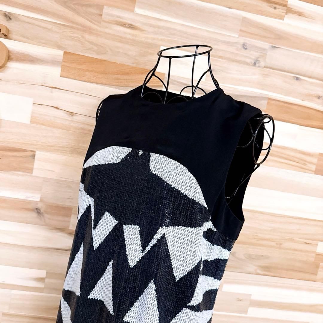やや薄手の生地にスパンコールの煌めきが重なり、角度によってさりげなく輝く存在感を演出。深みのあるブラックをベースに、ホワイトのジオメトリック柄がシャープに浮かび上がり、モードな雰囲気をプラス。裾とネック部分の異素材切り替えが全体を引き締めるアクセントに。一枚で洗練された印象を叶えてくれるZARAのワンピースです。同じデザインを数多く作らないブランドのため、出回る数が少ないお品です。※LGスタイラーにて除菌リフレッシュ・スチームクリーニング済みです。