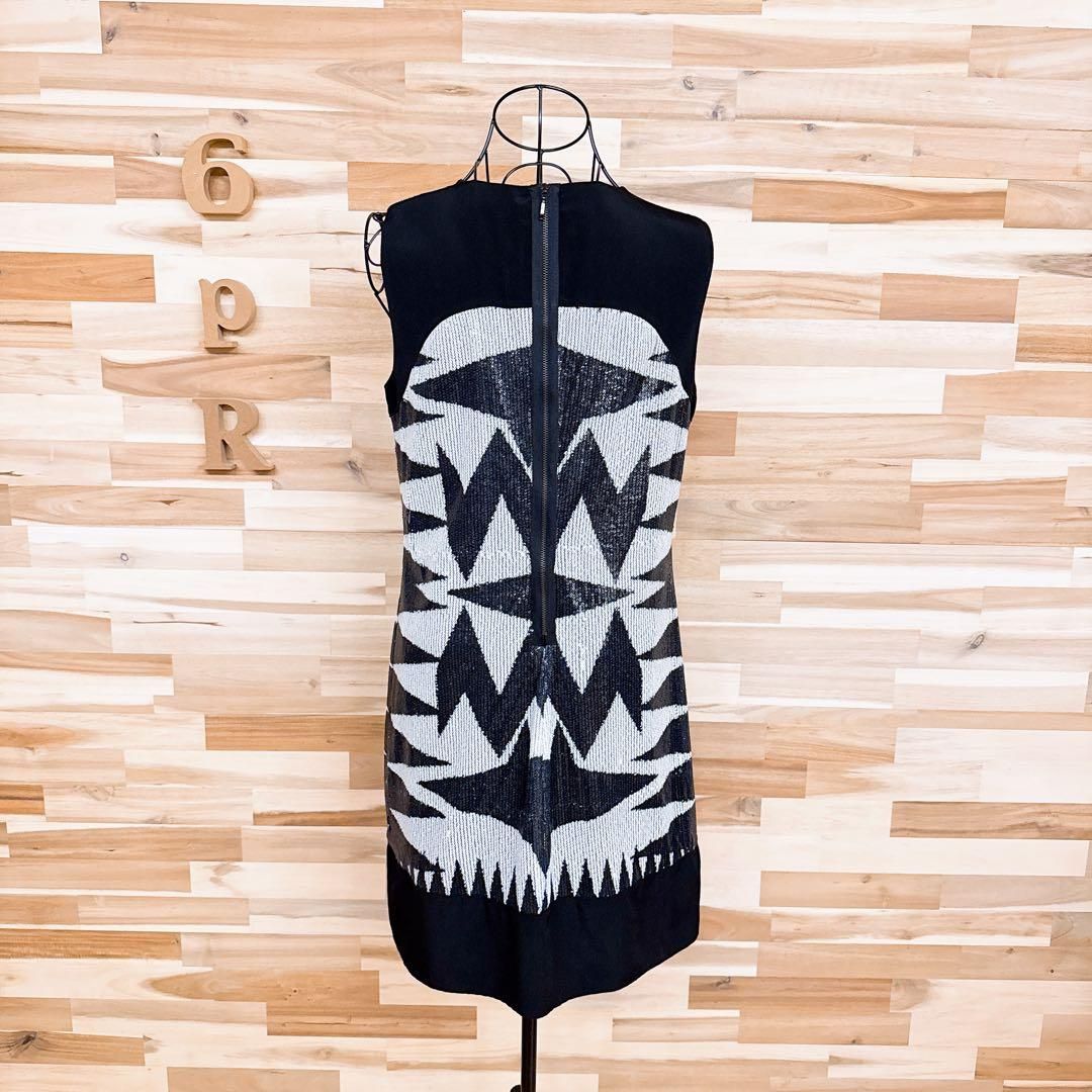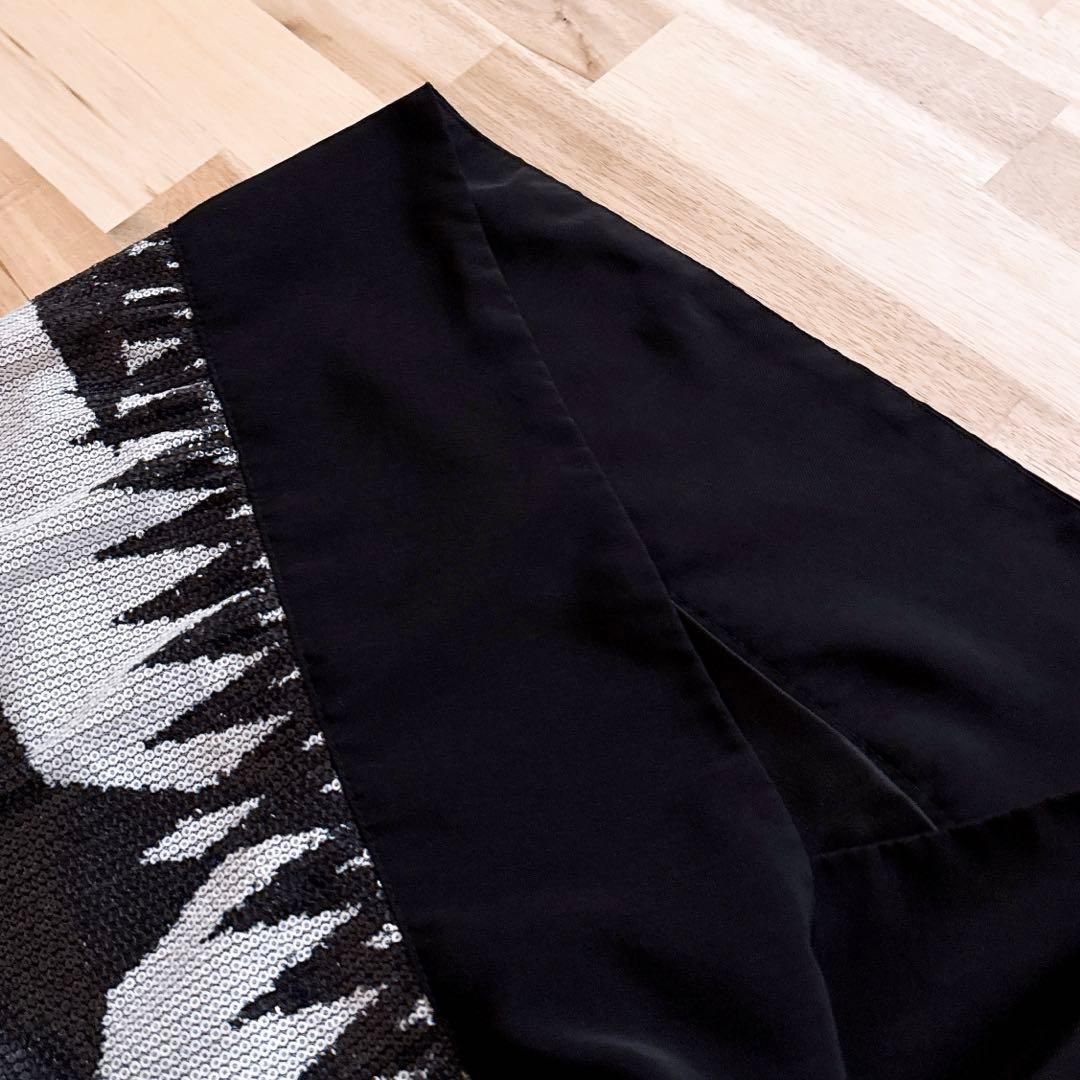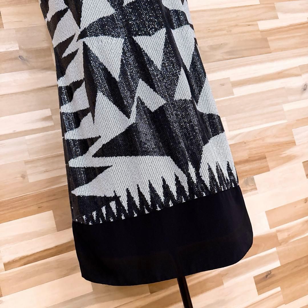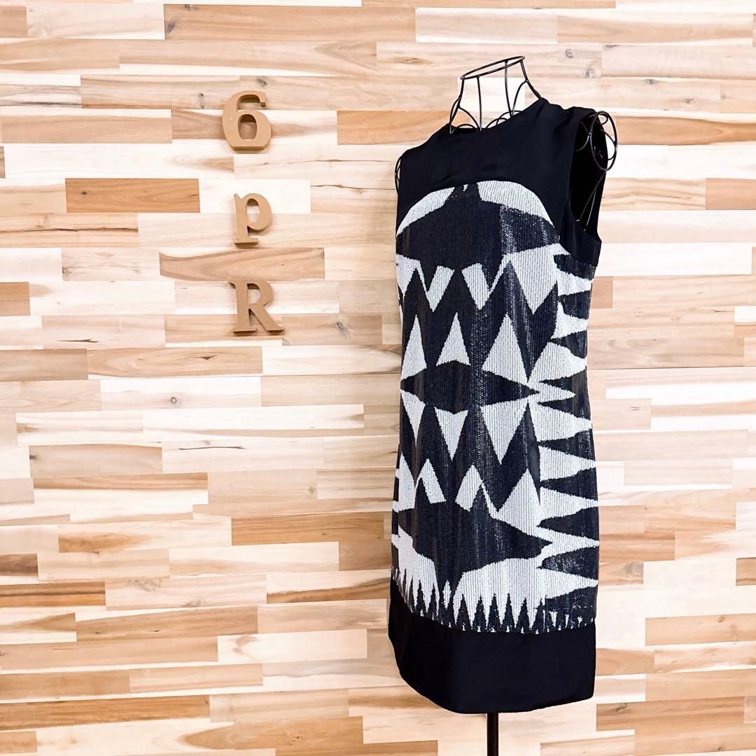 やや薄手の生地にスパンコールの煌めきが重なり、角度によってさりげなく輝く存在感を演出。深みのあるブラックをベースに、ホワイトのジオメトリック柄がシャープに浮かび上がり、モードな雰囲気をプラス。裾とネック部分の異素材切り替えが全体を引き締めるアクセントに。一枚で洗練された印象を叶えてくれるZARAのワンピースです。同じデザインを数多く作らないブランドのため、出回る数が少ないお品です。※LGスタイラーにて除菌リフレッシュ・スチームクリーニング済みです。