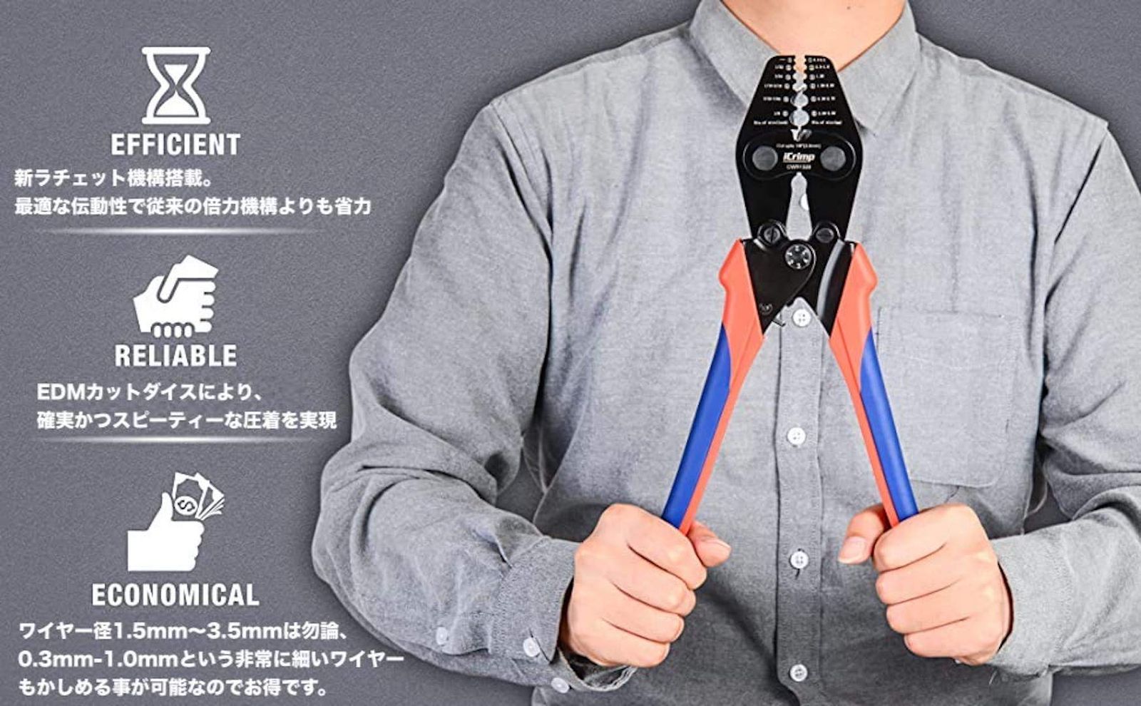 ※新品の場合、圧着工具(新品)のハンドル動作(リングやピン)がかたいことは正常です。しばらくお使いいただくことで少しずつなじみ、軽くなります。