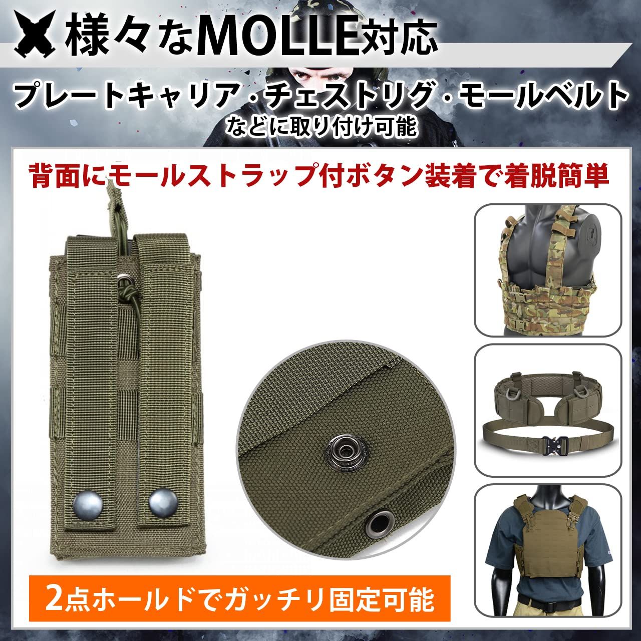 ?【MOLLE対応】背面にモールシステムを採用しておりプレートキャリア、チェストリグなどに取り付け可能。様々なカスタマイズをお楽しみいただけます。
