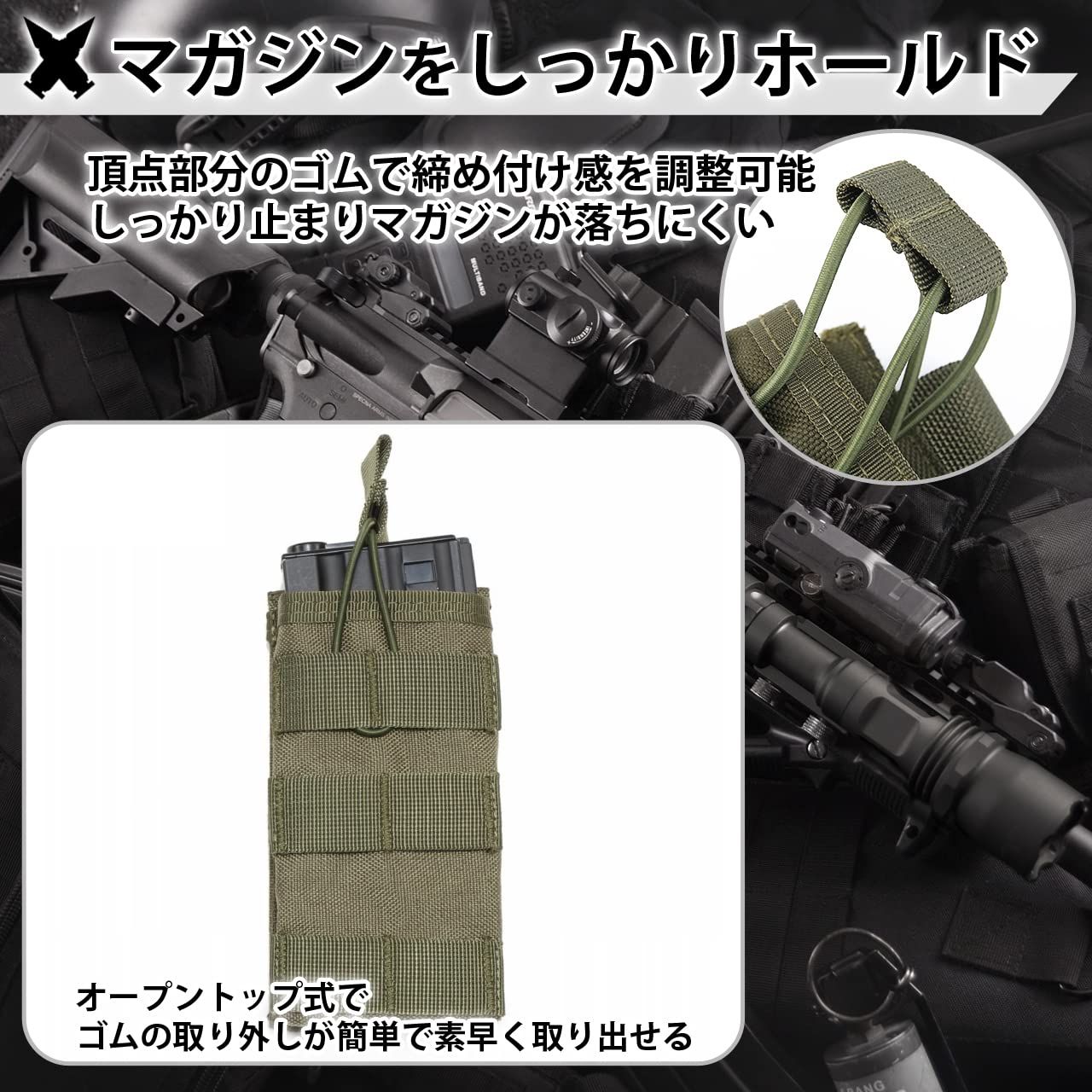 ?【オープントップ】オープントップはマガジンを素早く取り出せる事が出来、また頂点のゴムで締め具合を調節出来るのでしっかり止まりマガジンが落ちにくいので安心してサバゲーを楽しめます。