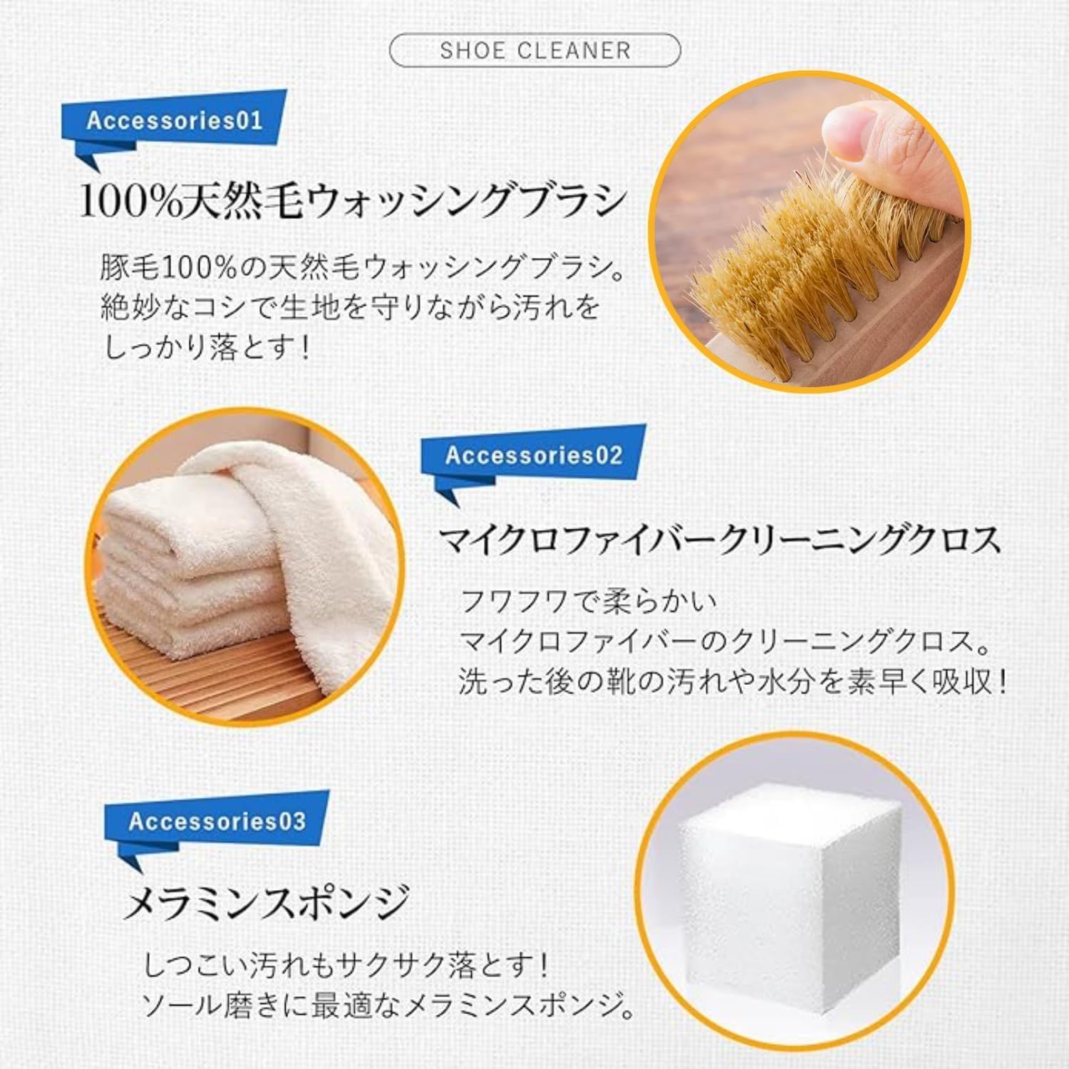 ✅【セット内容】スニーカークリーニング用シャンプー(200ml)、ブラシ、マイクロファイバークリーニングクロス、メラミンスポンジ✅【使用方法】