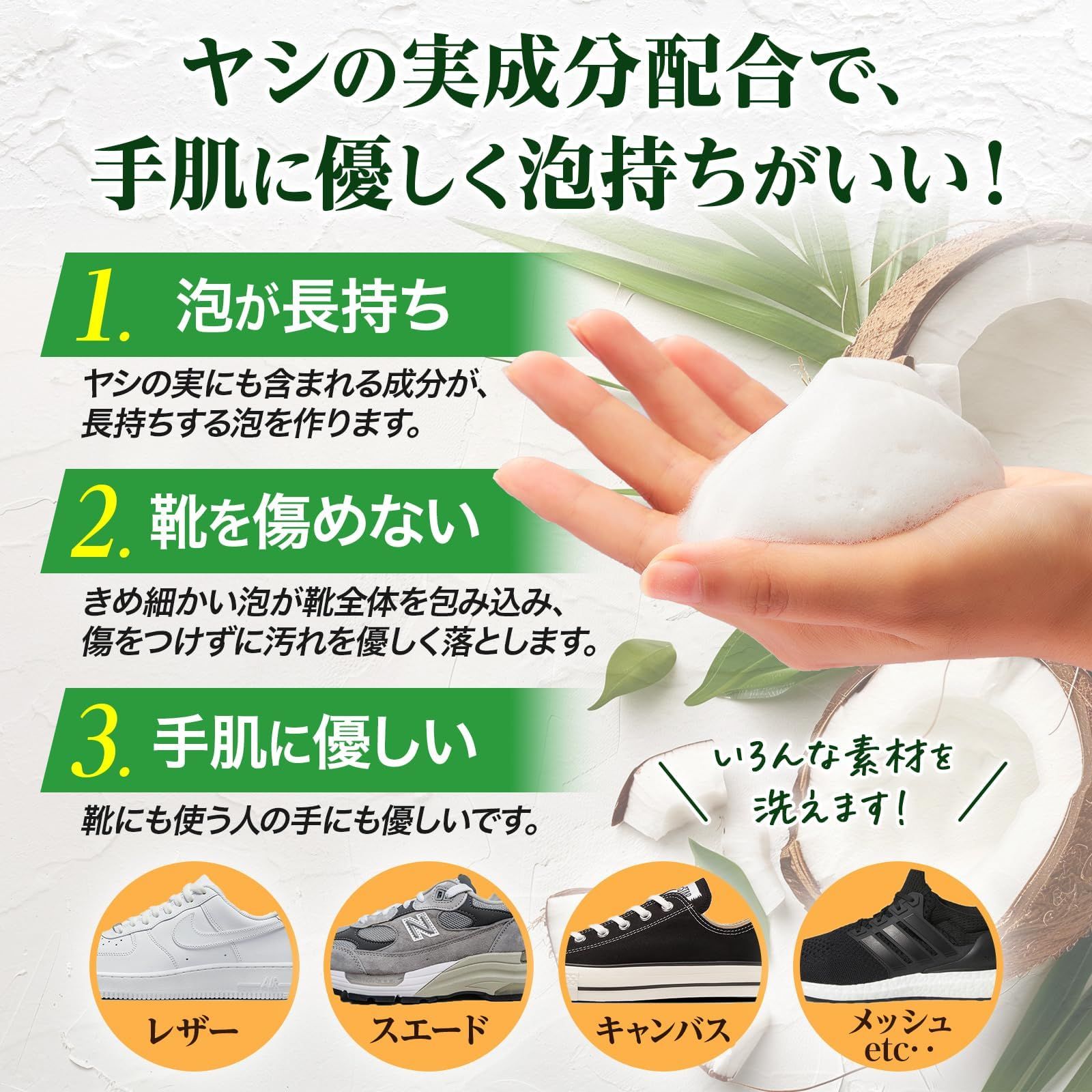 ヤシ油アルキルグルコシド、アルキルベンゼンスルホン酸塩、ポリオキシエチレンアルキルエーテル硫酸塩)、ポリアクリル酸ナトリウム、酵素、香料✅【保証内容】ご購入後30日以内であれば返品交換可能です。万が一商品に不備がございましたらカスタマーセンターまでご連絡くださいますようよろしくお願いいたします。✅【コスパ◎】スニーカークリーニングに必須の4点セットがひとつになったお得なクリーニングキット。