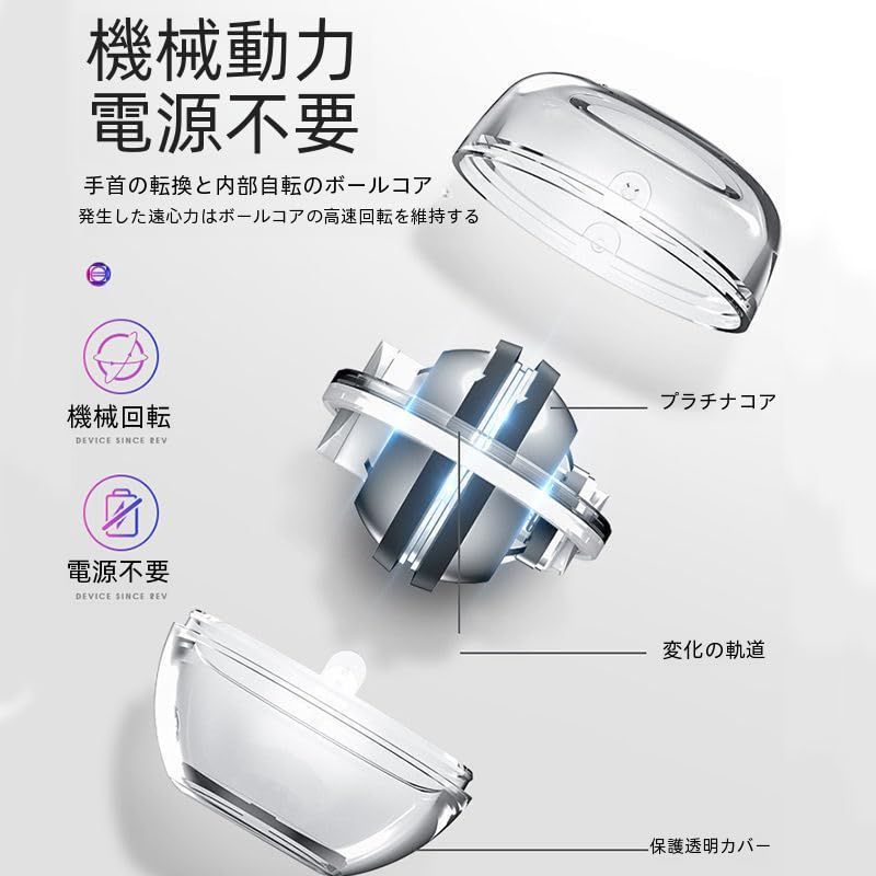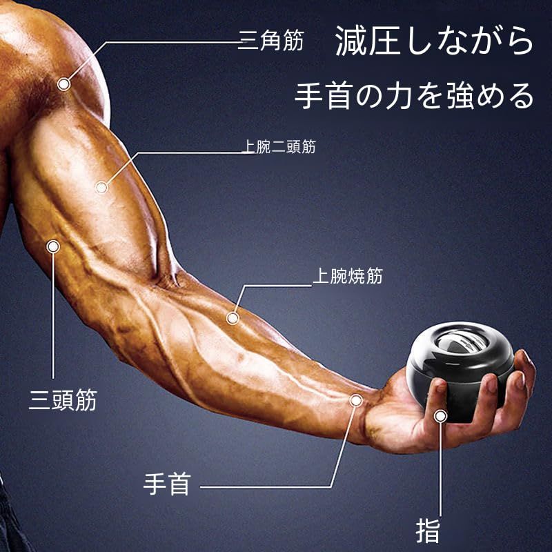 【 腕力 筋トレグッズ 】静かな回転で振動がほとんどないバランスの取れた滑らかな回転は、品質の高い物を使いたい本物志向の方や本気でトレーニングしたい方からリハビリやプレゼントなど多くの方からご購入いただいています。 収納バッグ付き 【 手首、指、腕を鍛える】回転数8000rpm は14Kg相当の負荷をかけることができます。回転数が上がれば上がるほど加える力を必要とする為、手首や腕、指の筋力増加のための運動器具として非常に有効なスナップボールです。 【ダンベルより軽く、簡単に負荷の調節が出来る】ジャイロの原理を応用し、加える力を変えることで簡単に腕にかかる負担を調節することが出来るので、ご自分に合った負荷でトレーニングが行えます。 【自宅で行える運動器具】オートスタート:ローターを親指で矢印の方向に2~3周ほど押して回し、緩めると内部のローターが自動で回転を始めます。 回転数を上昇:ローターに合わせるように手首を振り連動させます。 遠心力と慣性:更に回転数を上げるように手首を動かします。スポーツカーのような加速音が聞こえてきたらトレーニング開始です! 【手軽に持ち運びできます】重量はわずか254g程度で、大きさも野球のボールほど。持ち運びも楽なので重たいダンベルなどの器具を使用するより、はるかに安全で楽しく効率よく鍛える事が出来ます。