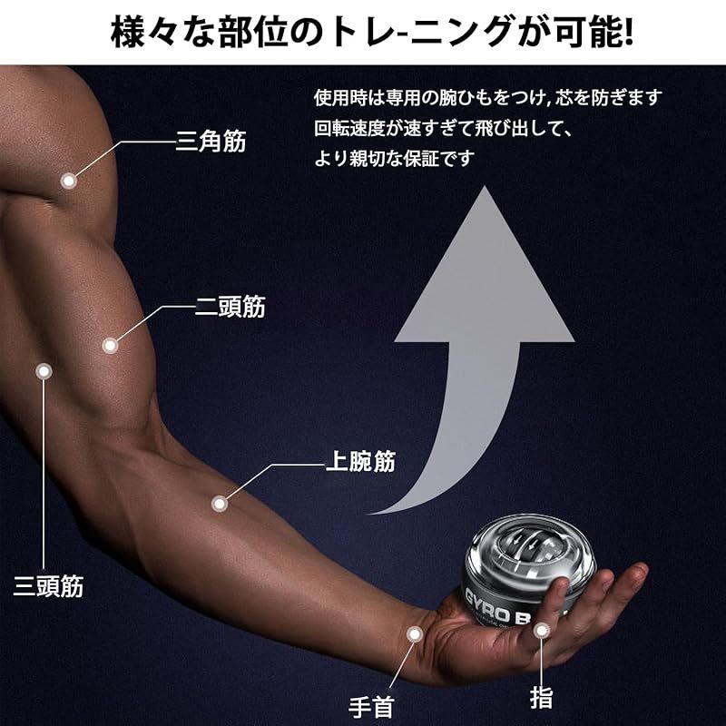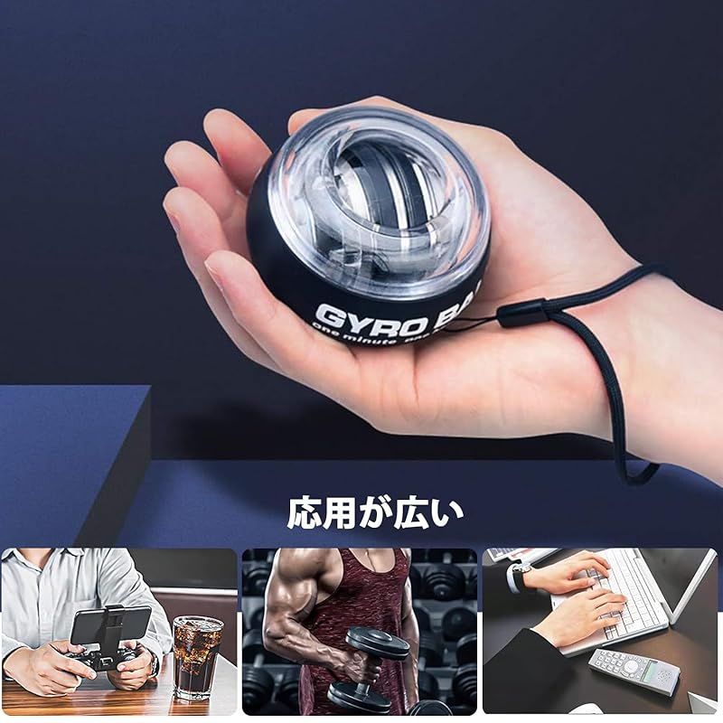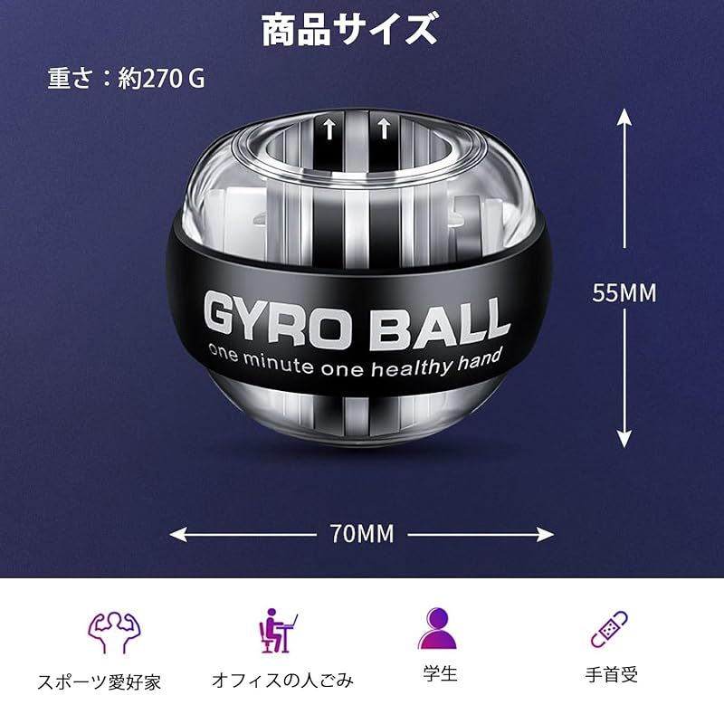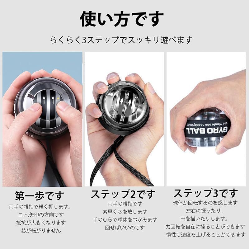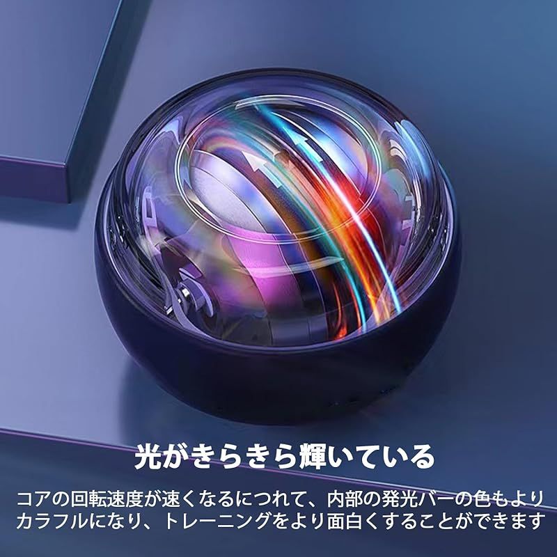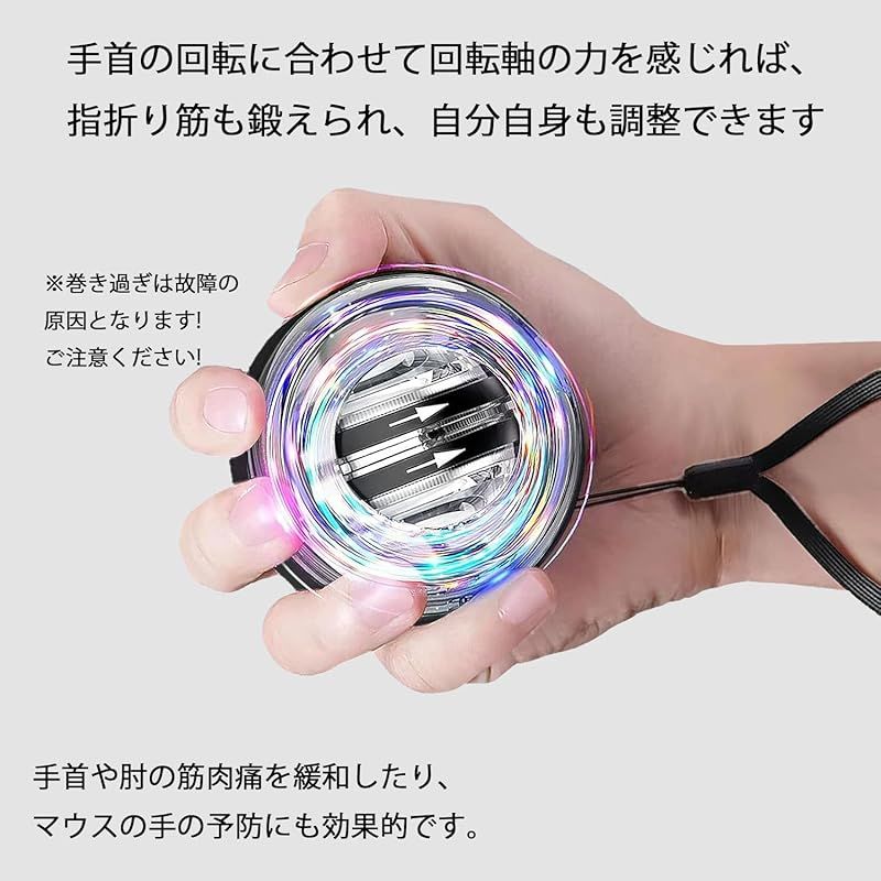 制品情?:便利なオートスタート機能:オートスタート機能により、回転の開始はローターを一方向に回転させた後に手をはなすだけ!従来品のようにひもをローターに巻き付ける時間と手間がかからず、ストレスフリーな設計となっています。回転数で変化するLED発光機能:回転数ごとに発光色が変化するLEDライト機能を搭載!色の変化により、ボールがどのくらいの回転数になっているか一目で把握できます。何色まで光らせられるか、チャレンジ要素もあって楽しくトレーニングが行えます。コンパクトでパワフルな筋トレ器具:高速のジャイロ回転ローターで遠心力をつくり、ボールを掴んでコントロールすることで手首、前腕、上腕部の筋肉や握力を鍛えられる便利なトレーニング器具です。ジャイロの原理を応用し、加える力を変えることで簡単に腕にかかる負担を調節することが出来るので、ご自分に合った負荷でトレーニングが行えます。製品仕様:サイズ:7×7×5.5cm重量:270g材質:シリカゲル+亜鉛合金カラー:ブラック製品パッケージ:1*パワーボール1*収納ボックス