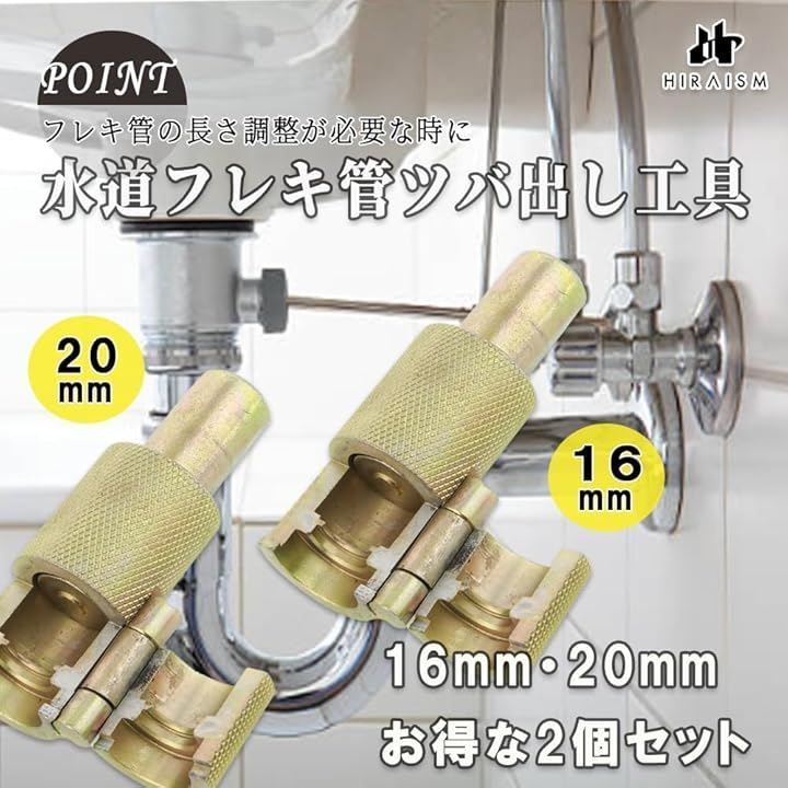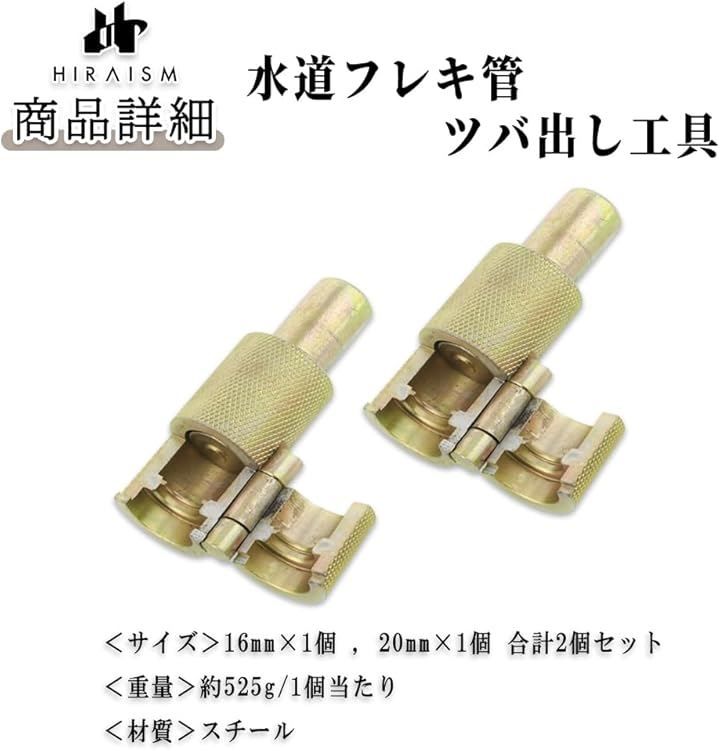 「商品内容」水道フレキ管ツバ出し工具 <サイズ>16mmx1個 , 20mmx1個 合計2個セット <重量>約525g/1個当たり <材質>スチール
