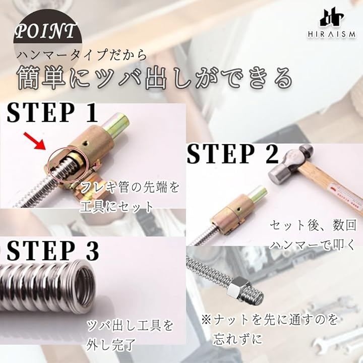 「簡単にツバ出し」フレキの先端の三山をセットし、上から数回ハンマーで叩くだけで綺麗につば出しができます。
