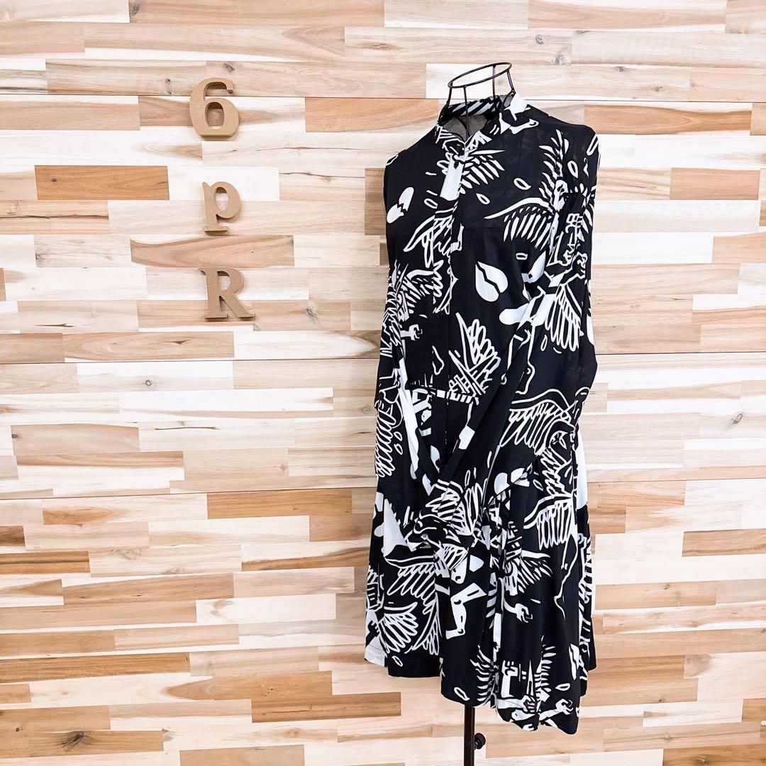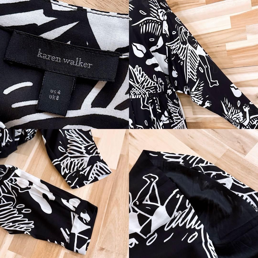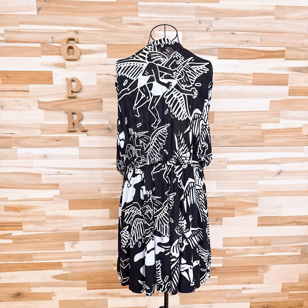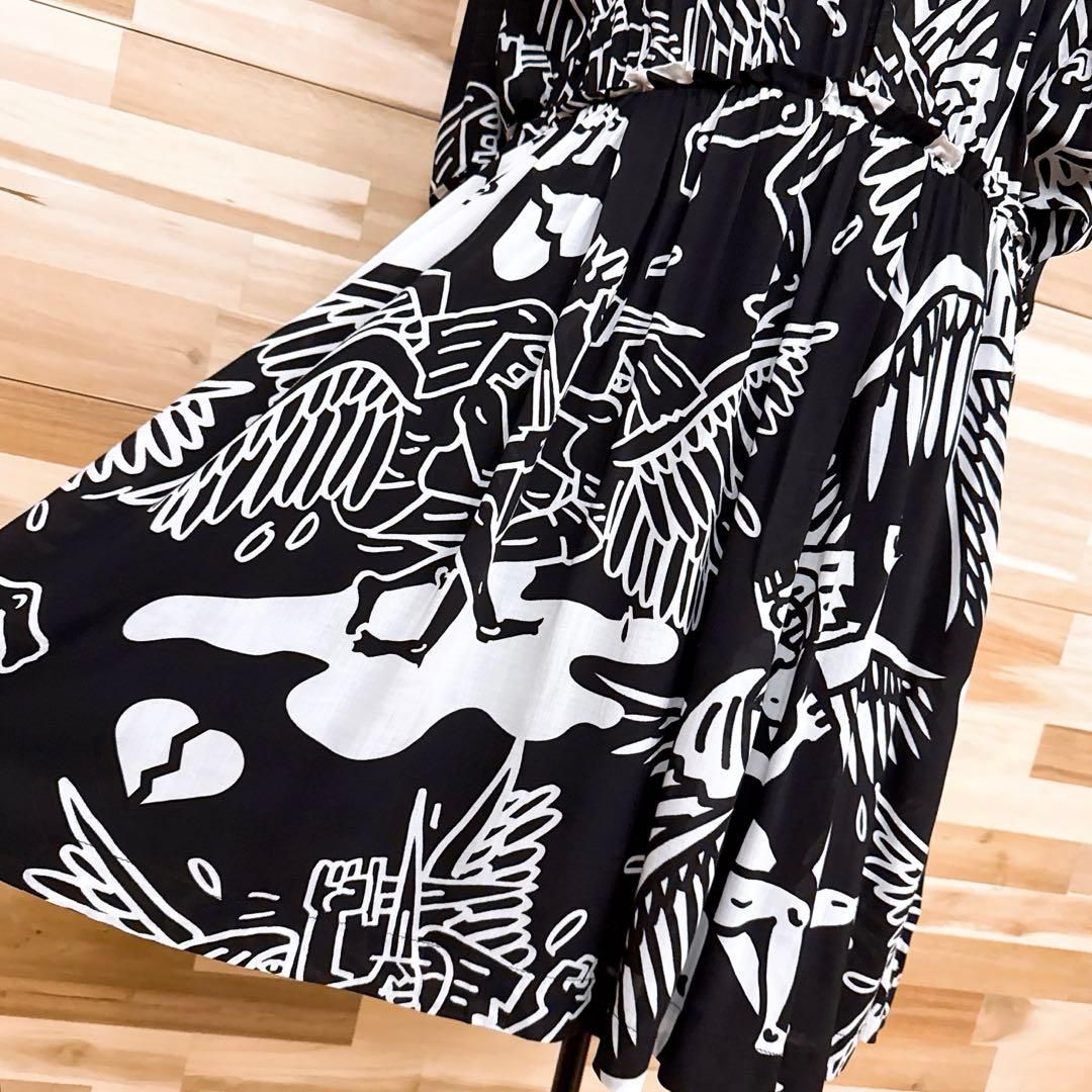 薄手で柔らかく、しっとりとした肌触りのレーヨン素材が、優雅なドレープを生み出すデザイン。ブラック×ホワイトの大胆なアートプリントが、視線を惹きつける存在感を放ち、サイドから後ろにかけて施されたたっぷりのギャザーが、歩くたびに美しい揺れを演出してくれるKAREN WALKERのワンピースです。※LGスタイラーにて除菌リフレッシュ・スチームクリーニング済みです。