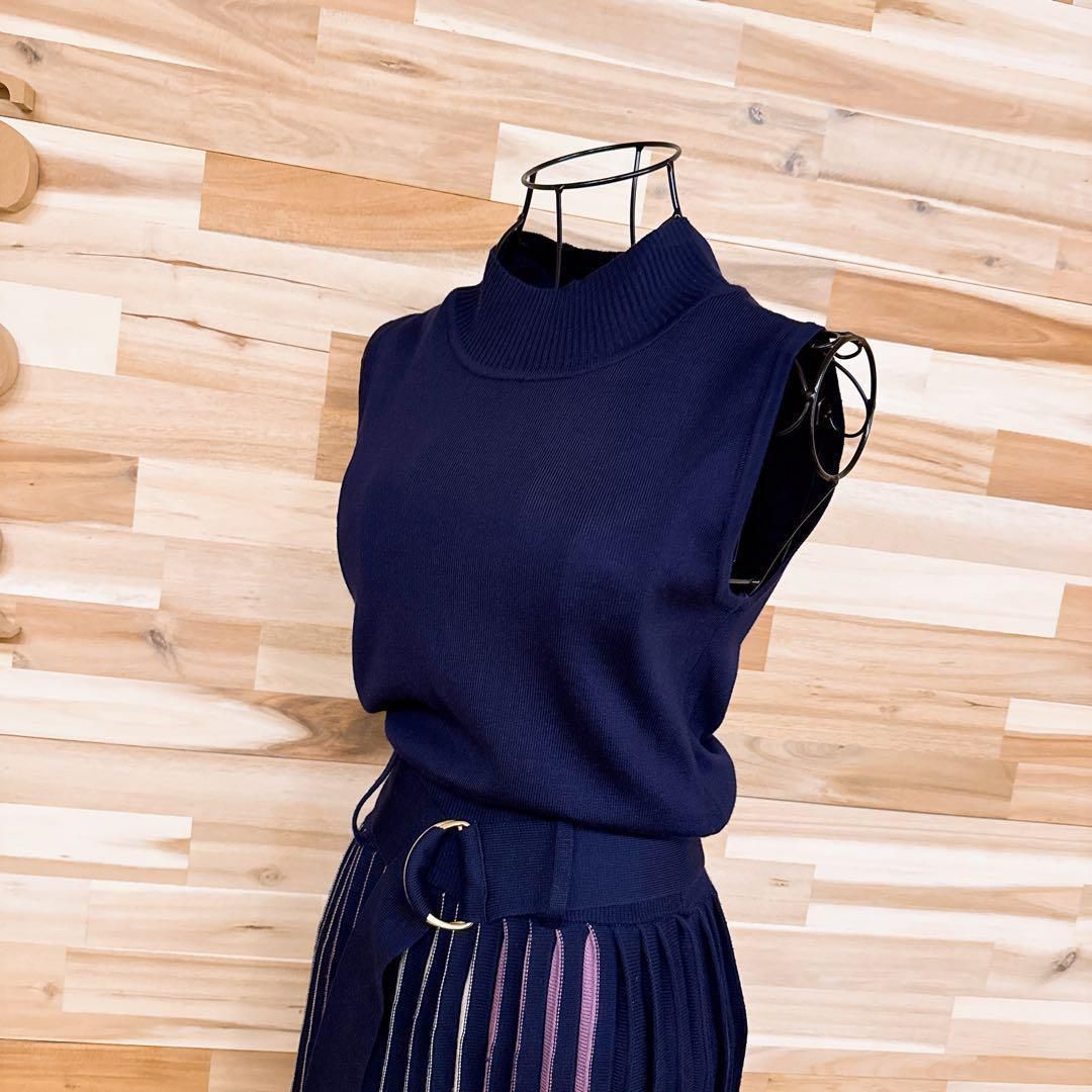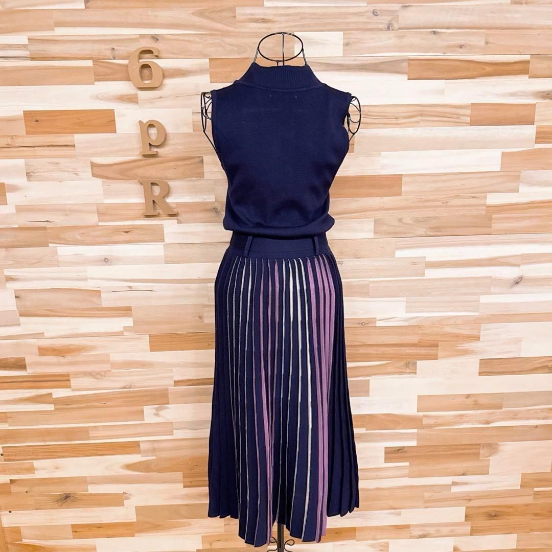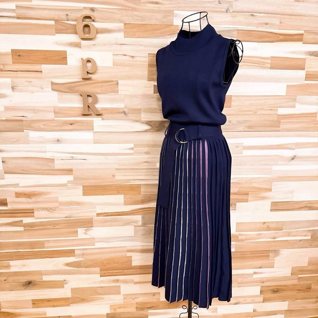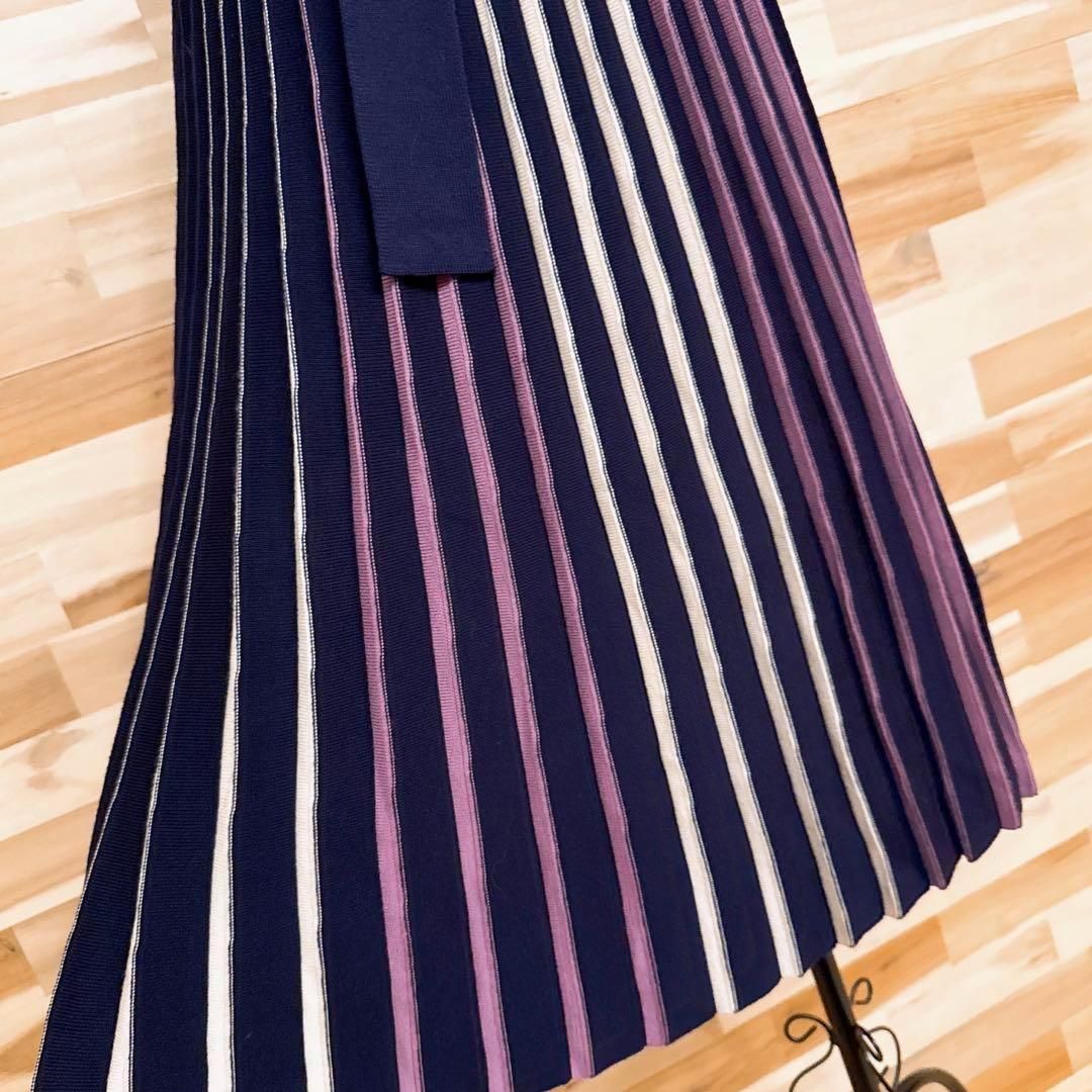 レーヨンがブレンドされた滑らかなニット素材が肌に優しく馴染み、落ち着きのあるネイビーが全体を上品にまとめる一着。ストライプ調に走るラベンダーとアイボリーのプリーツスカートが軽やかさを添え、ウエストのリングベルトで引き締めることで縦長効果が生まれ、女性らしいシルエットを際立たせてくれるREDYAZELのワンピースです。※LGスタイラーにて除菌リフレッシュ・スチームクリーニング済みです。