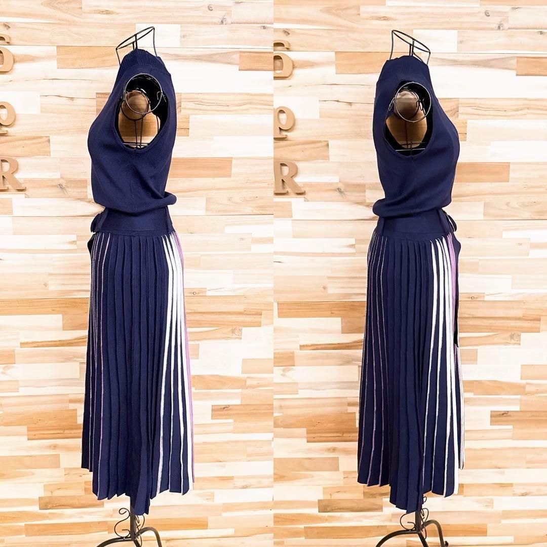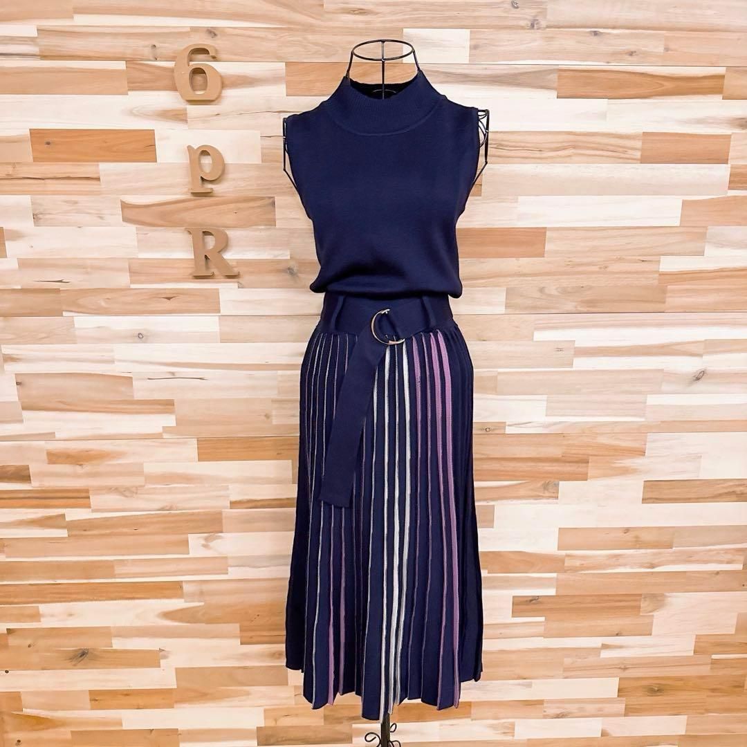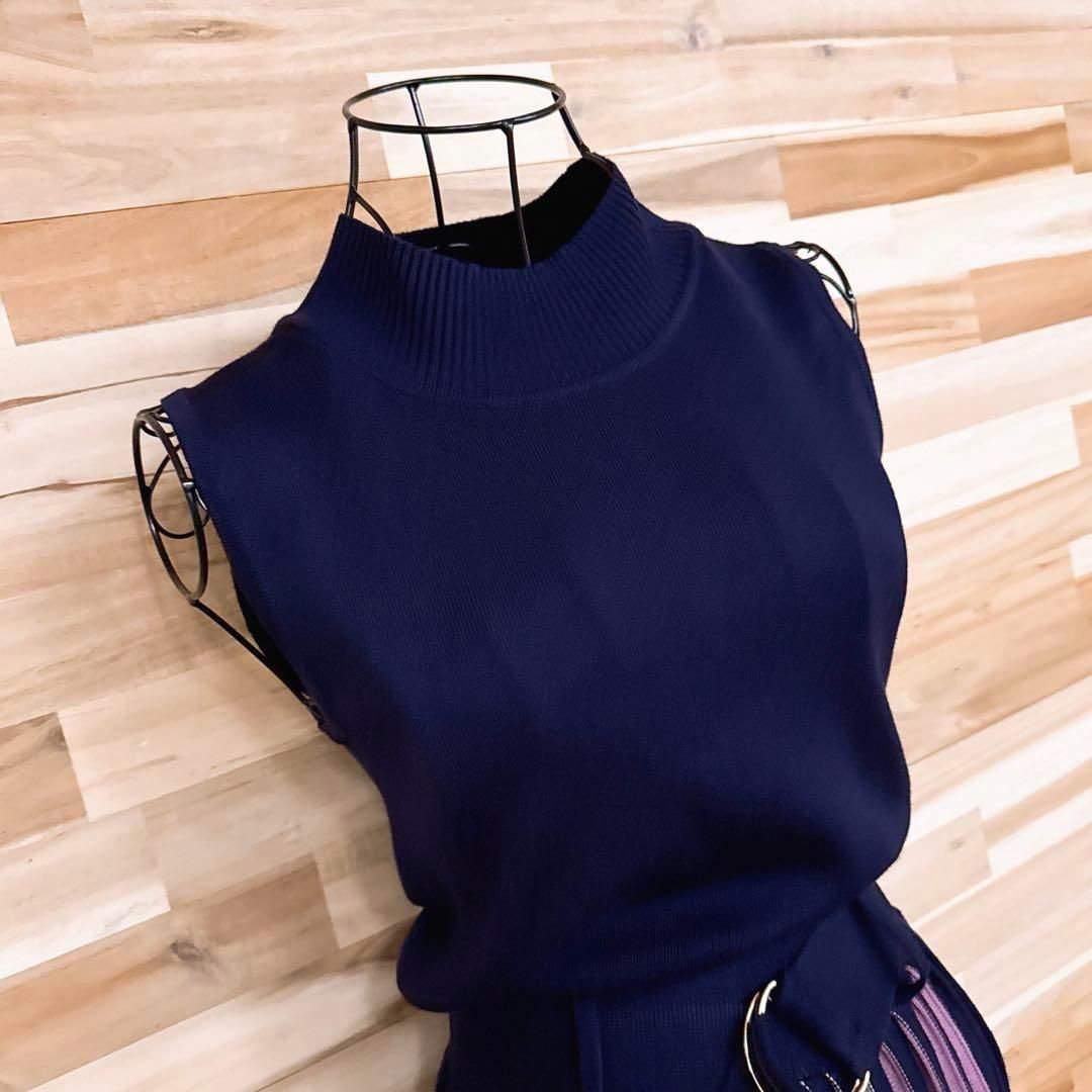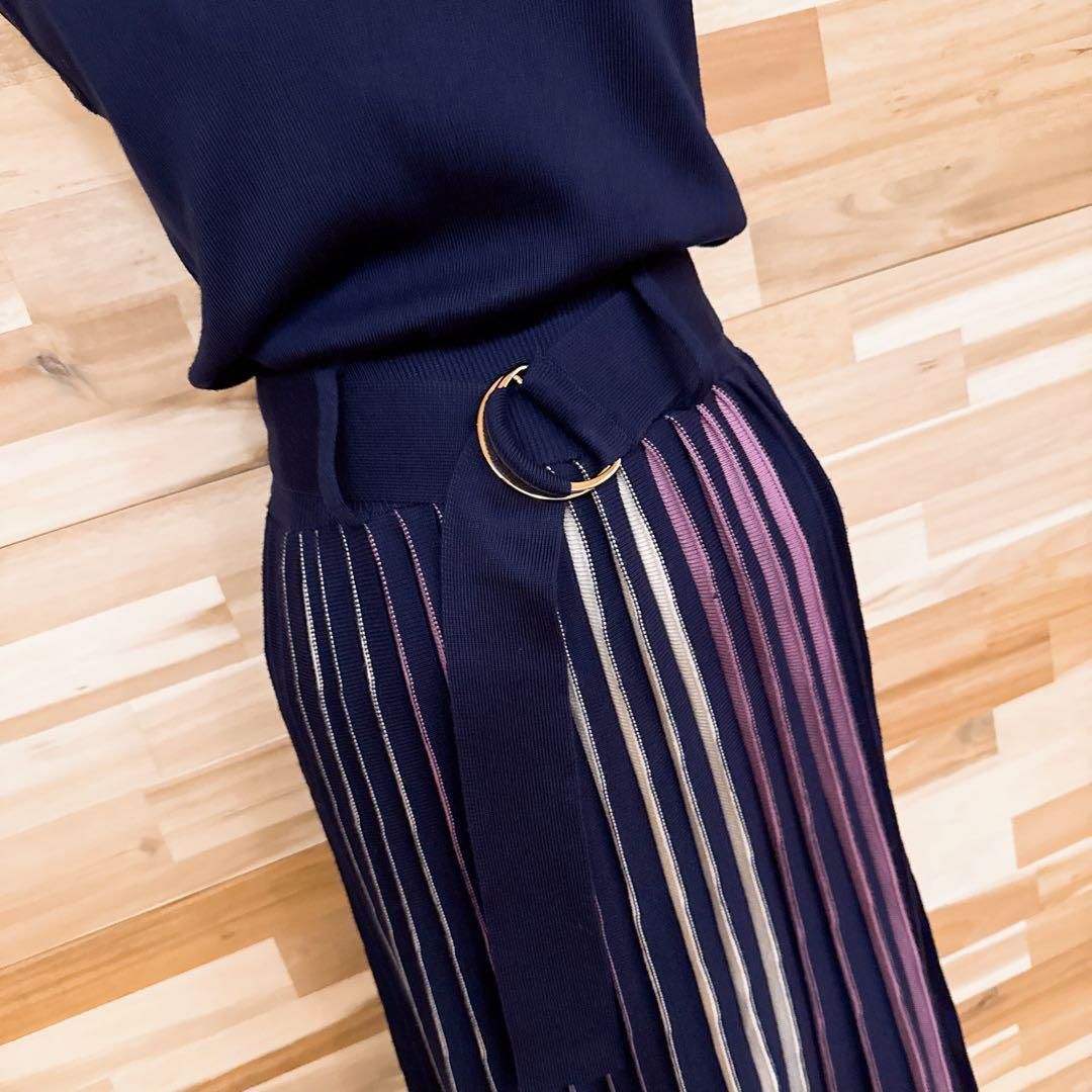 レーヨンがブレンドされた滑らかなニット素材が肌に優しく馴染み、落ち着きのあるネイビーが全体を上品にまとめる一着。ストライプ調に走るラベンダーとアイボリーのプリーツスカートが軽やかさを添え、ウエストのリングベルトで引き締めることで縦長効果が生まれ、女性らしいシルエットを際立たせてくれるREDYAZELのワンピースです。※LGスタイラーにて除菌リフレッシュ・スチームクリーニング済みです。
