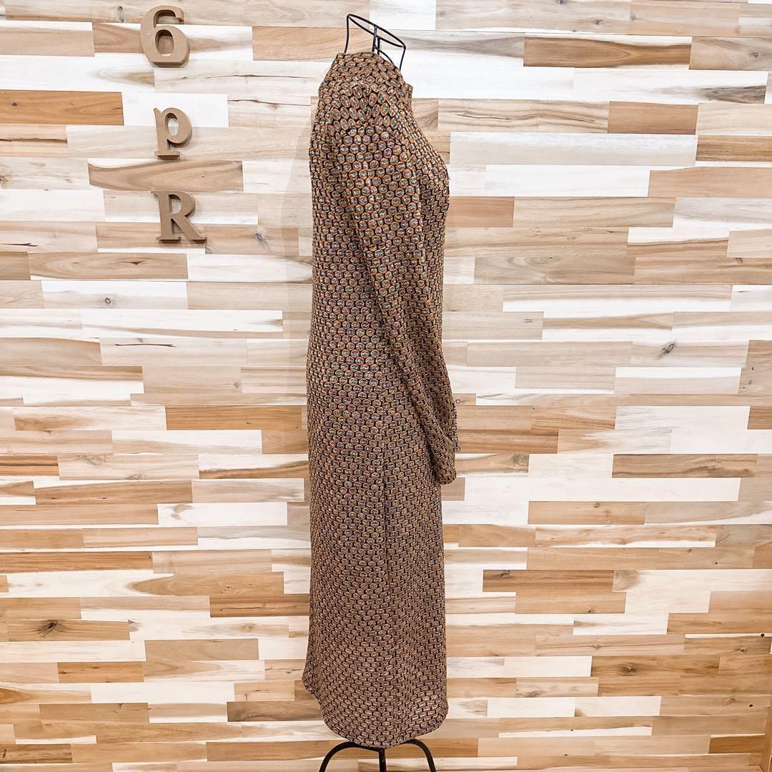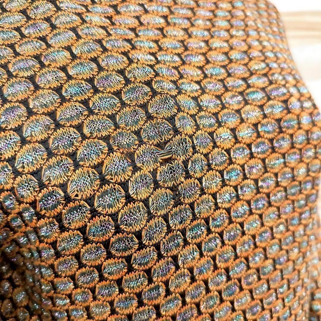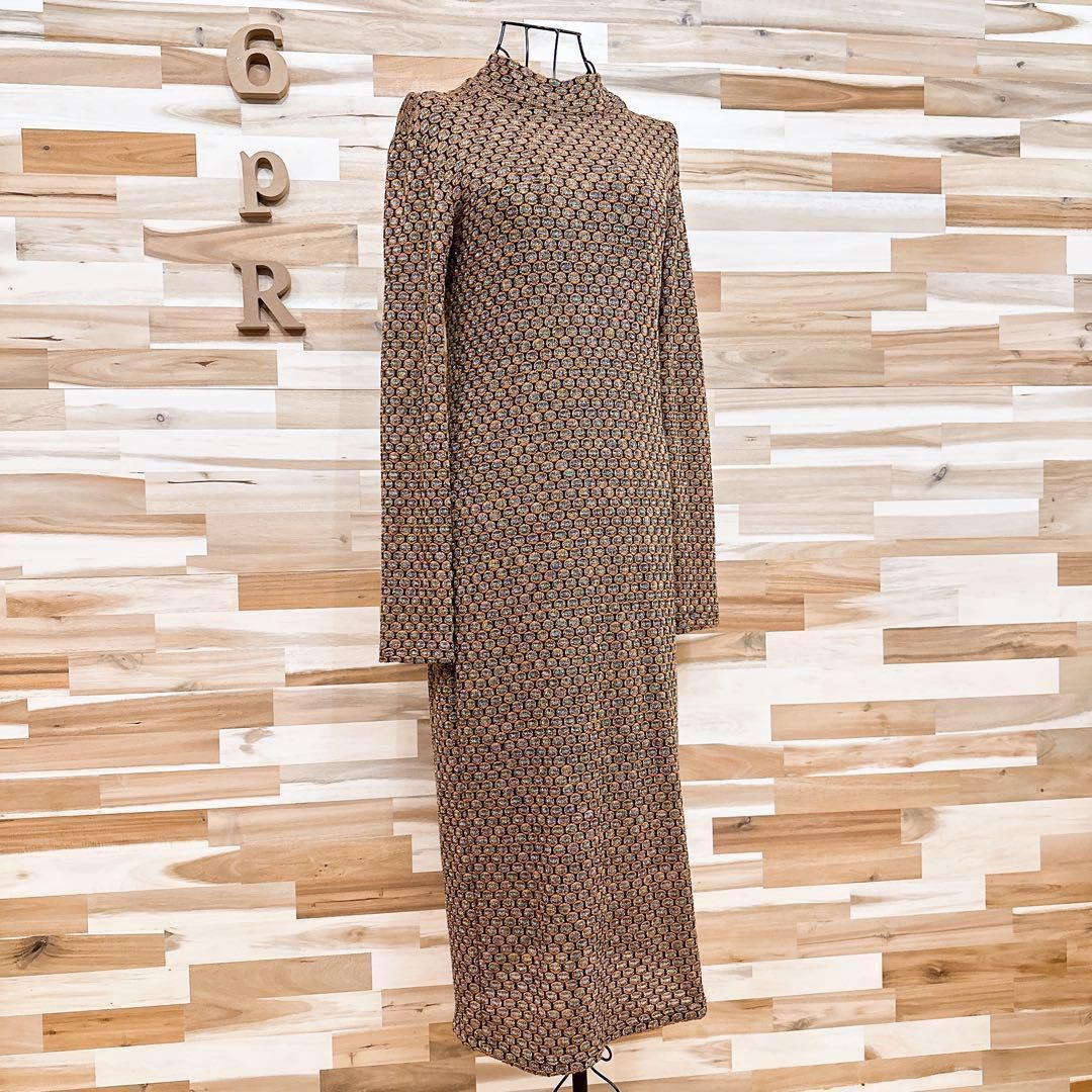 オレンジと黒の糸が織りなす編み込みに虹色のメタル糸の輝きが加わり、動くたびに光を反射して奥行きのある表情を生み出す上質な素材感。身体のラインに程良く沿うすっきりとしたロングシルエットが女性らしさを際立たせつつ、立ち上がりのあるネックデザインがエレガントな雰囲気を添えてくれるZARAのワンピースです。※LGスタイラーにて除菌リフレッシュ・スチームクリーニング済みです。