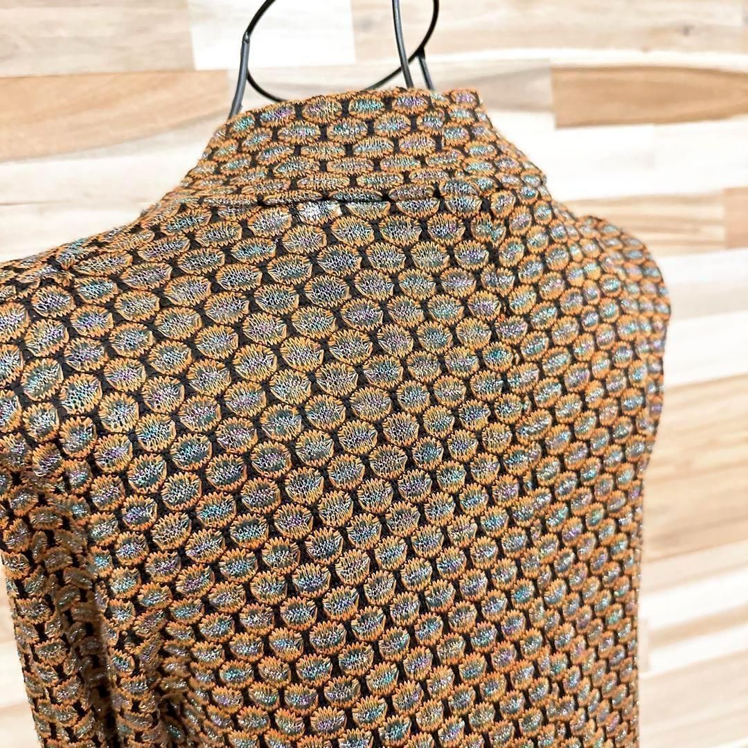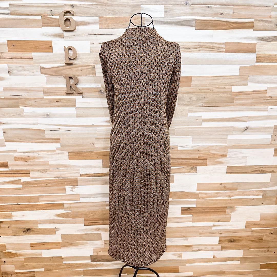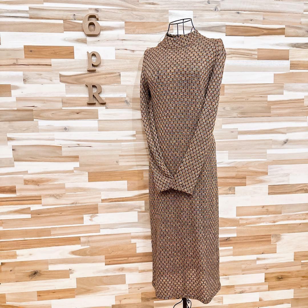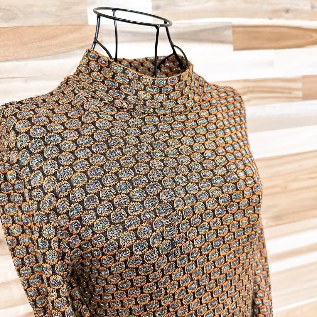 オレンジと黒の糸が織りなす編み込みに虹色のメタル糸の輝きが加わり、動くたびに光を反射して奥行きのある表情を生み出す上質な素材感。身体のラインに程良く沿うすっきりとしたロングシルエットが女性らしさを際立たせつつ、立ち上がりのあるネックデザインがエレガントな雰囲気を添えてくれるZARAのワンピースです。※LGスタイラーにて除菌リフレッシュ・スチームクリーニング済みです。