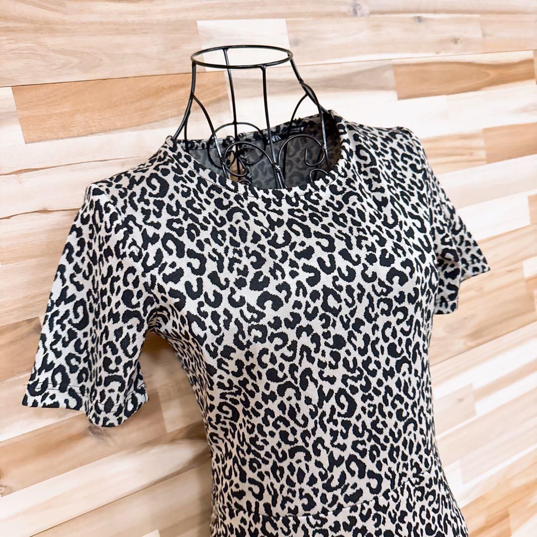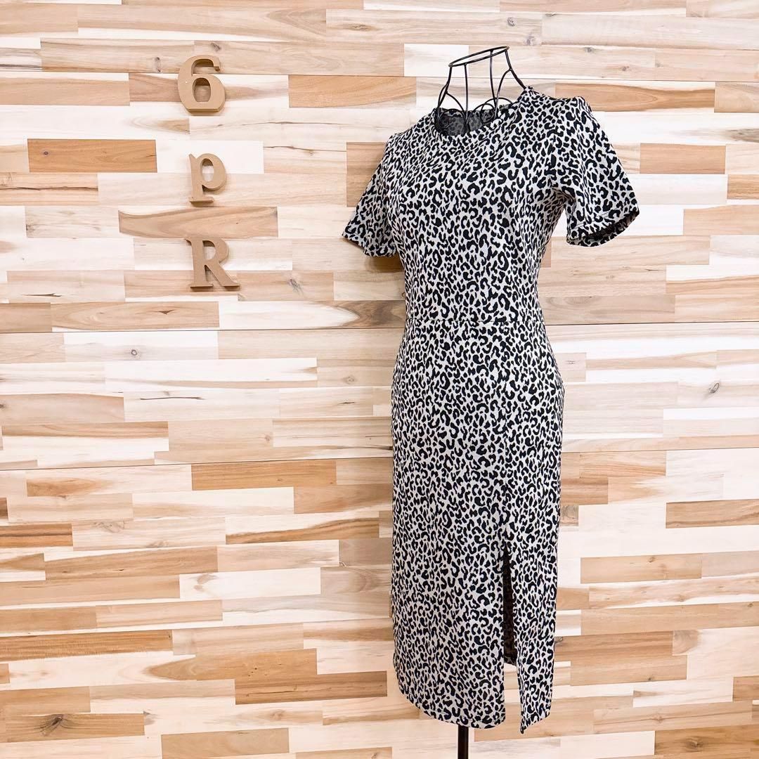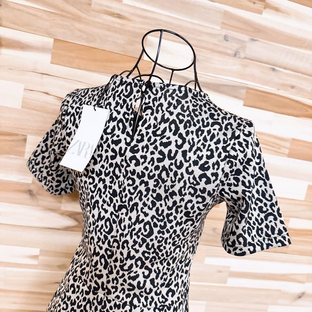 コットンがブレンドされたやや薄手のニットのような肌触りで程良いフィット感が女性らしさを引き立てるデザイン。ブラックをベースにベージュのアニマル柄がリズムよく並び、視線を惹きつけるアクセント。サイドスリットが軽やかな抜け感を生み、シンプルながらも印象的な存在感を放つZARAのワンピースです。