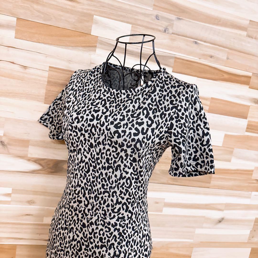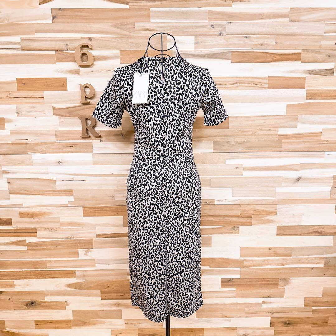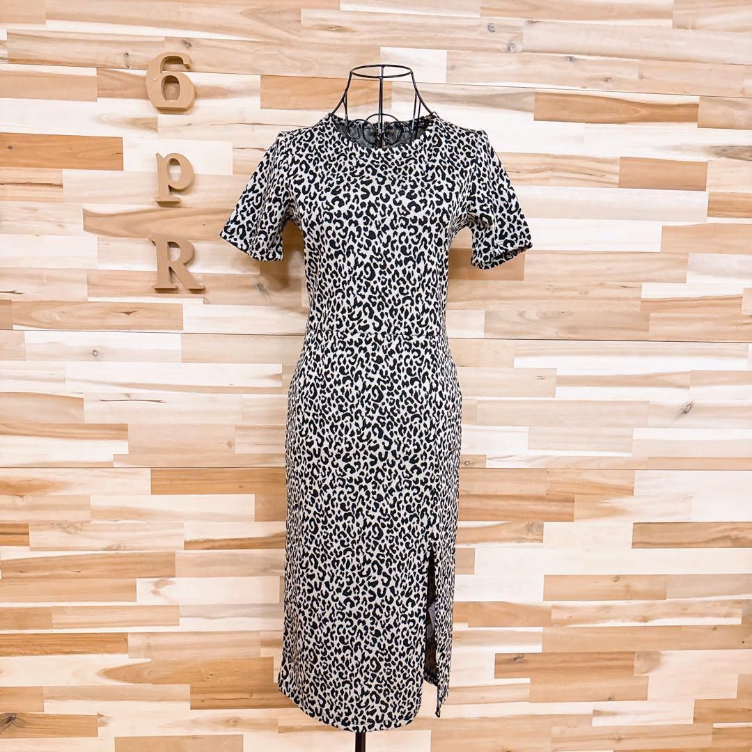 コットンがブレンドされたやや薄手のニットのような肌触りで程良いフィット感が女性らしさを引き立てるデザイン。ブラックをベースにベージュのアニマル柄がリズムよく並び、視線を惹きつけるアクセント。サイドスリットが軽やかな抜け感を生み、シンプルながらも印象的な存在感を放つZARAのワンピースです。