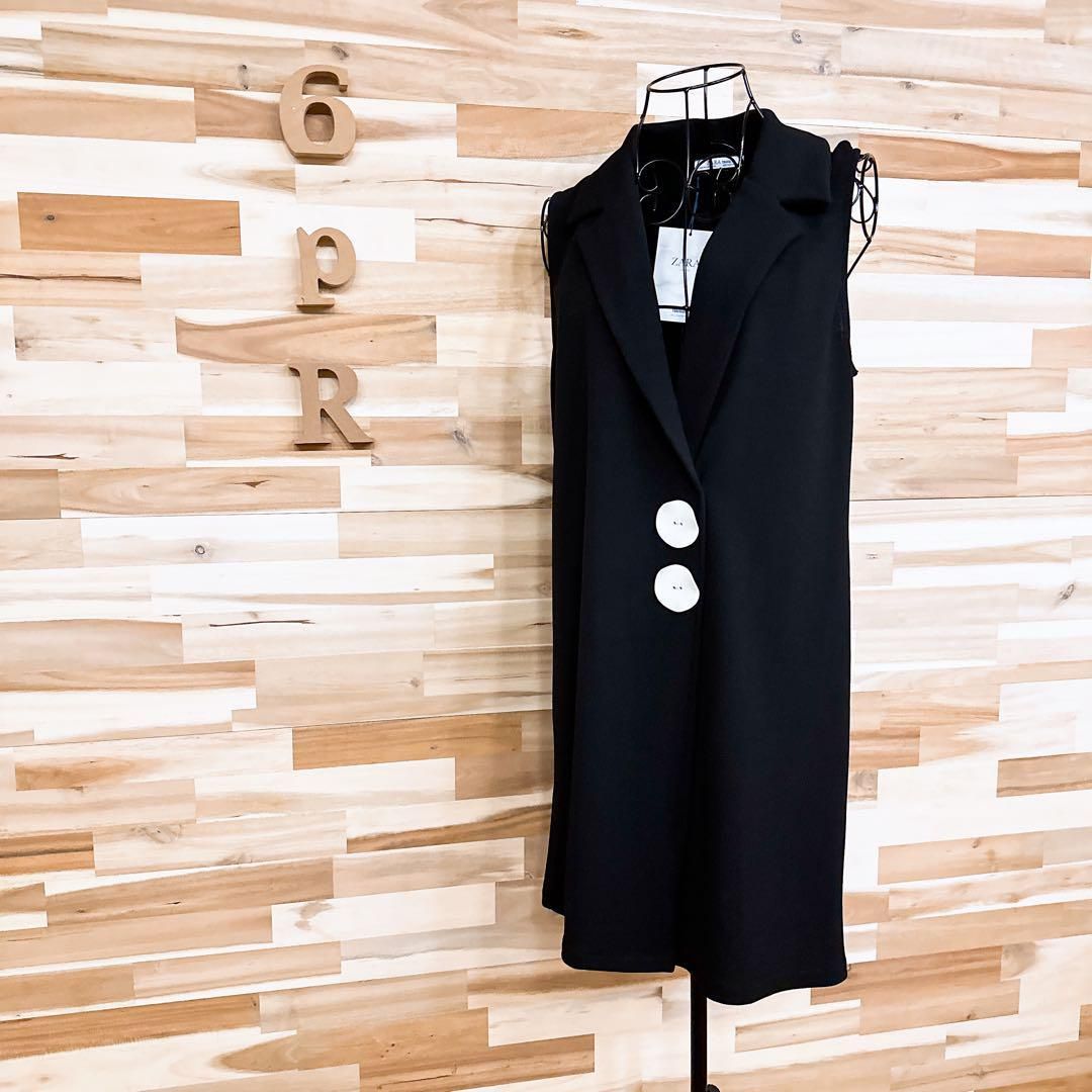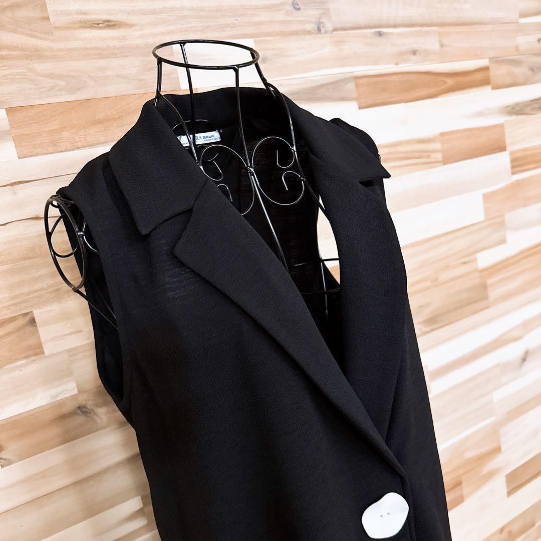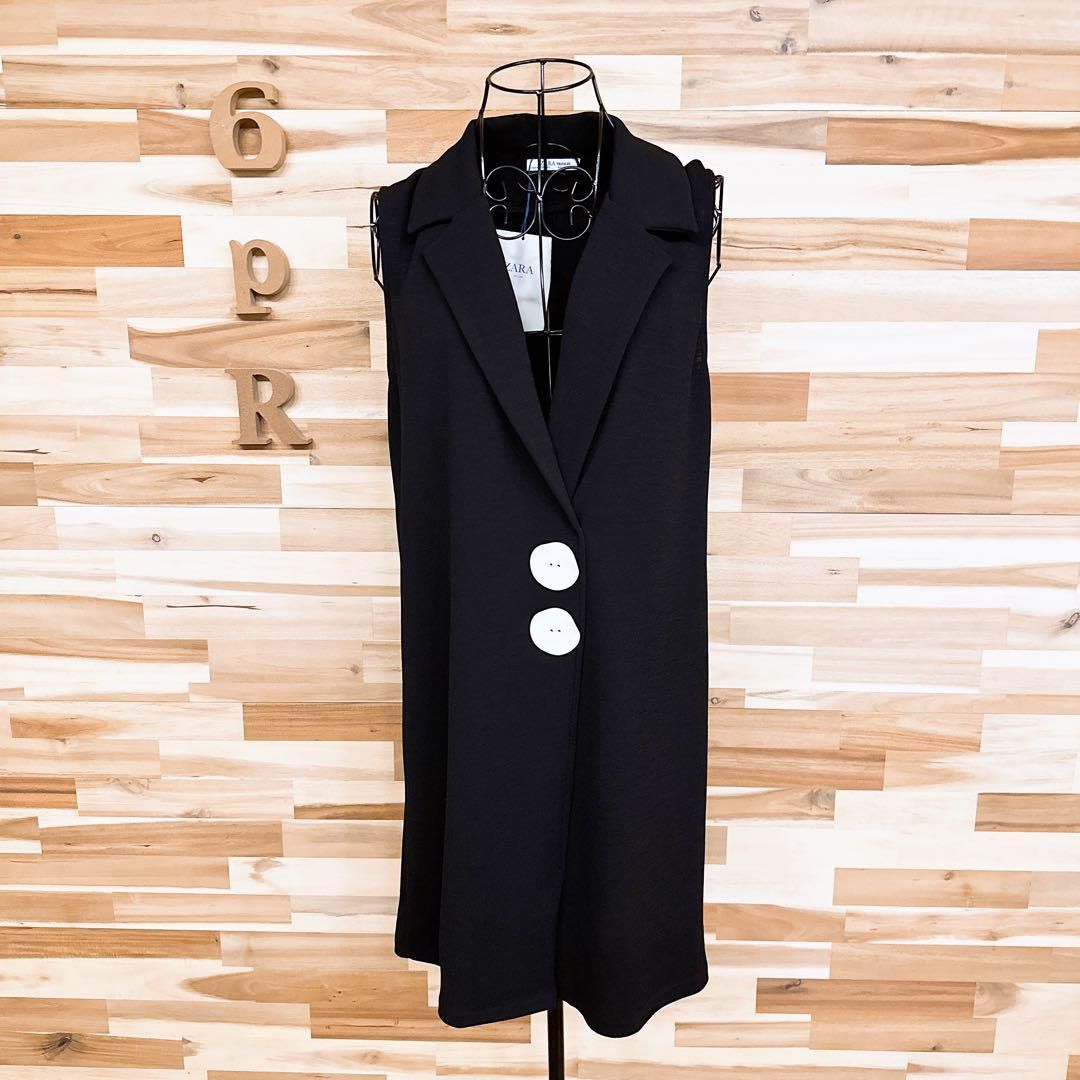 * 重ね着 *やや薄手で柔らかい生地が軽やかに落ち、自然なドレープを描く上品な質感。大きめの飾りボタンとシャープなラペルが視線を惹きつけ、ノースリーブのすっきりとしたシルエットが都会的な美しさを際立たせてくれるZARAのワンピースです。