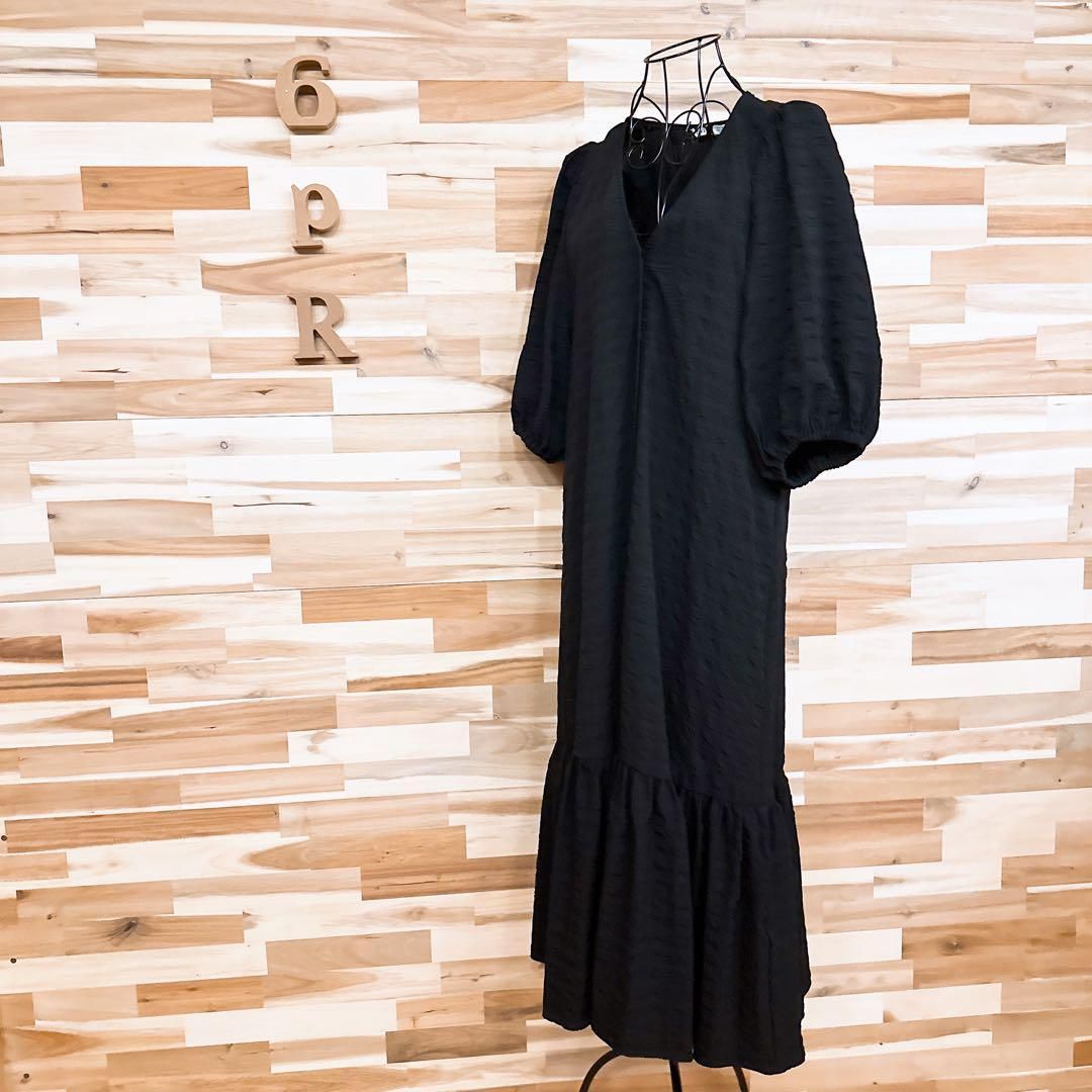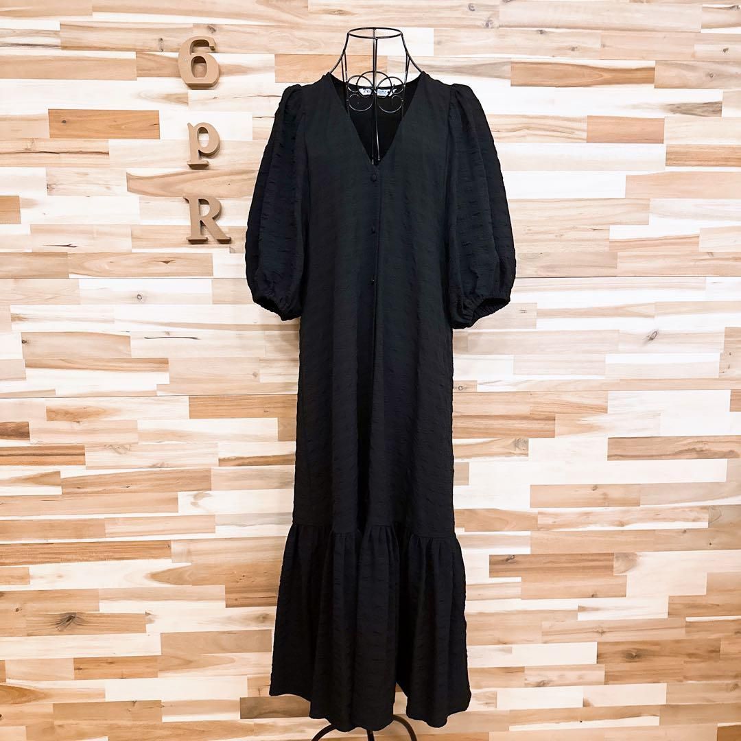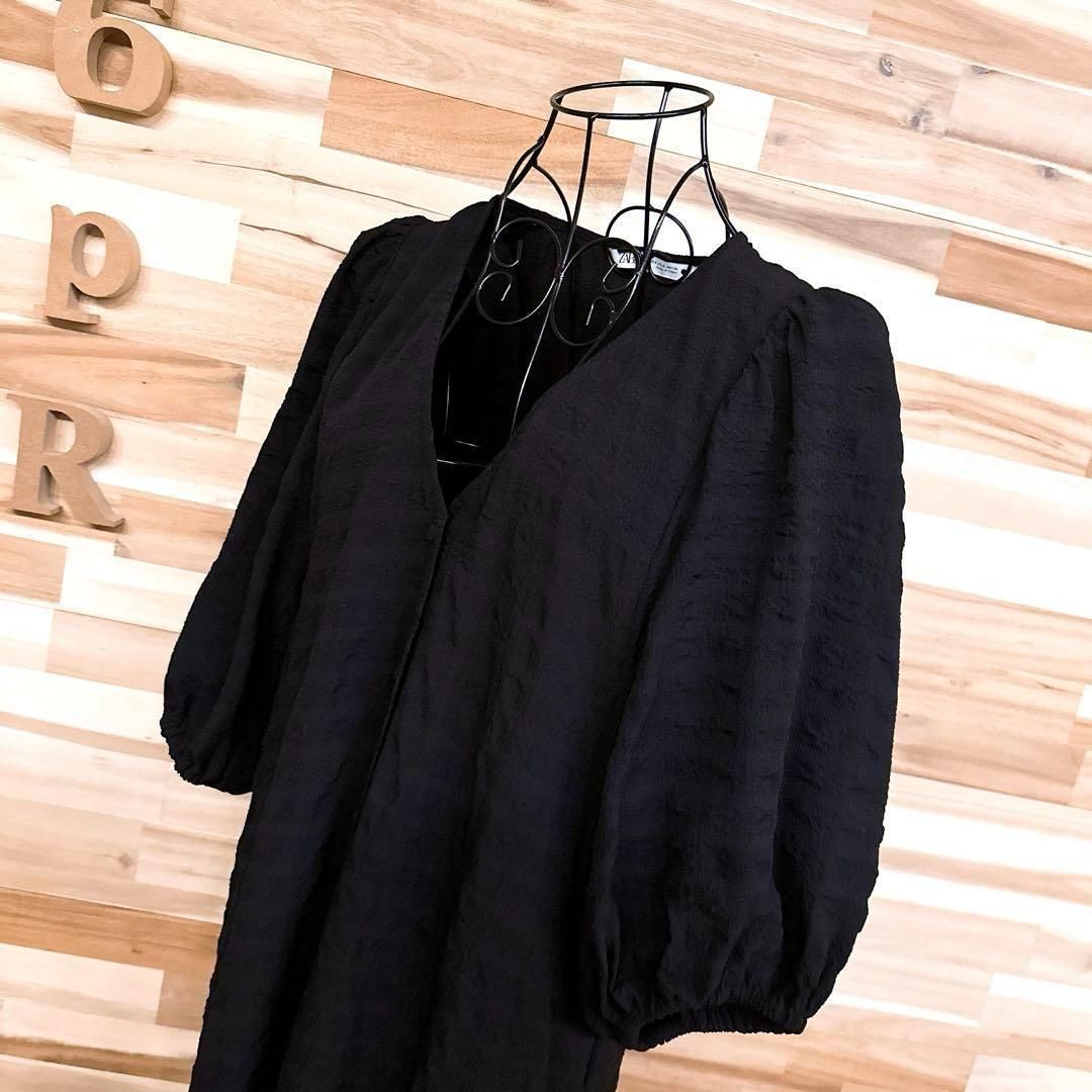 軽やかな薄手のブラック生地に、モコモコとした立体感のある織りが奥行きを生み、深みのある表情を引き立てる一着。すっきりと開いたVネックが顔まわりを明るく見せ、ふんわりとしたボリューム袖と切り替えギャザーの裾が、柔らかく女性らしいシルエットを演出してくれるZARAのワンピースです。※LGスタイラーにて除菌リフレッシュ・スチームクリーニング済みです。