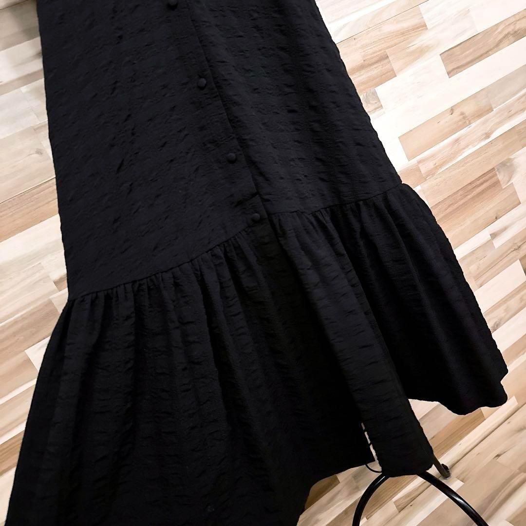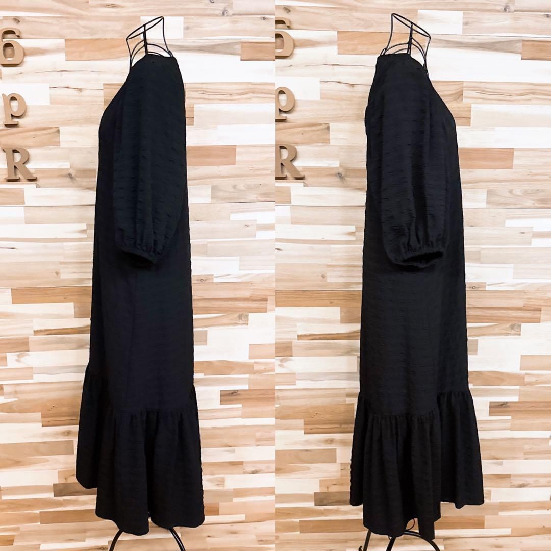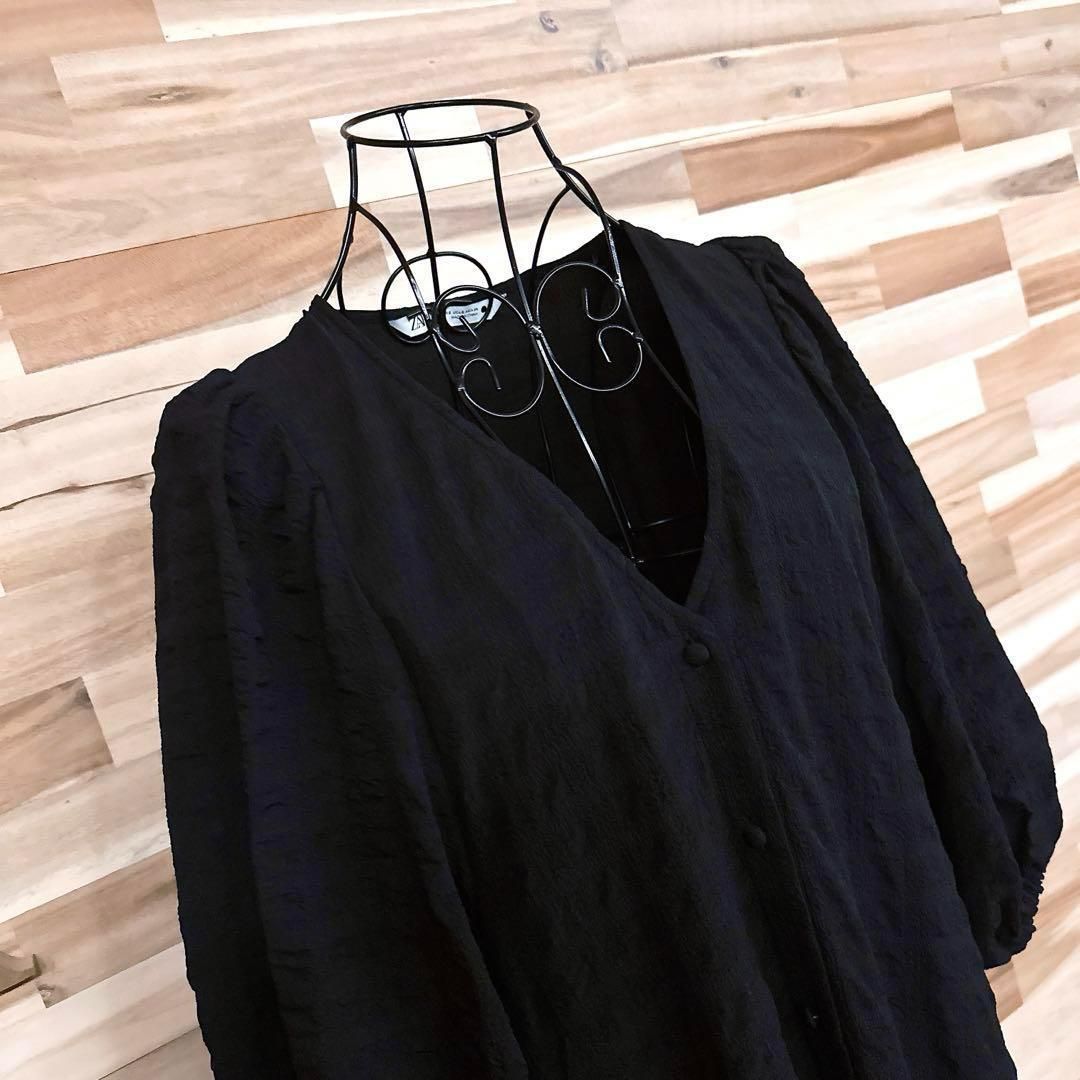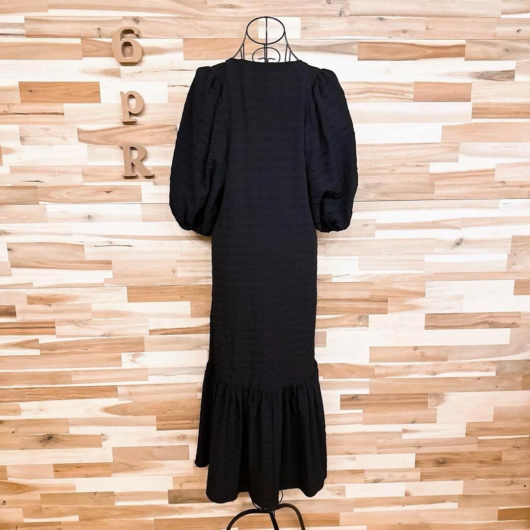 軽やかな薄手のブラック生地に、モコモコとした立体感のある織りが奥行きを生み、深みのある表情を引き立てる一着。すっきりと開いたVネックが顔まわりを明るく見せ、ふんわりとしたボリューム袖と切り替えギャザーの裾が、柔らかく女性らしいシルエットを演出してくれるZARAのワンピースです。※LGスタイラーにて除菌リフレッシュ・スチームクリーニング済みです。