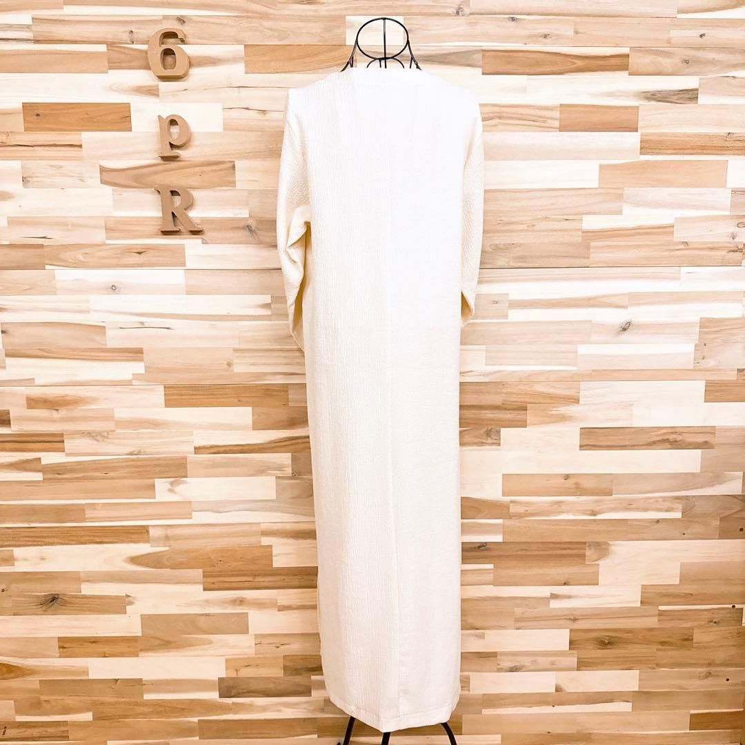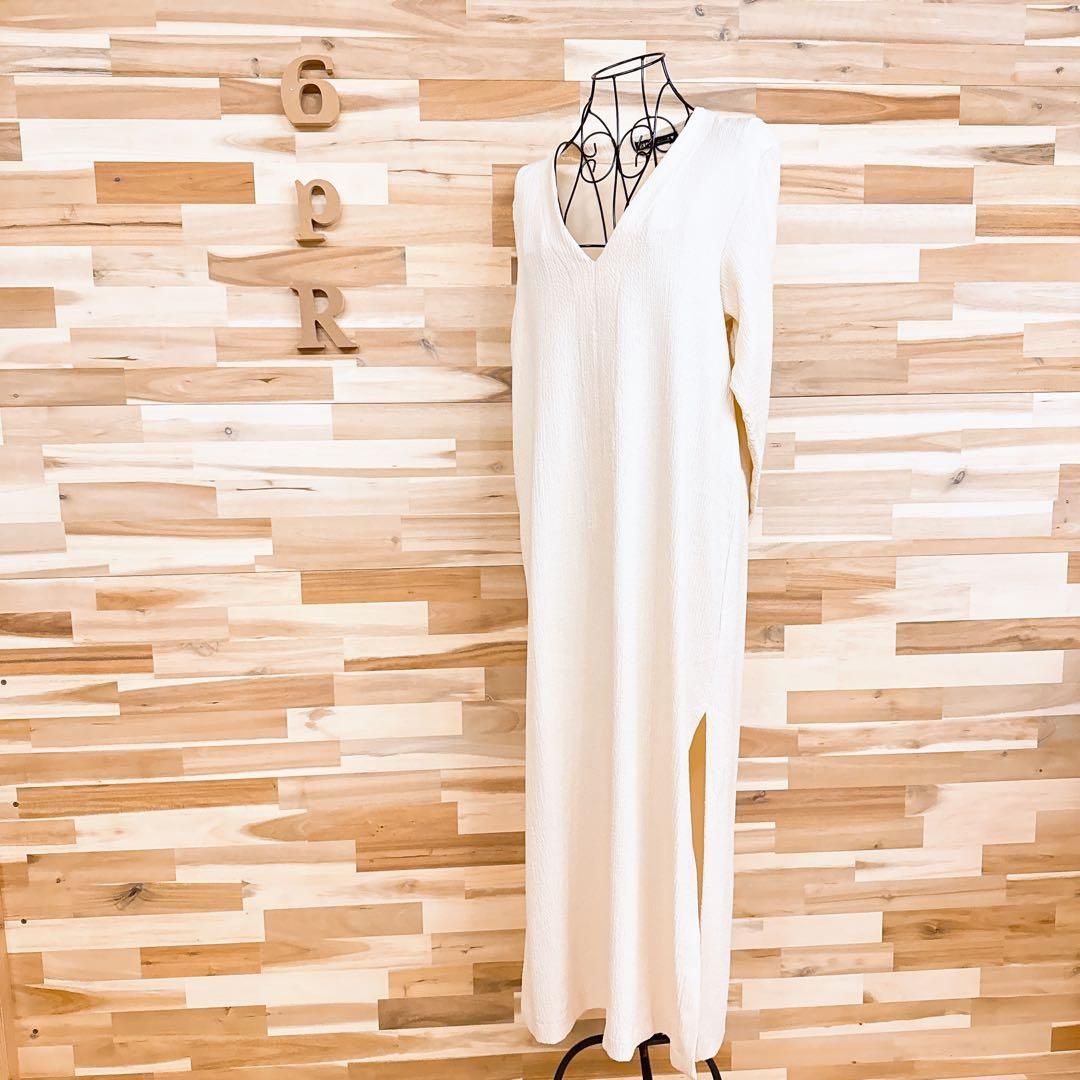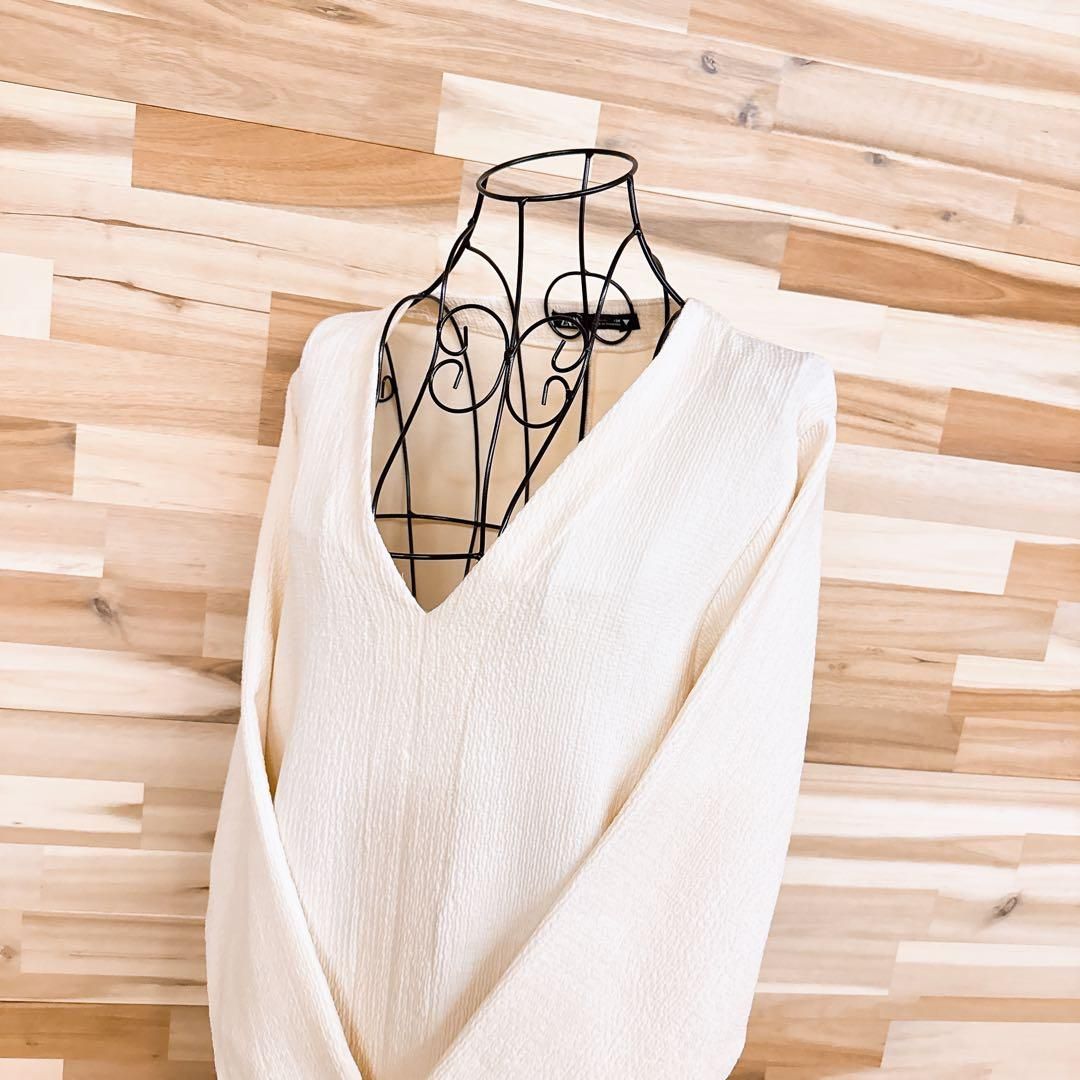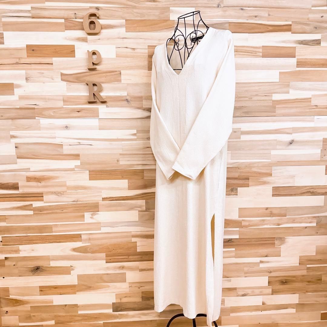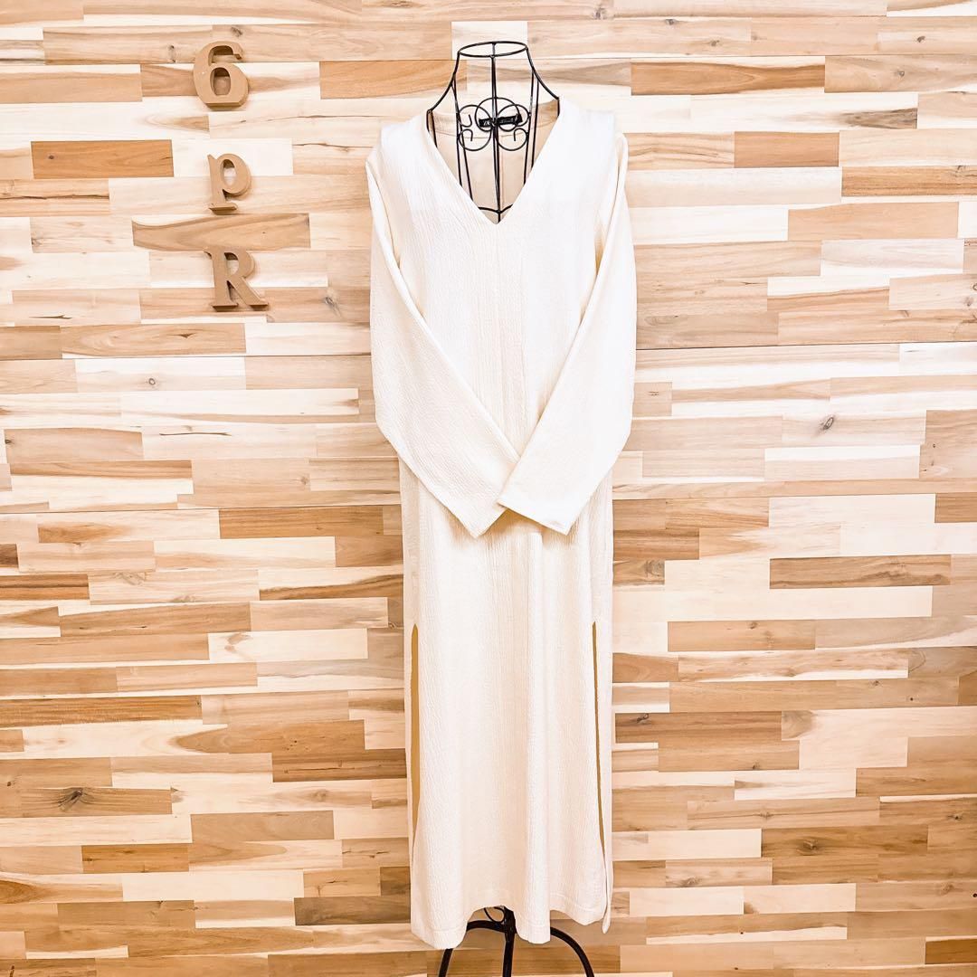 しぼ加工(凹凸)が施されたやや薄手の素材で、柔らかな風合いと軽やかな肌ざわりが魅力。まろやかなアイボリーをベースに、深めのVネックが首元をすっきりと見せてくれる。サイドスリットが抜け感を添え、レイヤードコーデにも映えるデザイン。リラックス感あるボトムスやサンダルと合わせて、肩の力を抜いた上品なスタイルにもおすすめなZARAのワンピースです。※LGスタイラーにて除菌リフレッシュ・スチームクリーニング済みです。