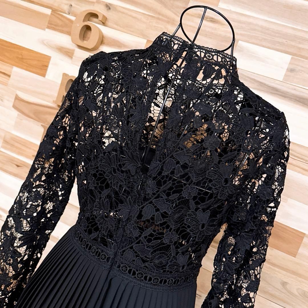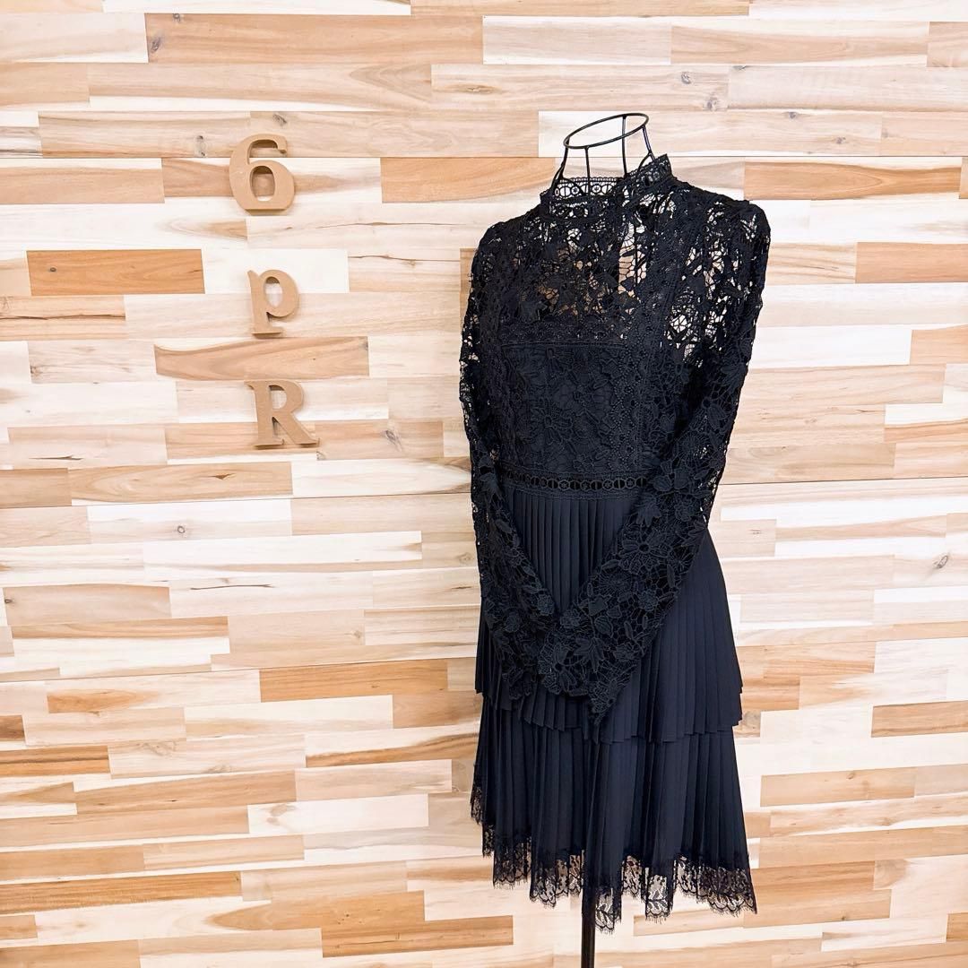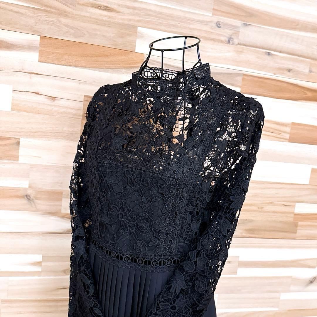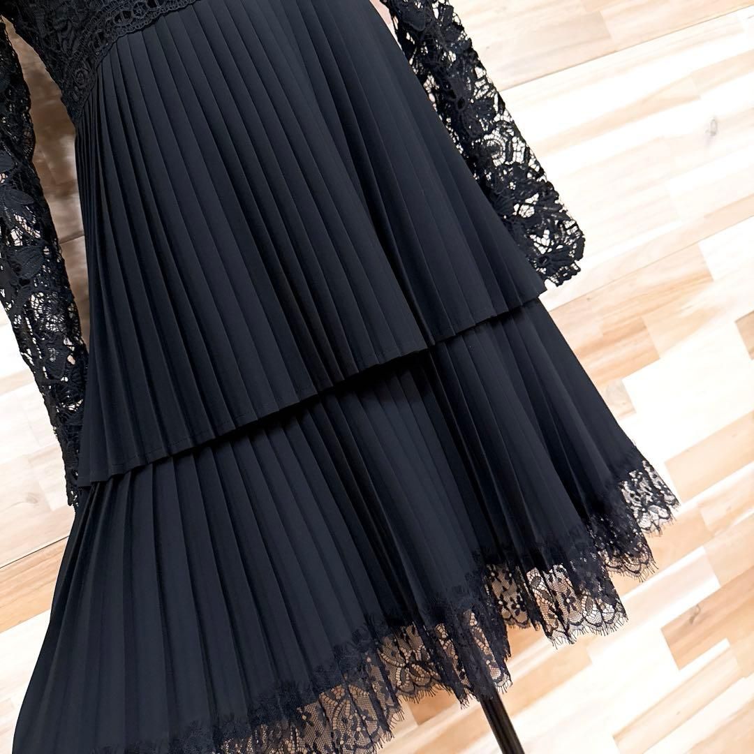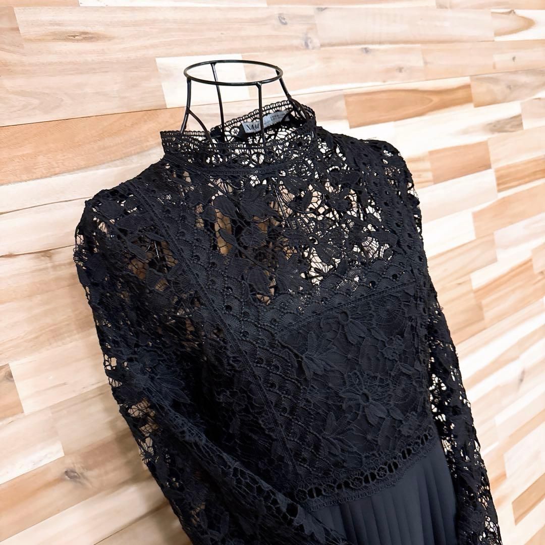 * ドッキング / フラワー / フラワーモチーフ / 長袖 / シアー *繊細なレースが華やかに映えるブラックドレス。フラワーモチーフの刺繍が上品な透け感を生み、ロングスリーブの優雅なシルエットが印象的。プリーツ加工のティアードスカートが動きに軽やかさを加え、裾のレースがさりげないアクセントのZARAのワンピースです。※LGスタイラーにて除菌リフレッシュ・スチームクリーニング済みです。