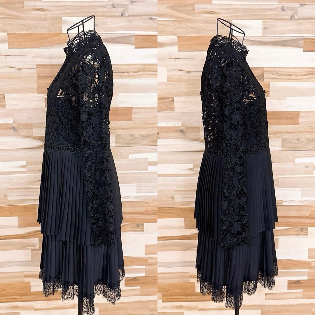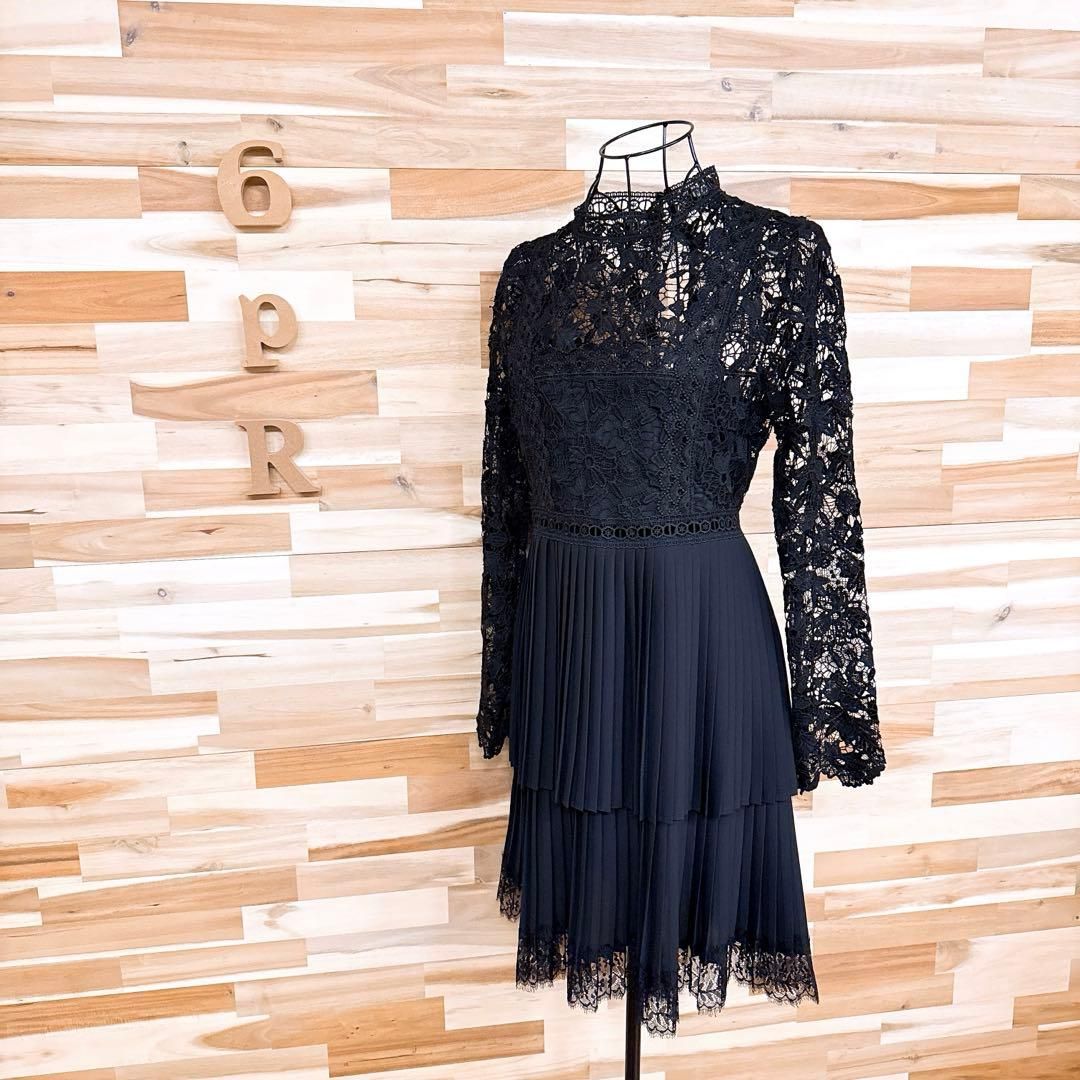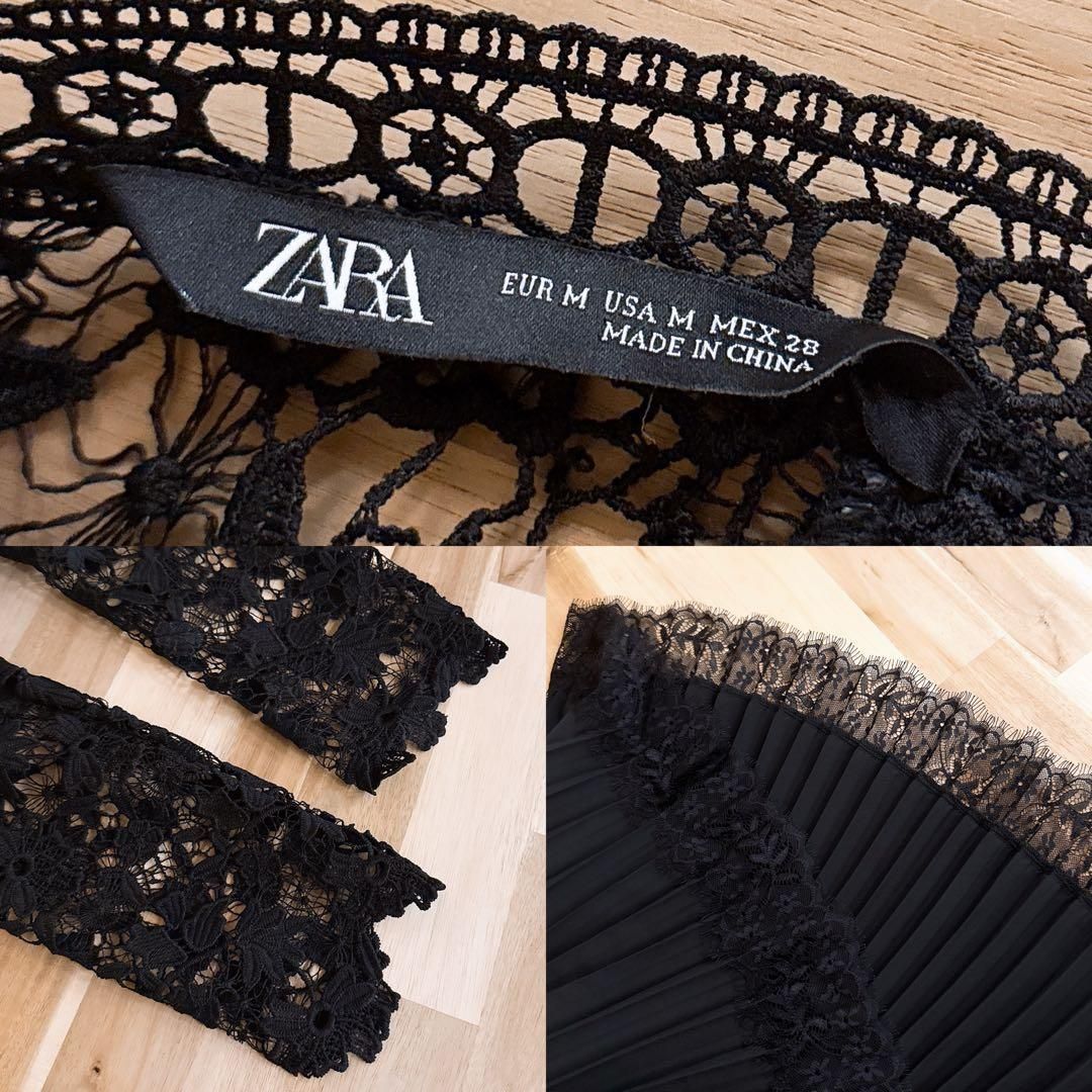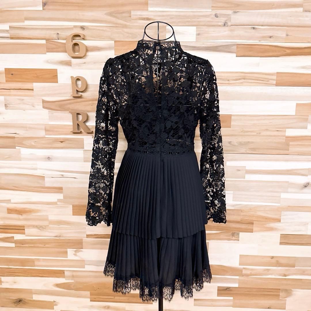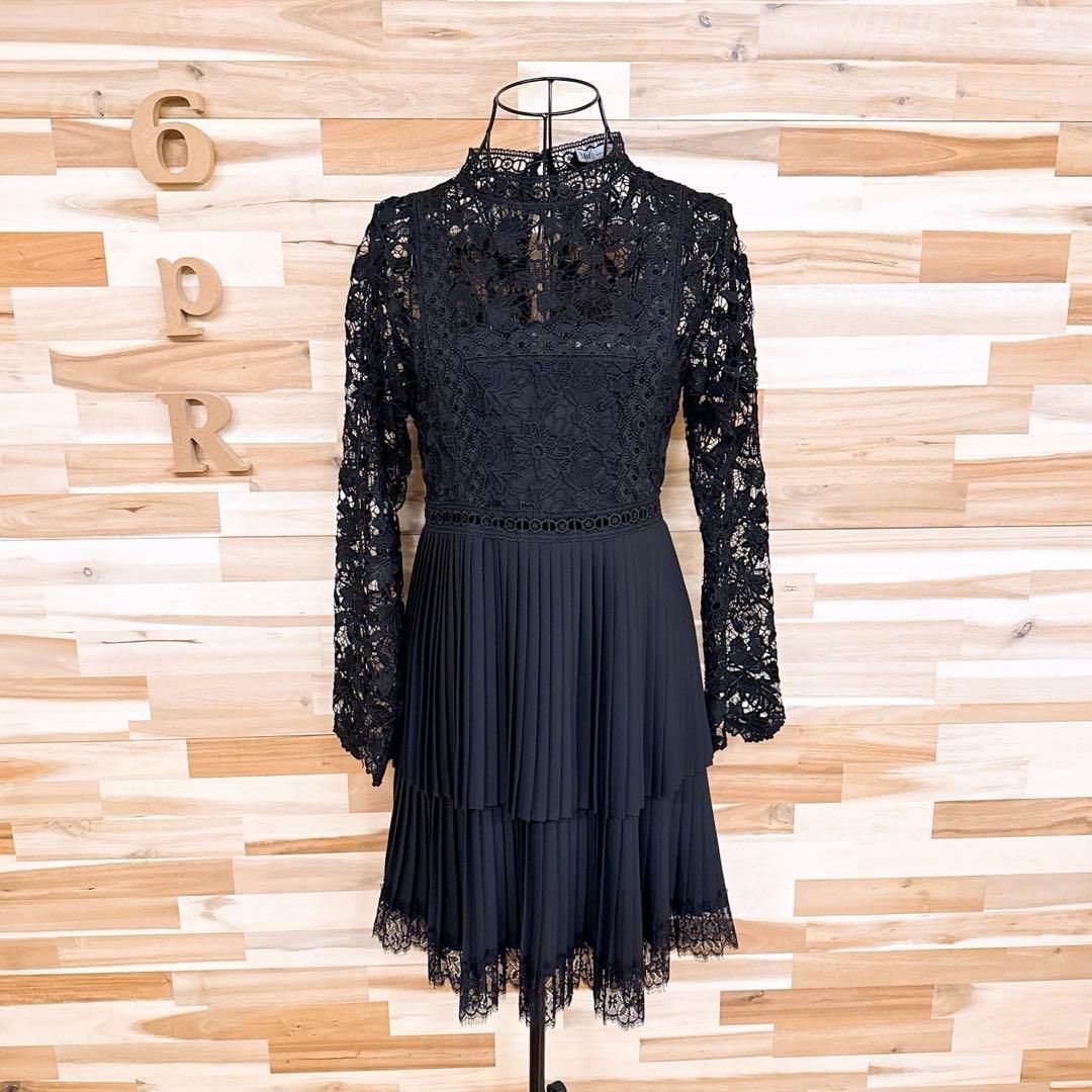* ドッキング / フラワー / フラワーモチーフ / 長袖 / シアー *繊細なレースが華やかに映えるブラックドレス。フラワーモチーフの刺繍が上品な透け感を生み、ロングスリーブの優雅なシルエットが印象的。プリーツ加工のティアードスカートが動きに軽やかさを加え、裾のレースがさりげないアクセントのZARAのワンピースです。※LGスタイラーにて除菌リフレッシュ・スチームクリーニング済みです。