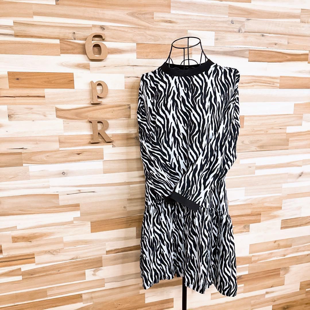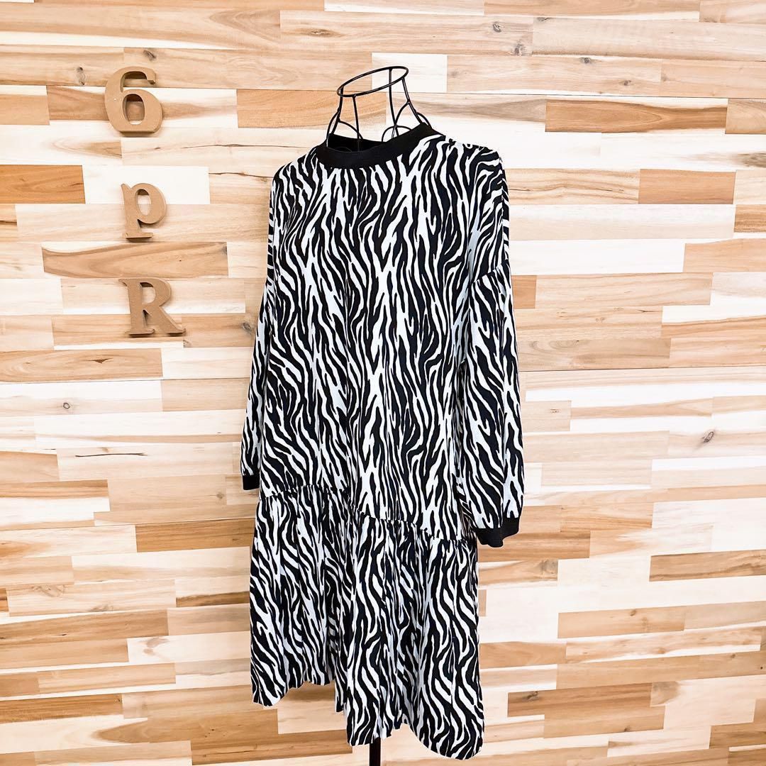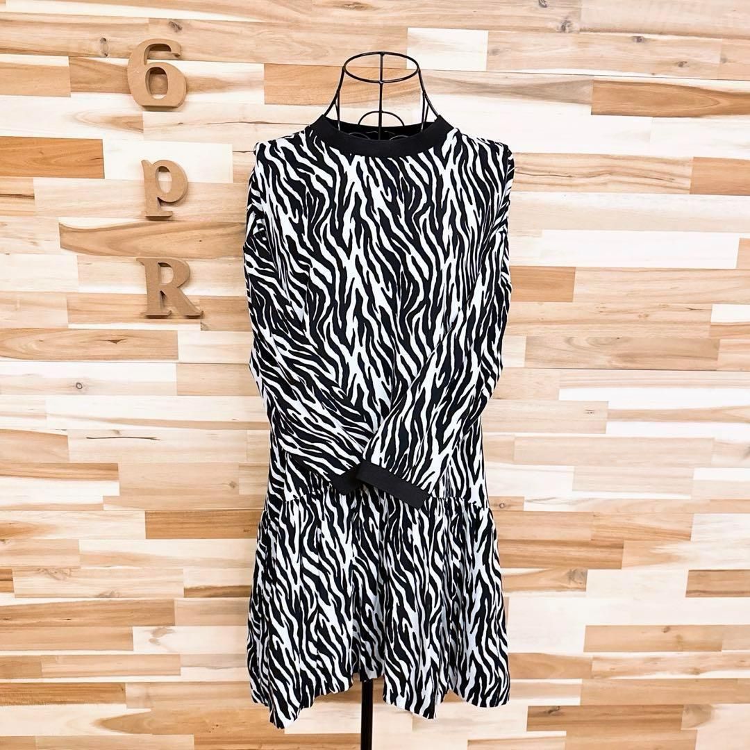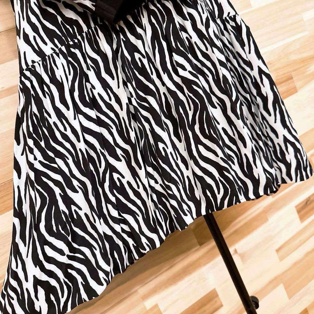 深みのある黒をベースに、白のラインが際立つアニマル柄が全体に広がり、洗練された雰囲気を演出。縦に流れるスカートが軽やかに揺れ、襟口と袖口のブラックがコーディネートにメリハリをプラスしてくれる大人オシャレなZARAのワンピースです。※LGスタイラーにて除菌リフレッシュ・スチームクリーニング済みです。