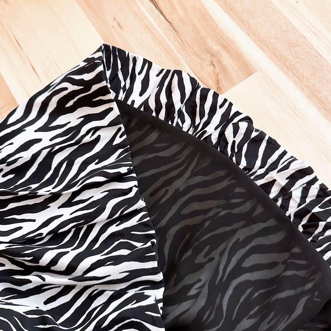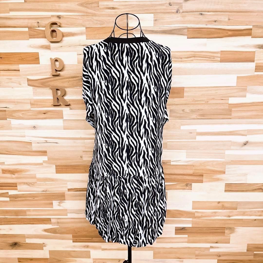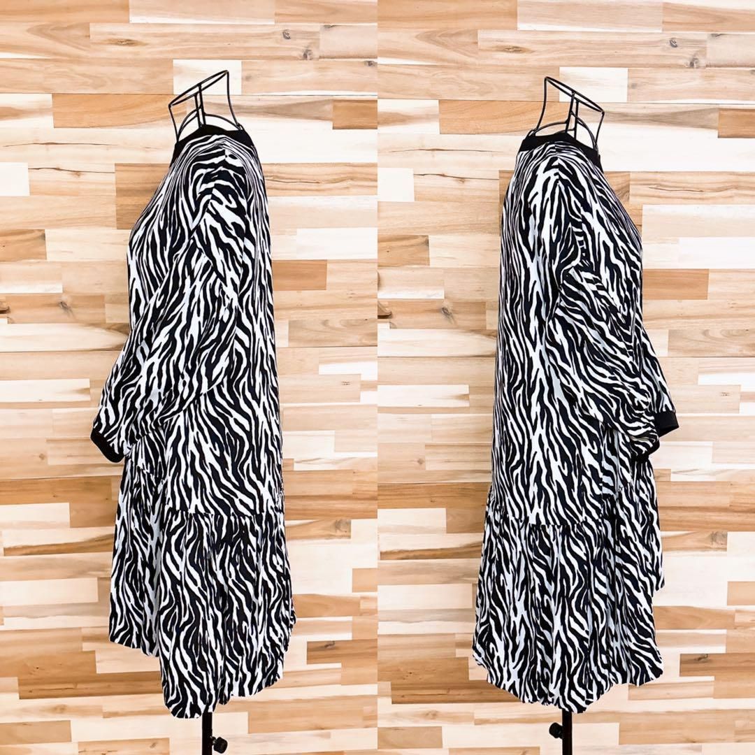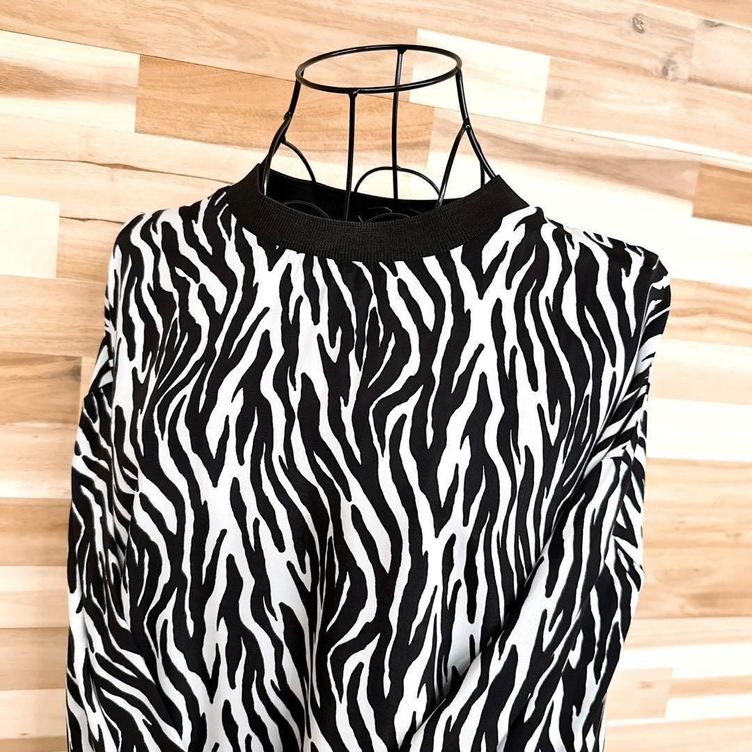 深みのある黒をベースに、白のラインが際立つアニマル柄が全体に広がり、洗練された雰囲気を演出。縦に流れるスカートが軽やかに揺れ、襟口と袖口のブラックがコーディネートにメリハリをプラスしてくれる大人オシャレなZARAのワンピースです。※LGスタイラーにて除菌リフレッシュ・スチームクリーニング済みです。