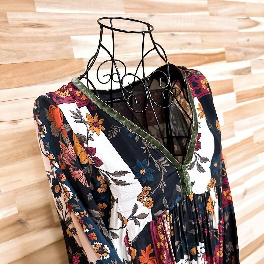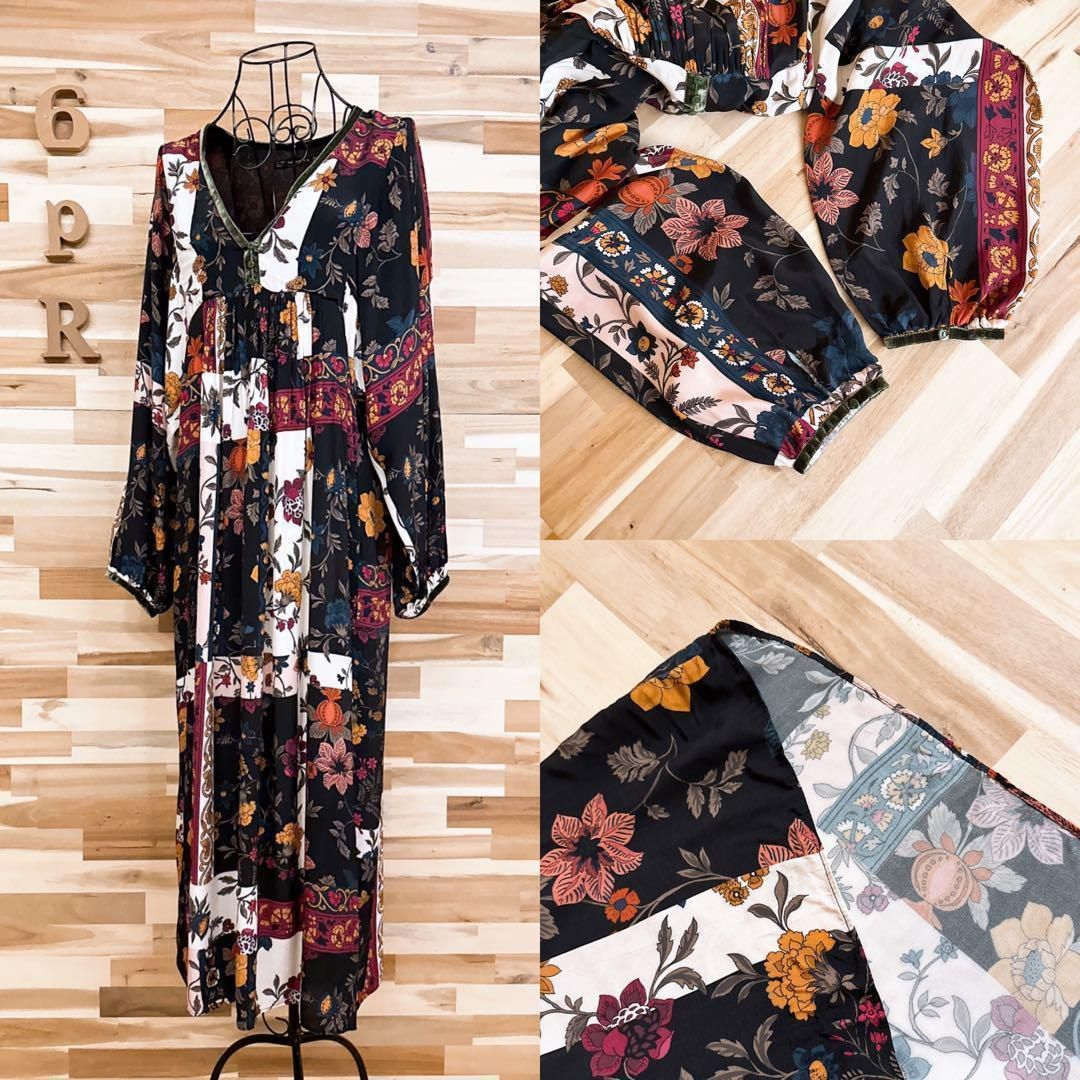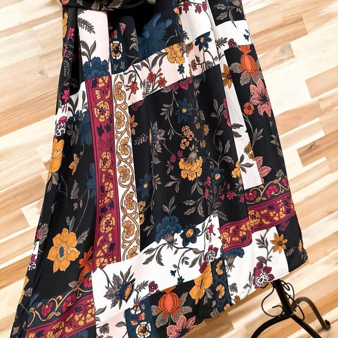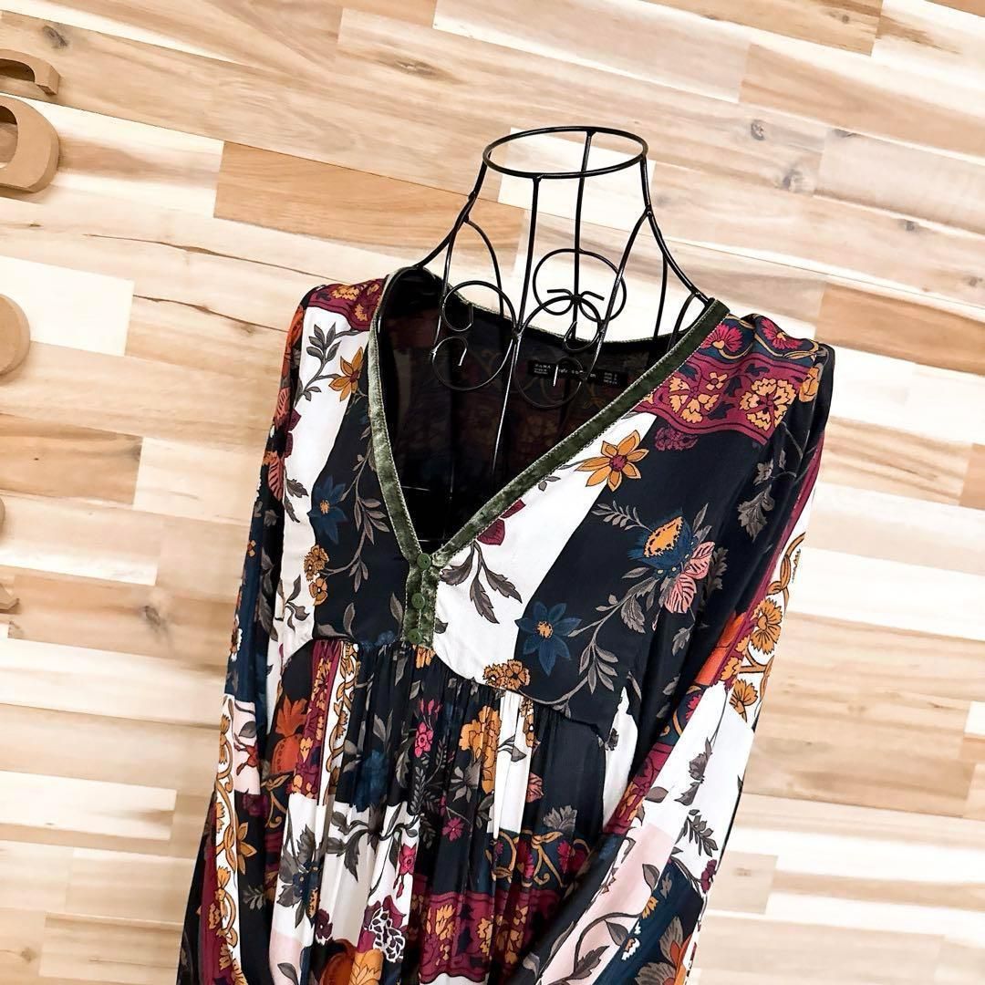 * 花 / フローラル / 総柄 / ベロアネック *レーヨンがブレンドされた滑らかな肌触り。ブラックをベースに、深みのある色彩が描く花柄がパッチワーク調に散りばめられ、奥行きのある華やかさを演出。首元がすっきり見え、顔の印象をシャープに、小顔に見せる効果が期待できるVネック部分にはベロア生地を使い程良くヴィンテージ感も漂わせるZARAのワンピースです。同じデザインを数多く作らないブランドのため、出回る数が少ないお品です。※LGスタイラーにて除菌リフレッシュ・スチームクリーニング済みです。