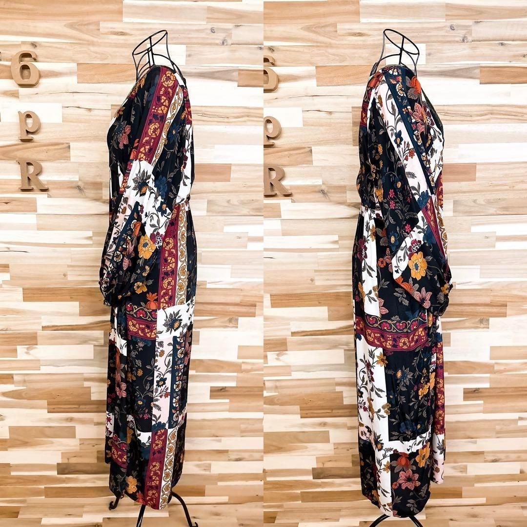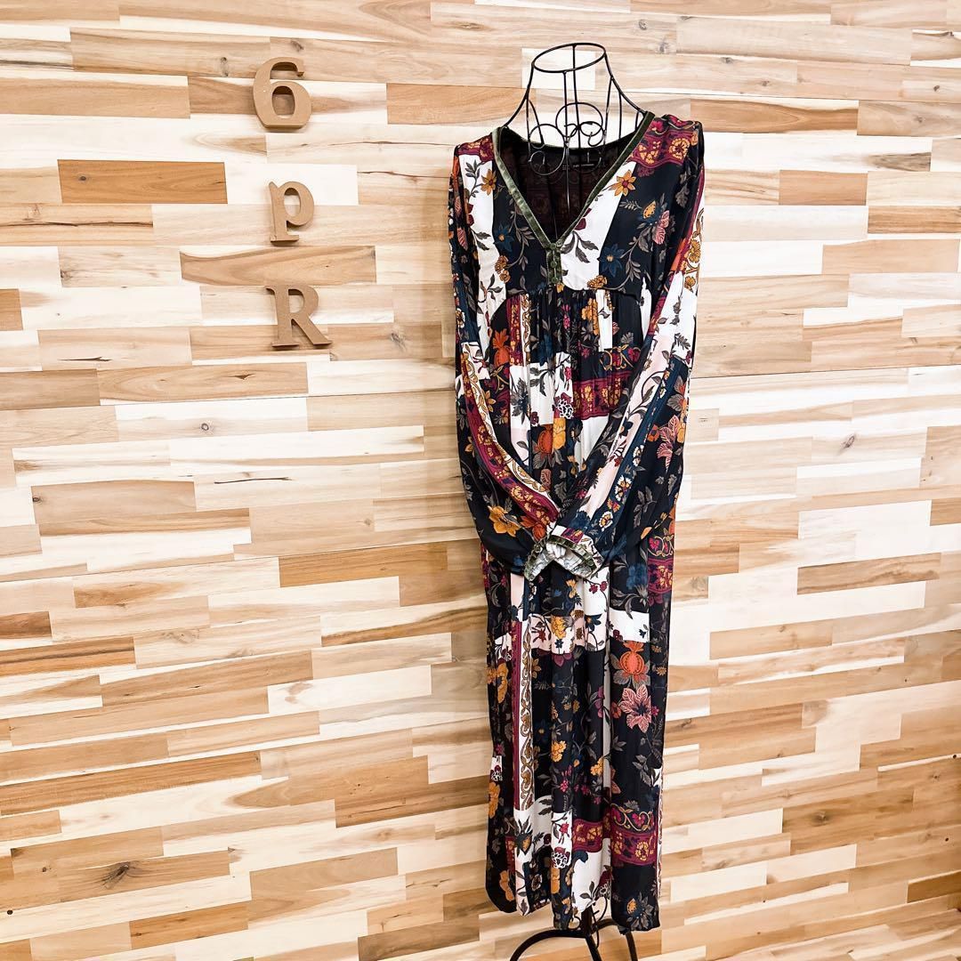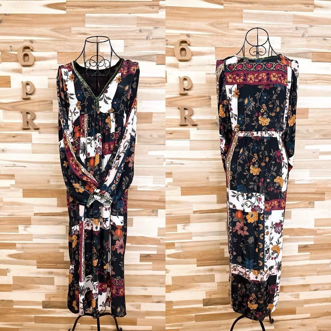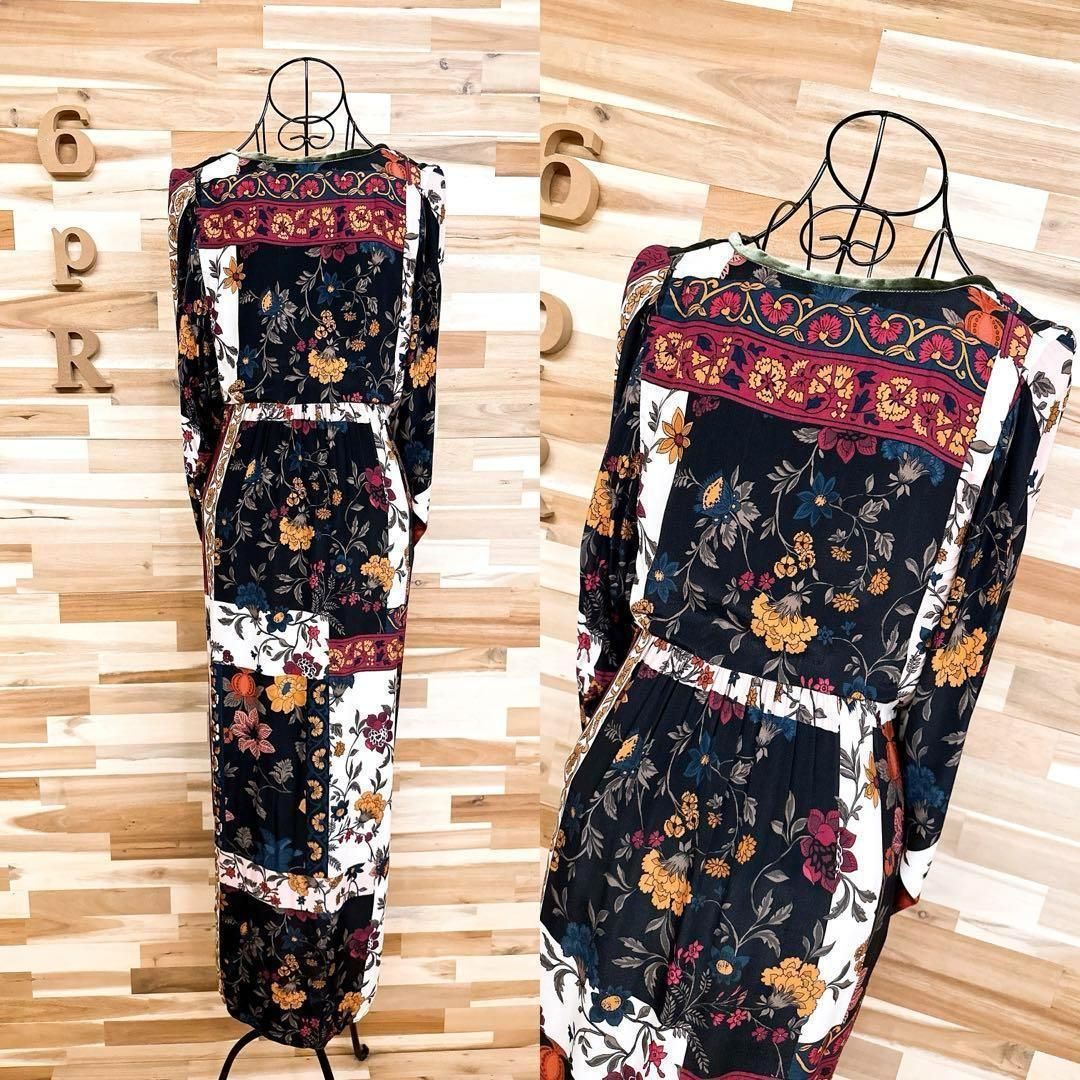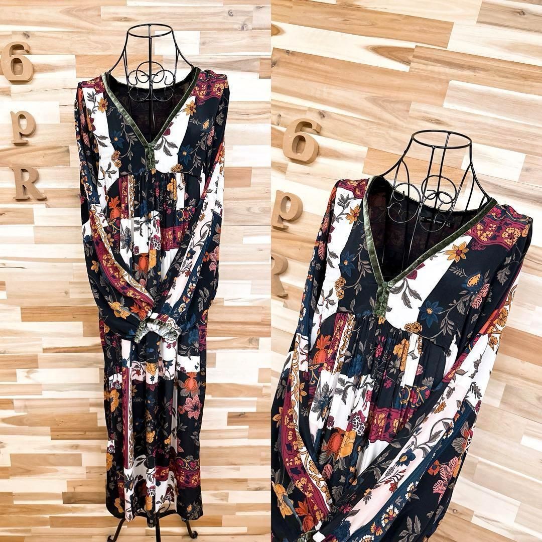 * 花 / フローラル / 総柄 / ベロアネック *レーヨンがブレンドされた滑らかな肌触り。ブラックをベースに、深みのある色彩が描く花柄がパッチワーク調に散りばめられ、奥行きのある華やかさを演出。首元がすっきり見え、顔の印象をシャープに、小顔に見せる効果が期待できるVネック部分にはベロア生地を使い程良くヴィンテージ感も漂わせるZARAのワンピースです。同じデザインを数多く作らないブランドのため、出回る数が少ないお品です。※LGスタイラーにて除菌リフレッシュ・スチームクリーニング済みです。