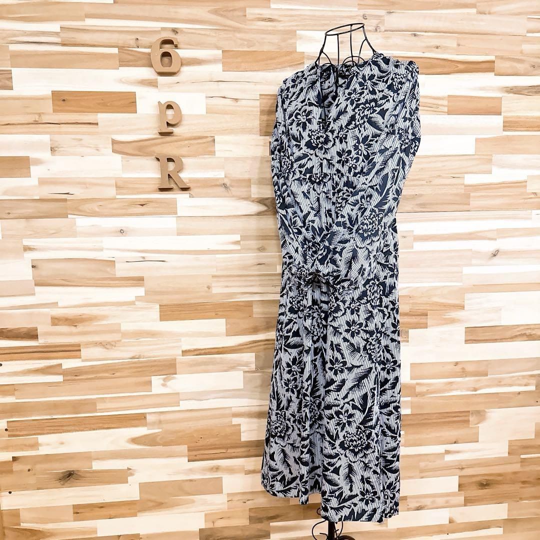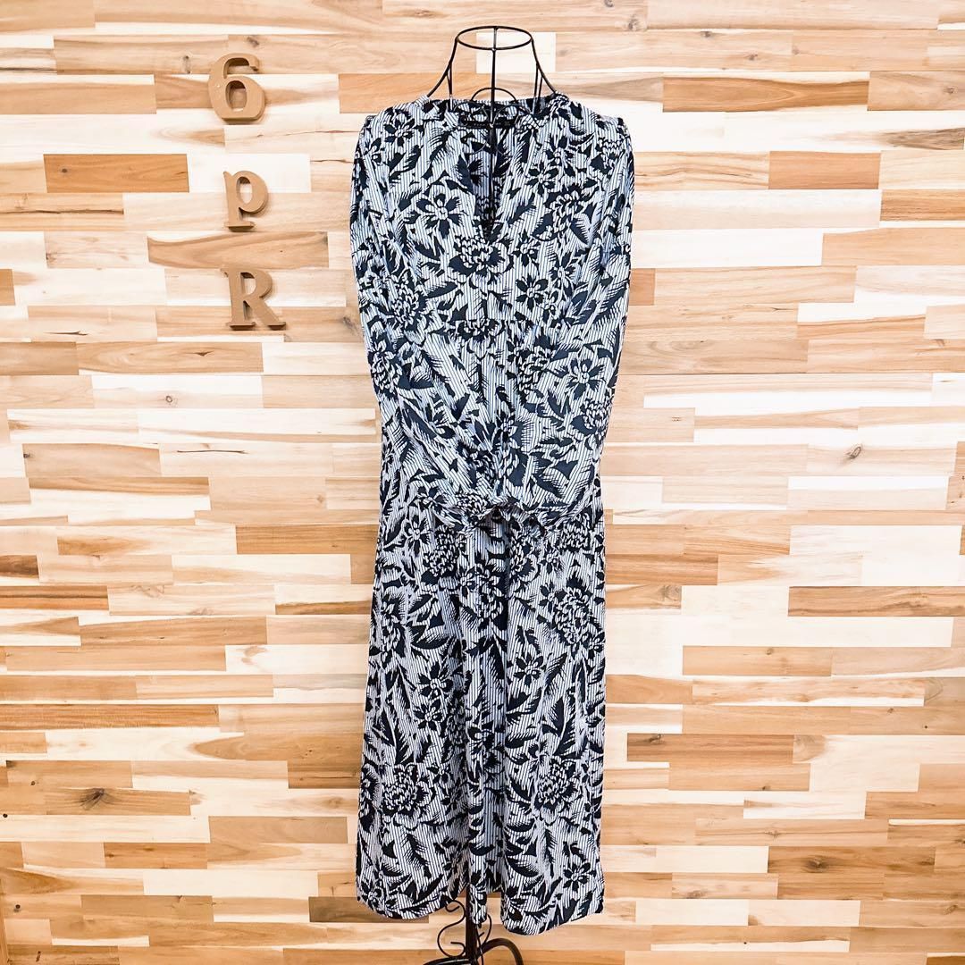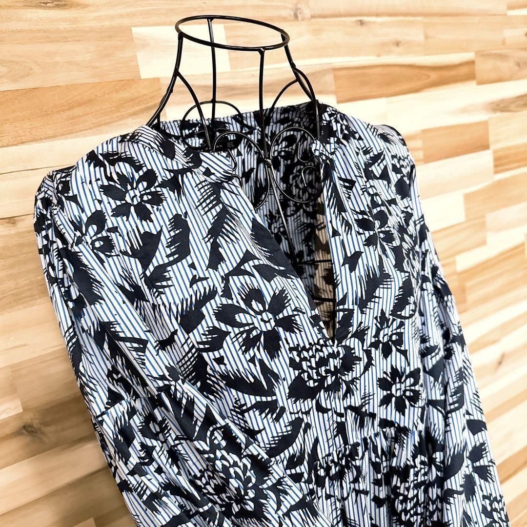 サラリとした心地よい素材で、ネイビーベース×ホワイトのボタニカル柄が涼しげで爽やかなアクセント。Vネックで顔周りをスッキリと魅せ、カーディガンやサンダルとの組み合わせで、日常にもリゾートにも映える、大人オシャレなZARA WOMANのワンピースです。※LGスタイラーにて除菌リフレッシュ・スチームクリーニング済みです。