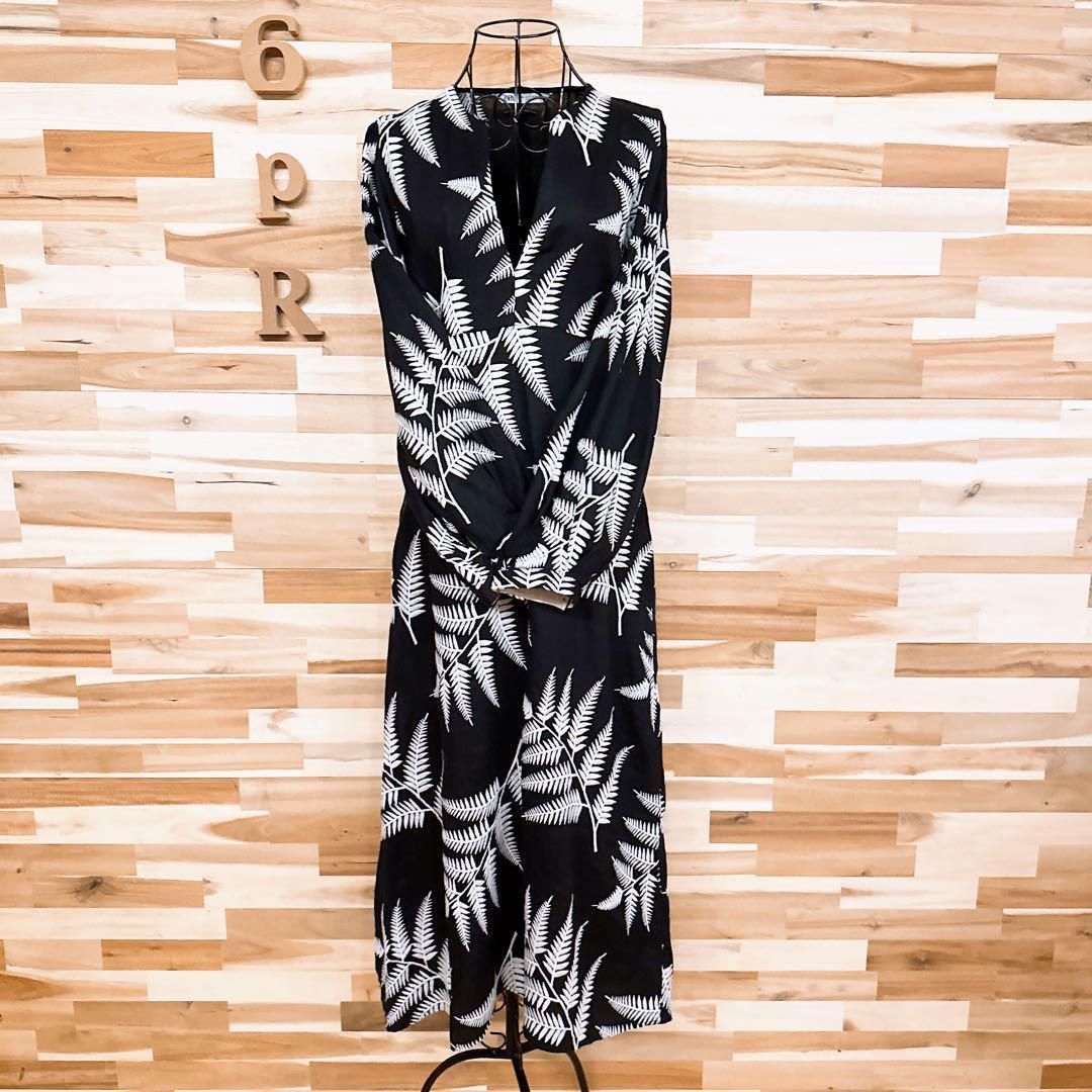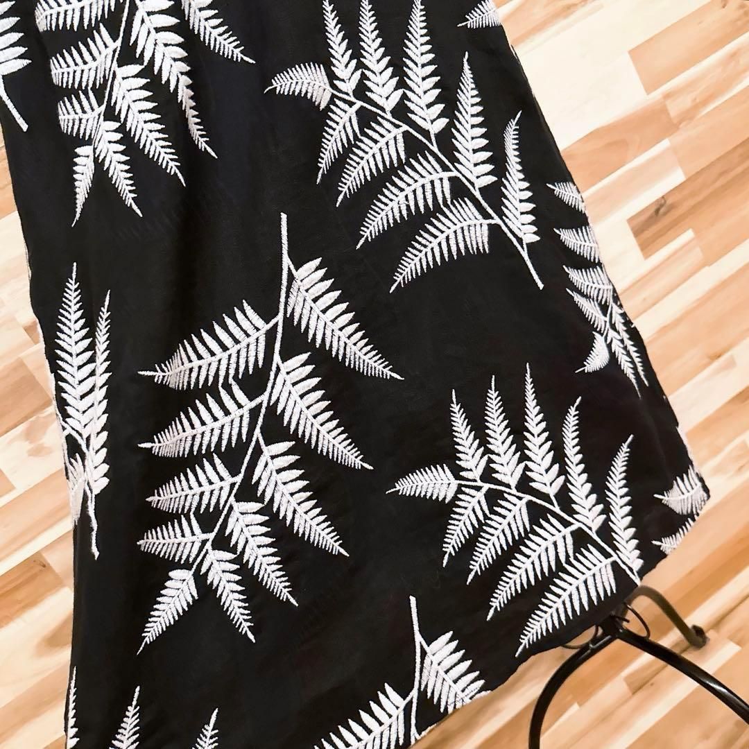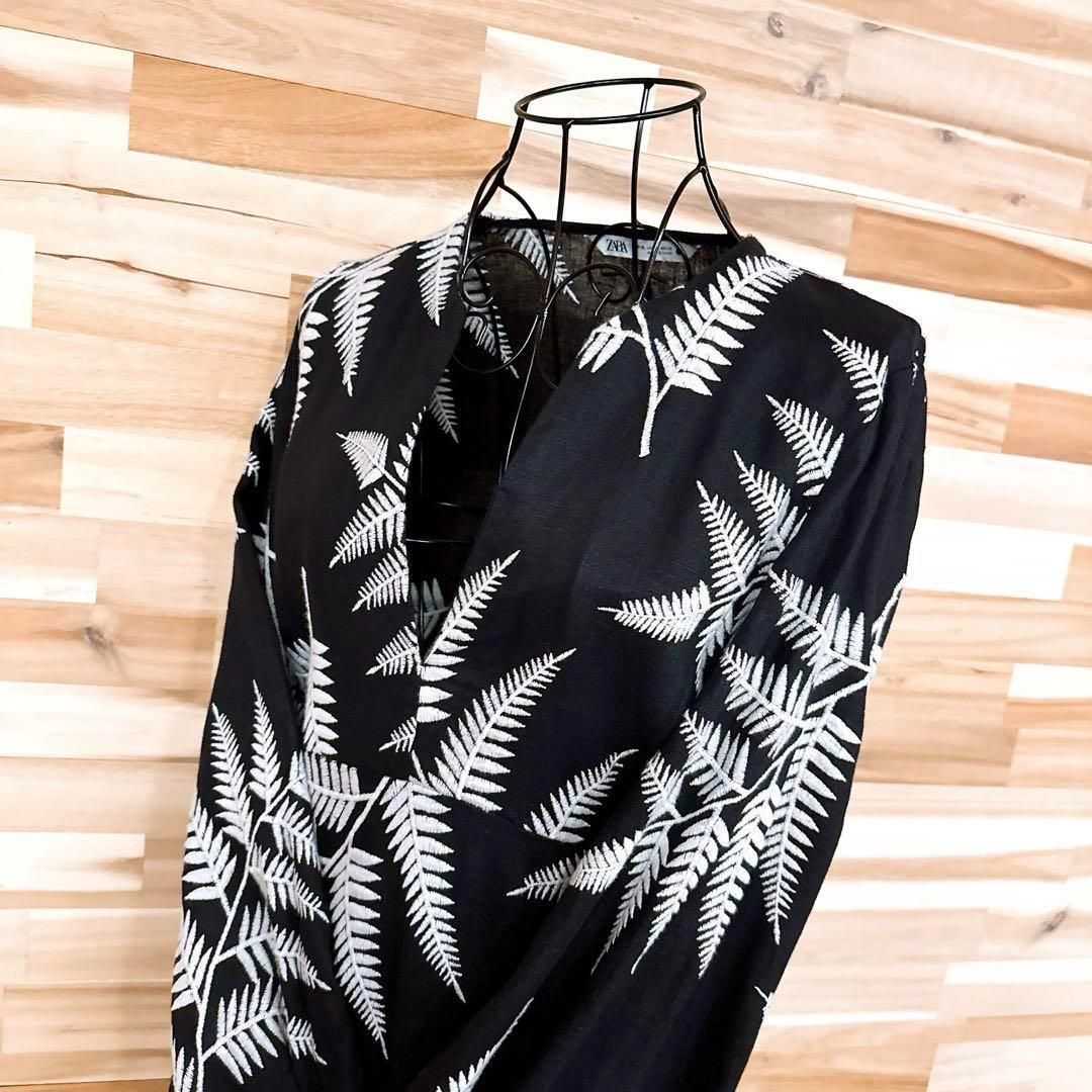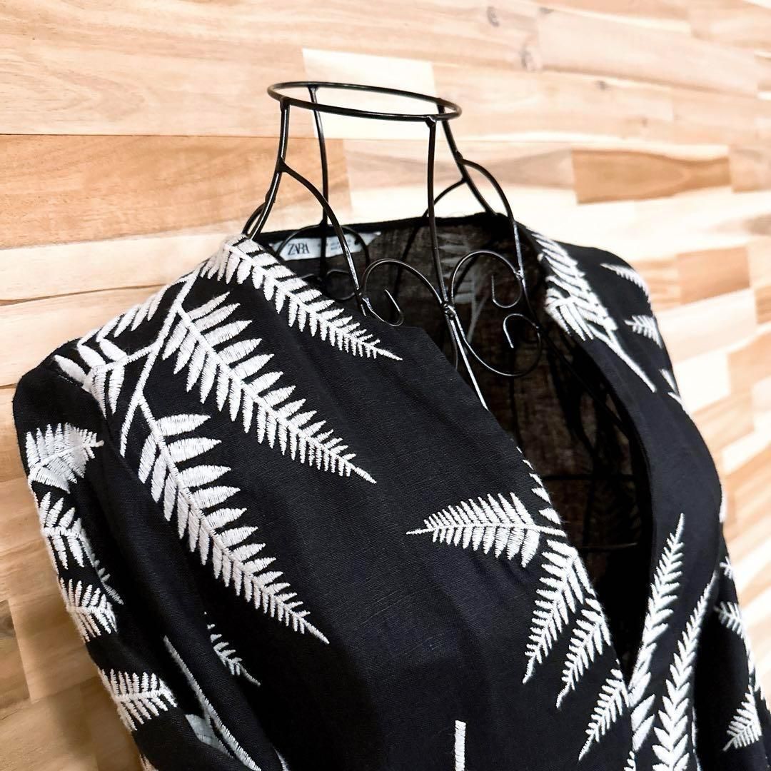 * スタンドVネック *薄手ながらも程よいハリを持つ生地感が、さらりとした肌触りで軽やかに揺れる一着。全身に施されたリーフ刺繍が立体感を生み、シックな黒地に白糸が映えることで奥行きのある上品さを添え、ナチュラルさとエレガンスが美しく溶け合うZARAのワンピースです。※LGスタイラーにて除菌リフレッシュ・スチームクリーニング済みです。