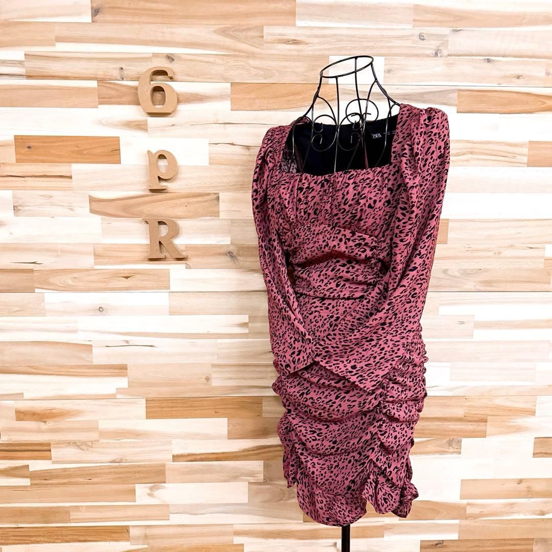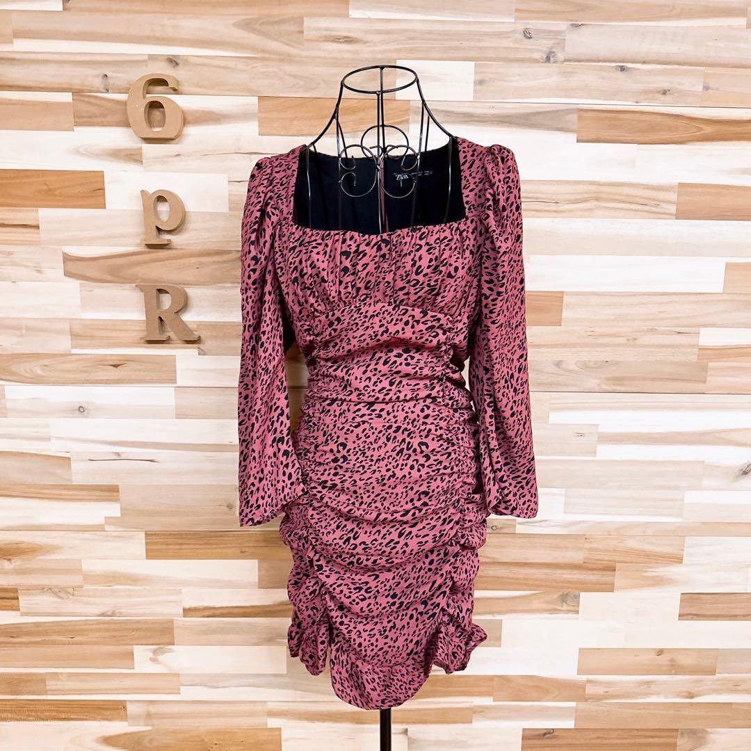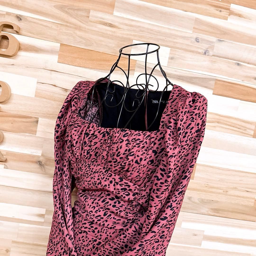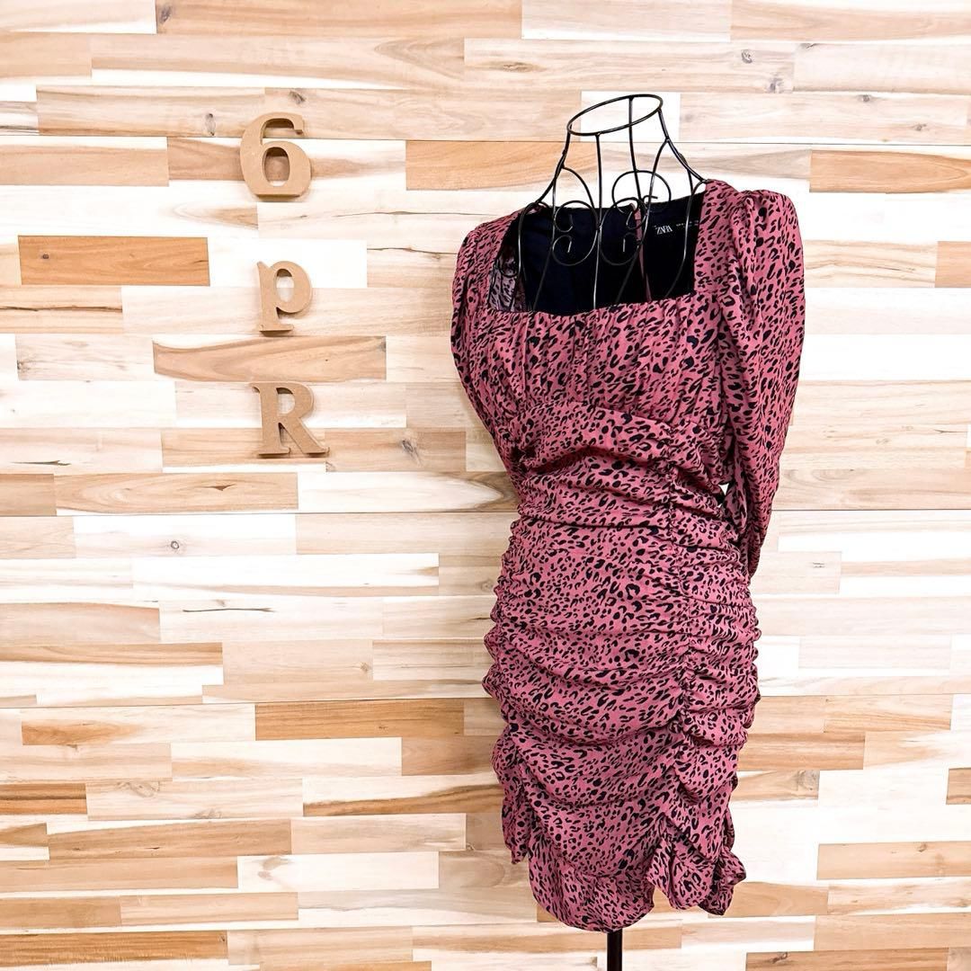 * 1165/160/172 *落ち感のある薄手の素材感で、さらりとした肌触り。主張しすぎないピンクベースにブラックのレオパード柄が映え、存在感たっぷりな一着。サイドに寄せたギャザーがヒップラインを包み込み、美しいフォルムを強調。ジャケットを羽織ってもバランスよく決まる仕立てが魅力的なZARAのワンピースです。※LGスタイラーにて除菌リフレッシュ・スチームクリーニング済みです。