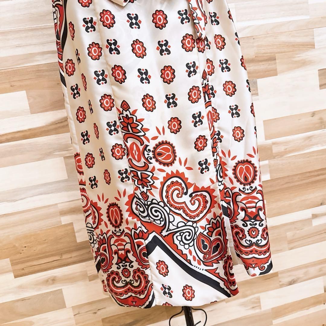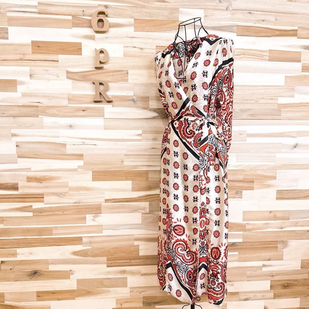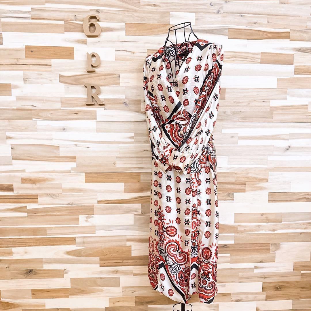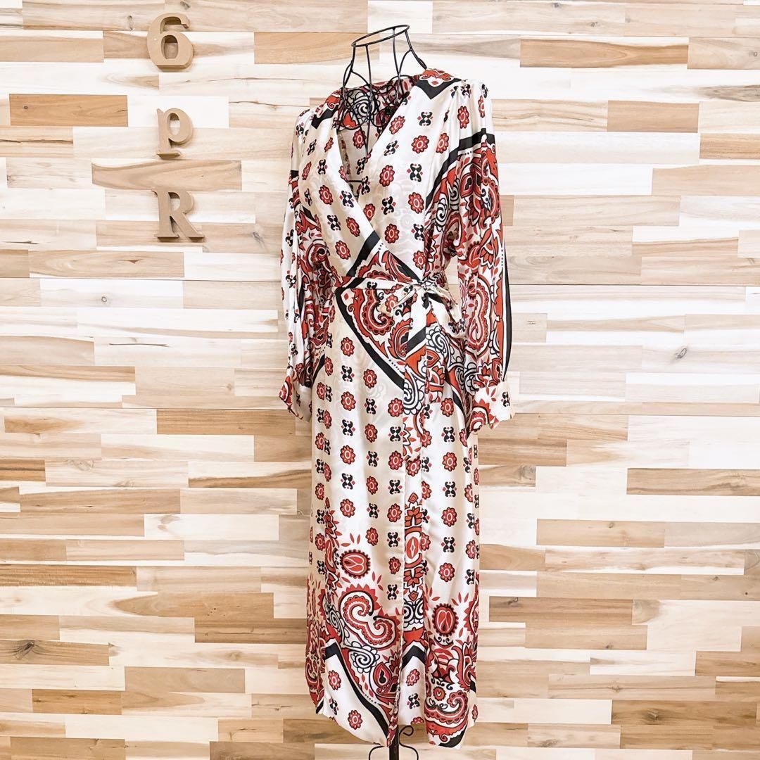 なめらかなサテンのような光沢のある素材が描く、艶やかで落ち感のあるシルエット。アイボリーベースに映える、赤とブラックのペイズリー柄がアクセント。ウエストのリボンが女性らしいラインを引き立て、歩くたびに揺れる柔らかな表情。リゾートシーンにも都会的な装いにも映える、気品あふれるZARA WOMANのワンピースです。同じデザインを数多く作らないブランドのため、出回る数が少ないお品です。※LGスタイラーにて除菌リフレッシュ・スチームクリーニング済みです。