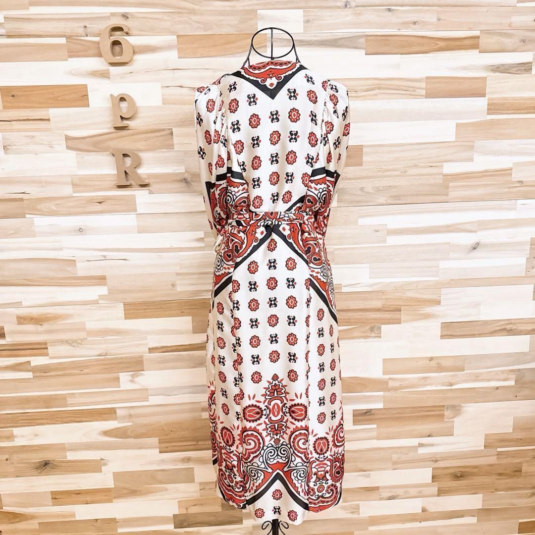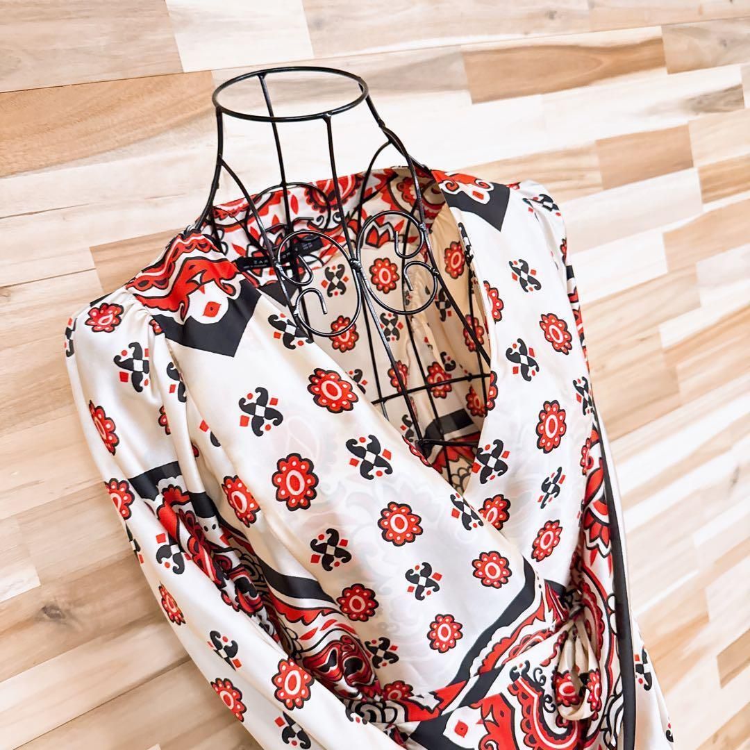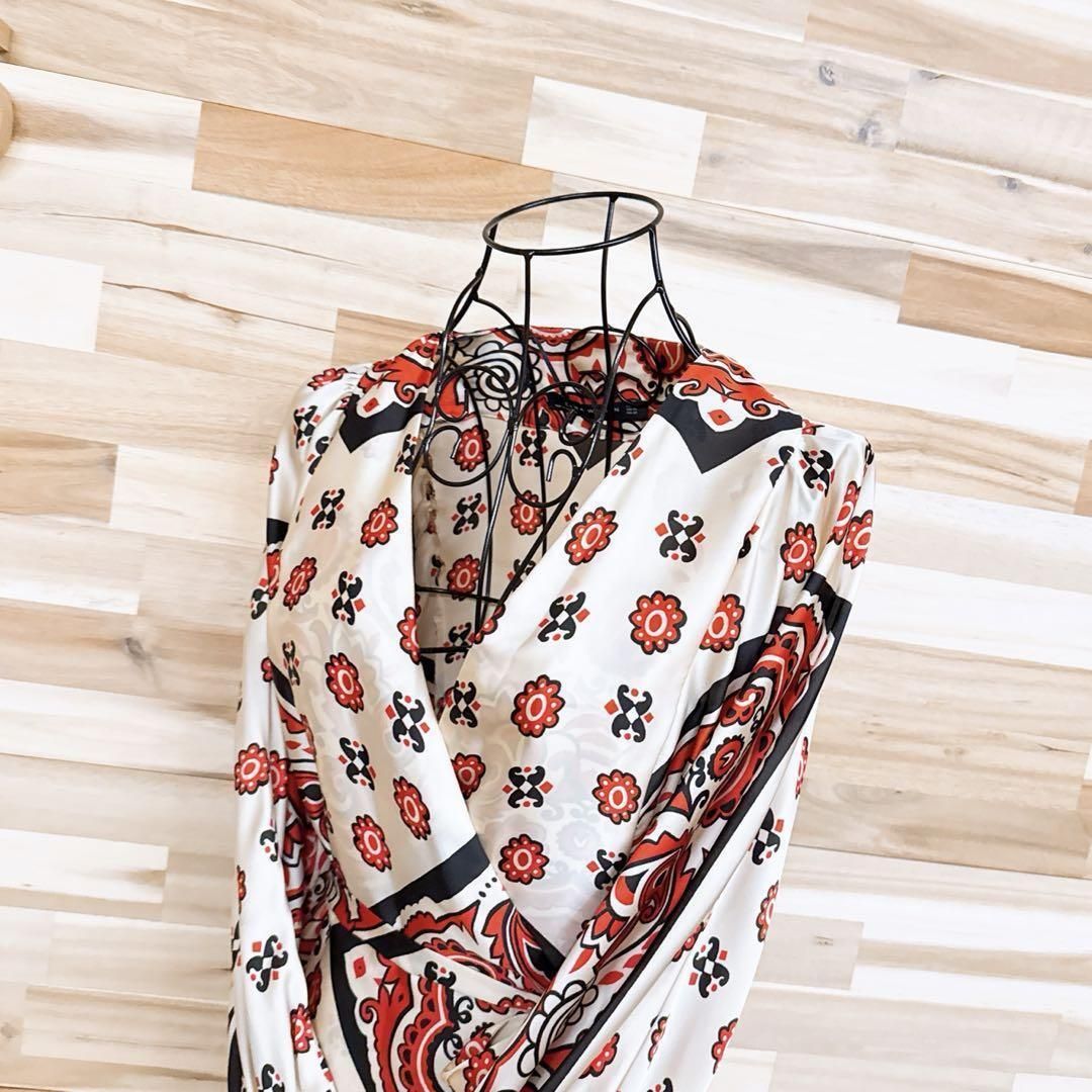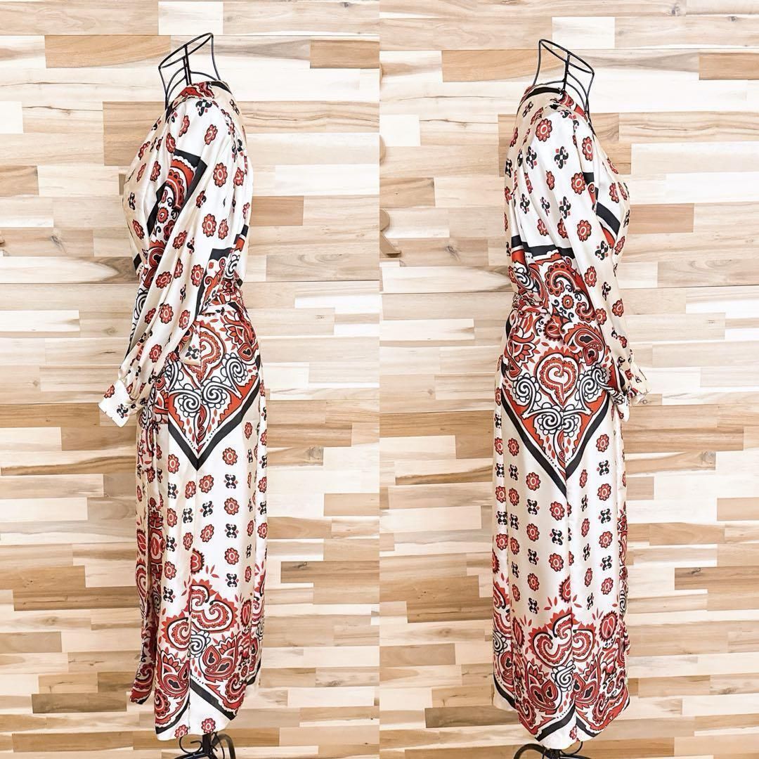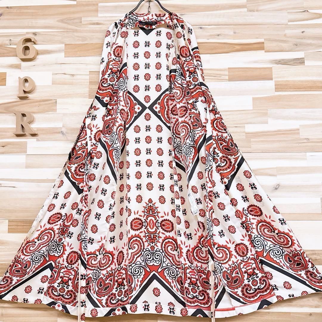 なめらかなサテンのような光沢のある素材が描く、艶やかで落ち感のあるシルエット。アイボリーベースに映える、赤とブラックのペイズリー柄がアクセント。ウエストのリボンが女性らしいラインを引き立て、歩くたびに揺れる柔らかな表情。リゾートシーンにも都会的な装いにも映える、気品あふれるZARA WOMANのワンピースです。同じデザインを数多く作らないブランドのため、出回る数が少ないお品です。※LGスタイラーにて除菌リフレッシュ・スチームクリーニング済みです。