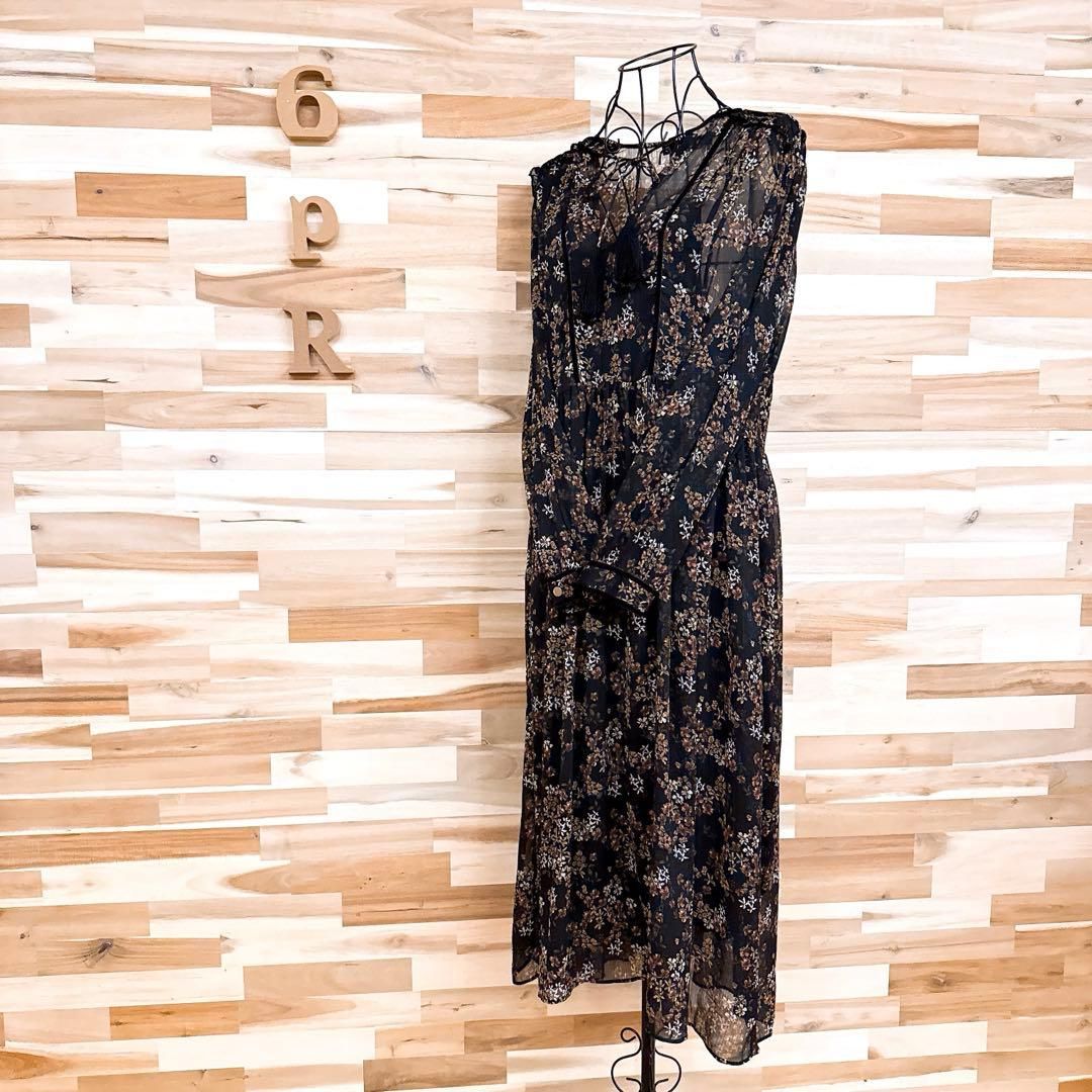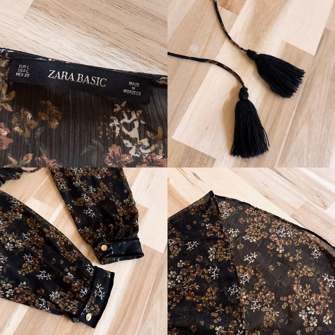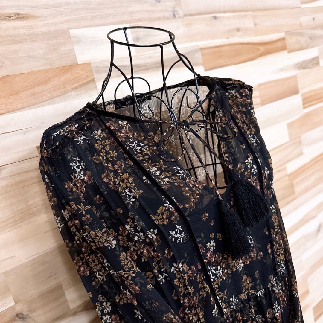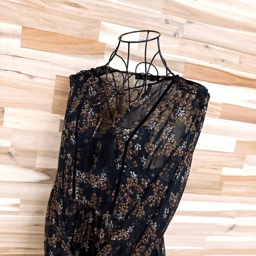 やさしい風合いのシアー素材に、ブラックベースに落ち着いた色合いのフラワープリントが広がる上品な一着。ほんのり透ける素材感が重くなりすぎず、軽やかな着心地に。フロントのタッセルリボンやベロア生地のシームラインがさりげないアクセント。一枚ではもちろん、ショートブーツやベストとの組み合わせで、季節を感じるレイヤードコーデも叶えてくれるZARAのワンピースです。※LGスタイラーにて除菌リフレッシュ・スチームクリーニング済みです。