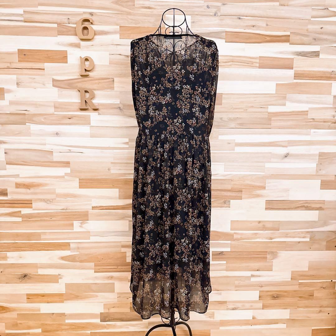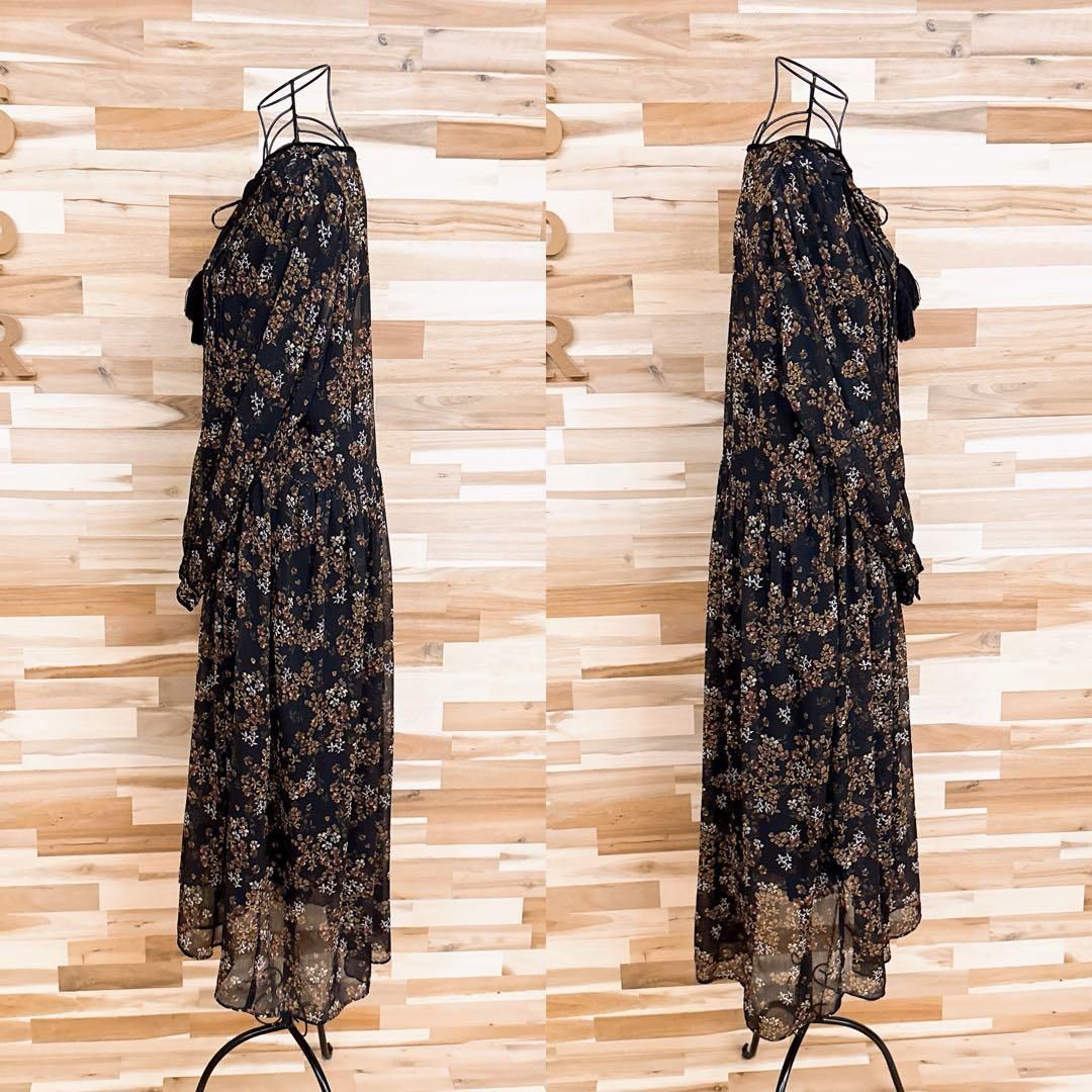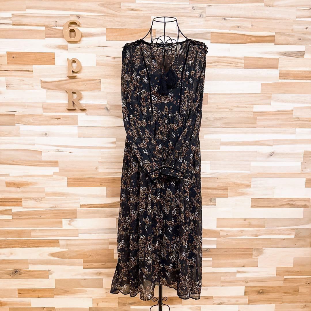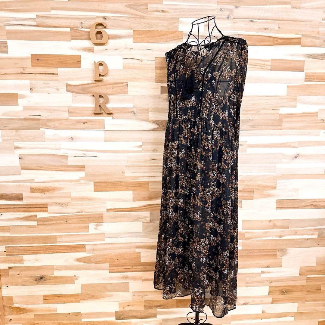 やさしい風合いのシアー素材に、ブラックベースに落ち着いた色合いのフラワープリントが広がる上品な一着。ほんのり透ける素材感が重くなりすぎず、軽やかな着心地に。フロントのタッセルリボンやベロア生地のシームラインがさりげないアクセント。一枚ではもちろん、ショートブーツやベストとの組み合わせで、季節を感じるレイヤードコーデも叶えてくれるZARAのワンピースです。※LGスタイラーにて除菌リフレッシュ・スチームクリーニング済みです。
