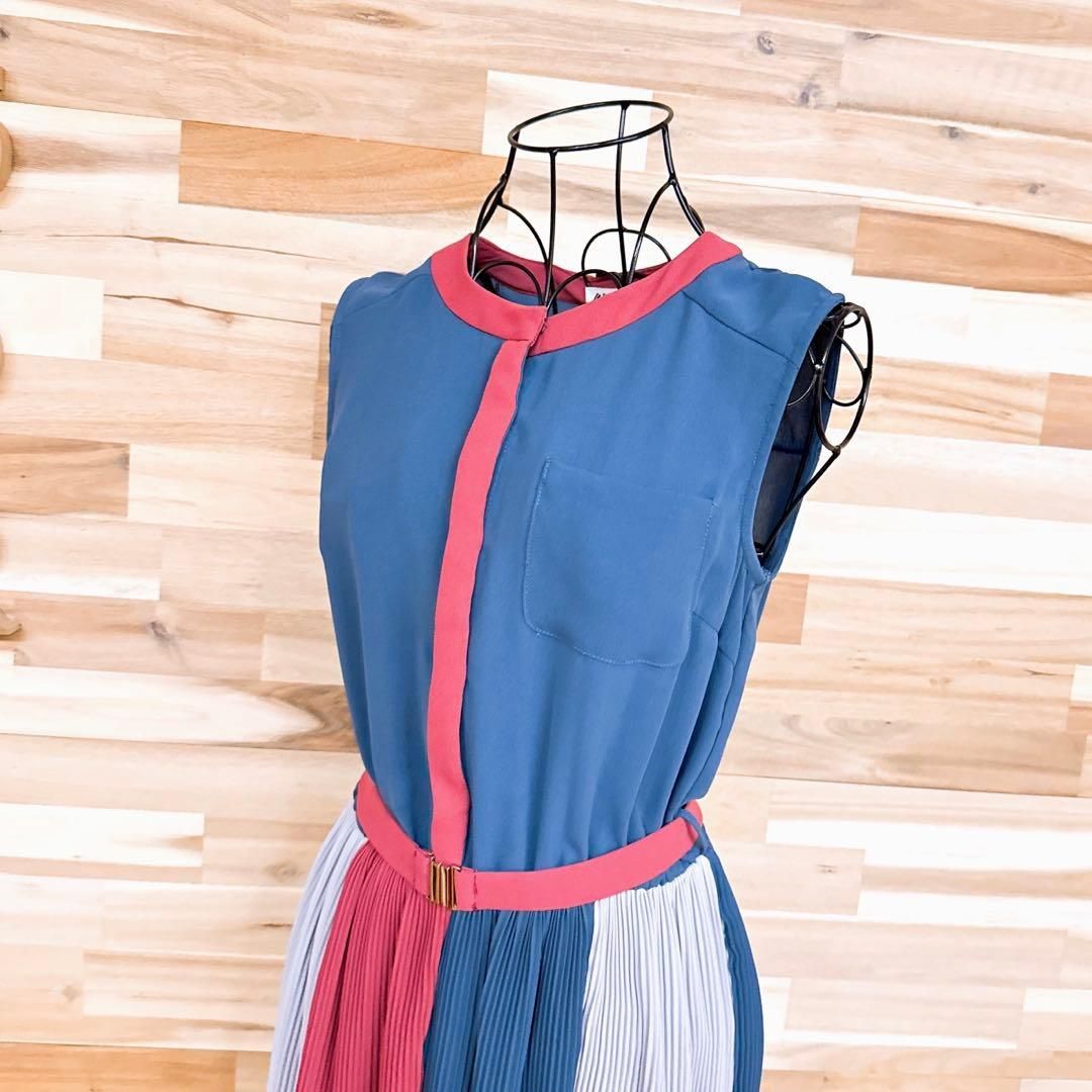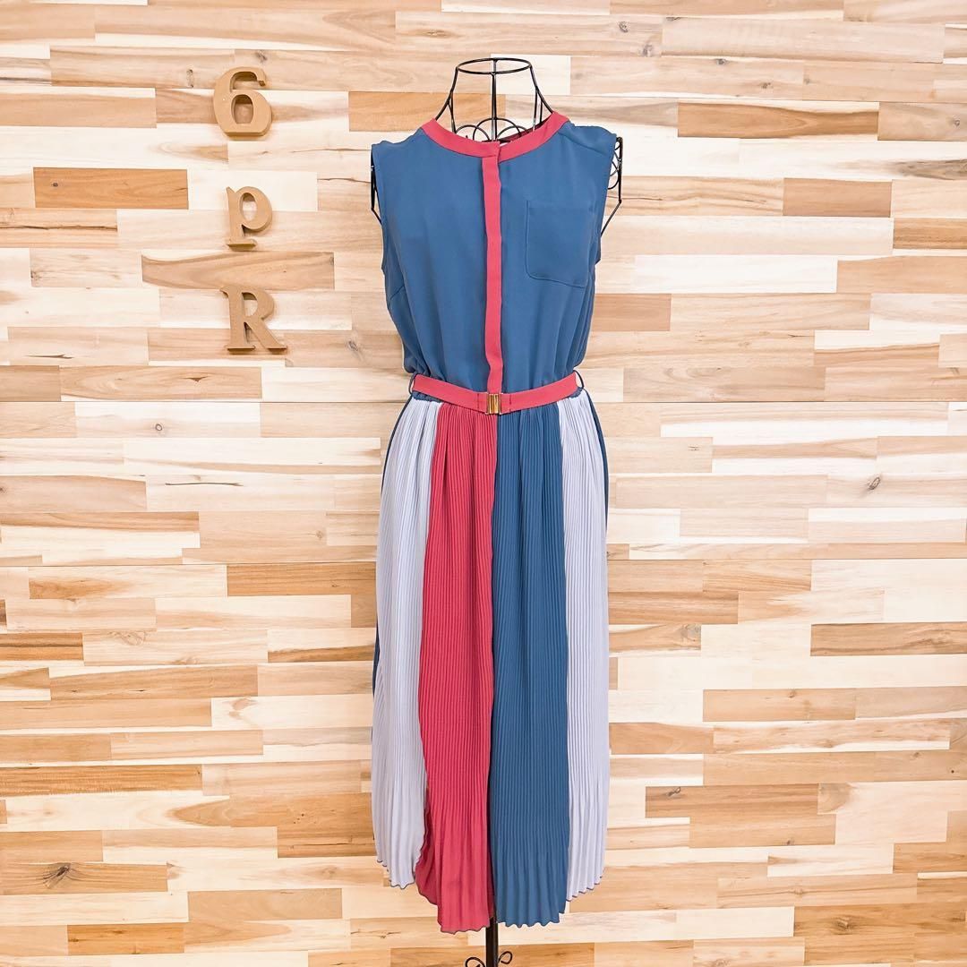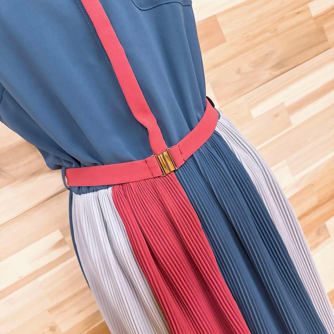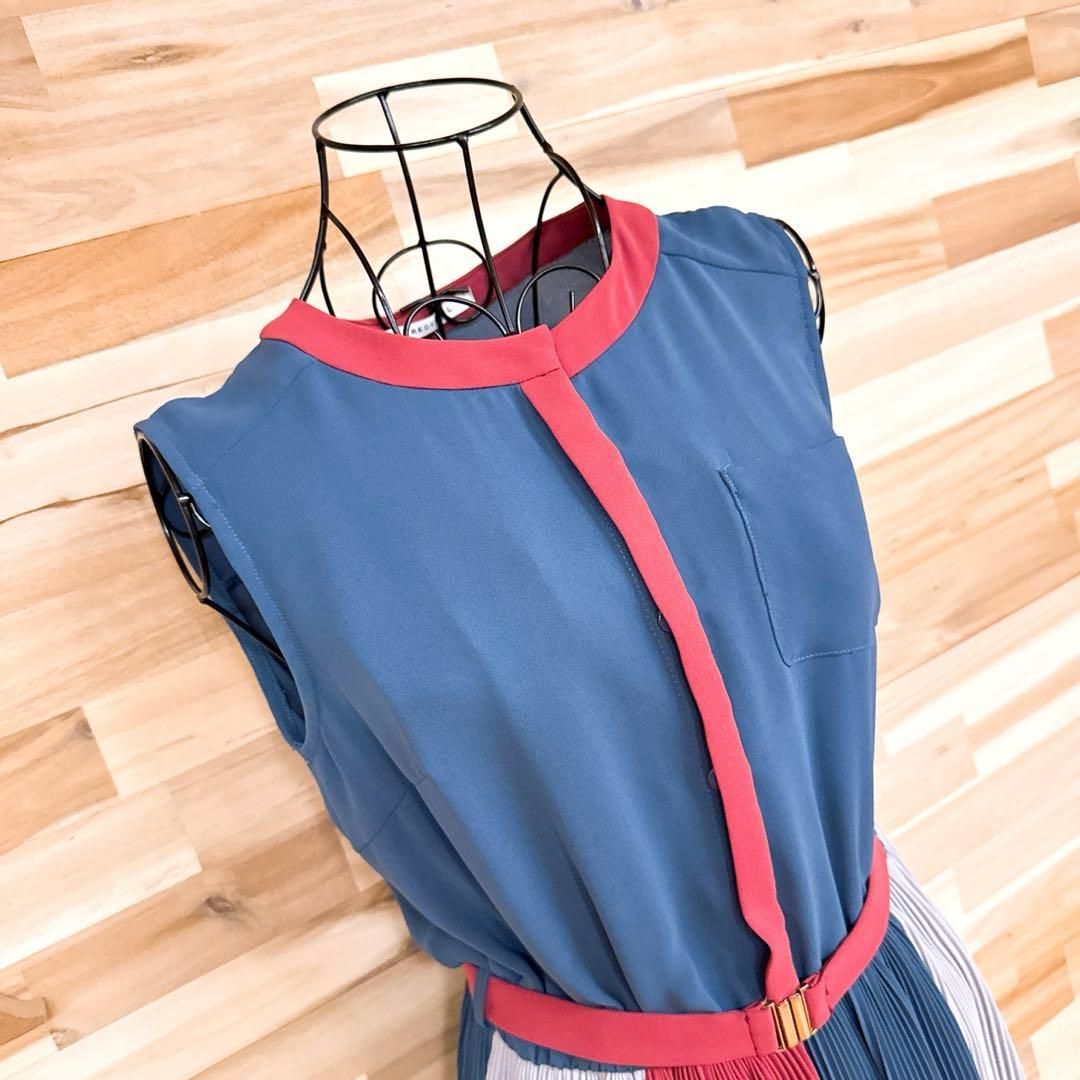 さらりとした軽やかな素材感で、動きのたびに揺れるプリーツが華やかさを演出。くすみのあるブルーをベースに、レッドやライトグレーの切り替えがアクセントとなり、スタイルにリズムをプラス。襟元と前立てに効かせたカラーラインとベルトが全体を引き締め、女性らしい柔らかいシルエットのREDYAZELのワンピースです。※LGスタイラーにて除菌リフレッシュ・スチームクリーニング済みです。