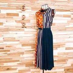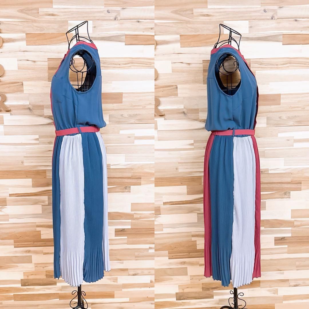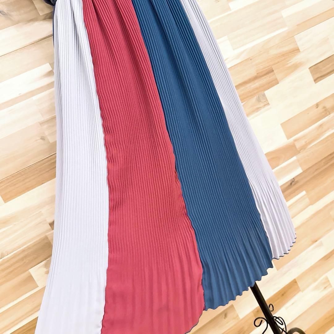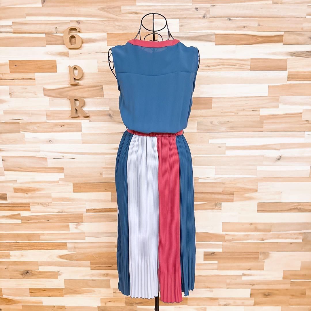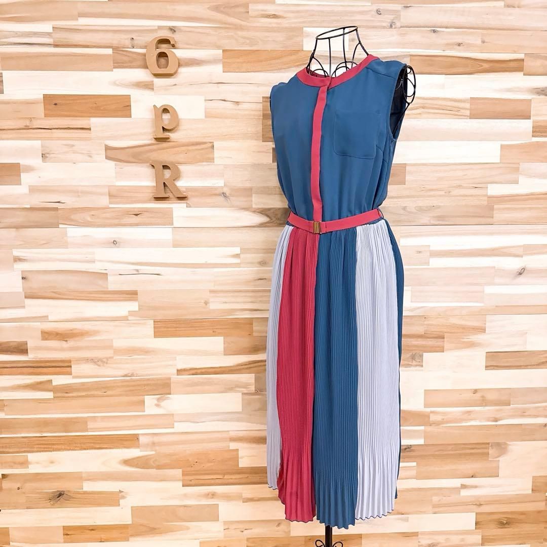 さらりとした軽やかな素材感で、動きのたびに揺れるプリーツが華やかさを演出。くすみのあるブルーをベースに、レッドやライトグレーの切り替えがアクセントとなり、スタイルにリズムをプラス。襟元と前立てに効かせたカラーラインとベルトが全体を引き締め、女性らしい柔らかいシルエットのREDYAZELのワンピースです。※LGスタイラーにて除菌リフレッシュ・スチームクリーニング済みです。