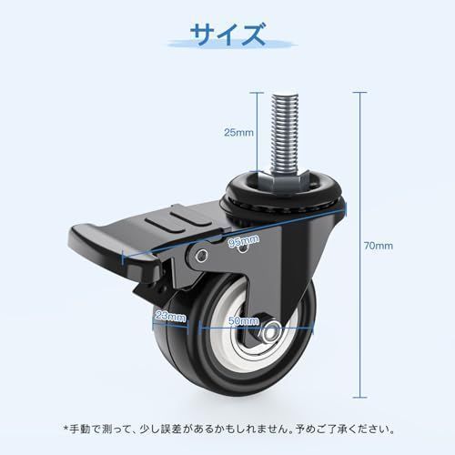 【商品サイズ】*車軸はM8 *M8のピッチは1.25mm(並目) *車軸の長さ約25mm *車輪の直径約50mm *車輪の幅約23mm *手動で測って、少し誤差があるかもしれません。予めご了承ください。ご購入前には必ずお持ちのキャスターのサイズをご確認ください。もし何かご問題がございましたら、ご遠慮なく弊店にお問い合わせください。