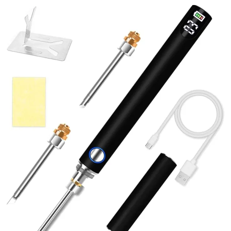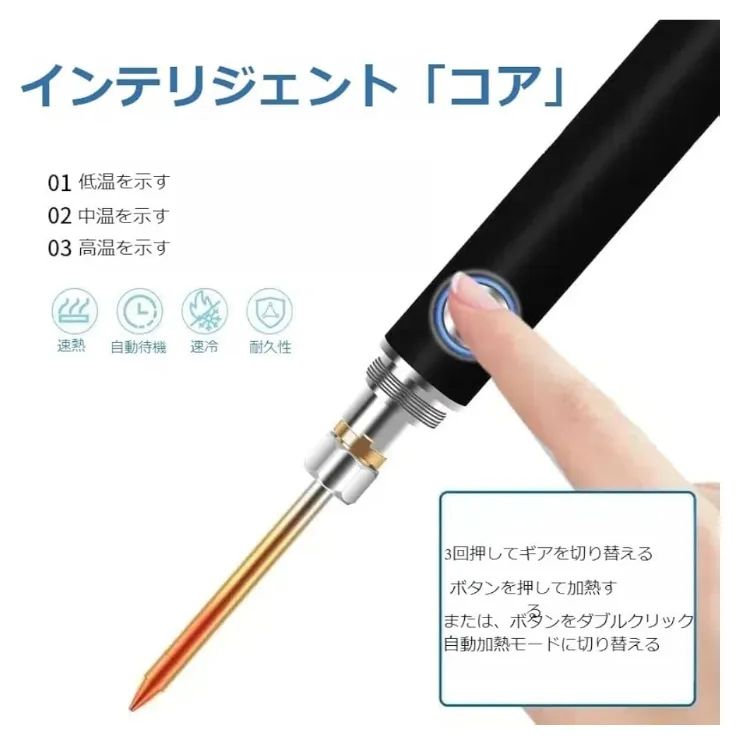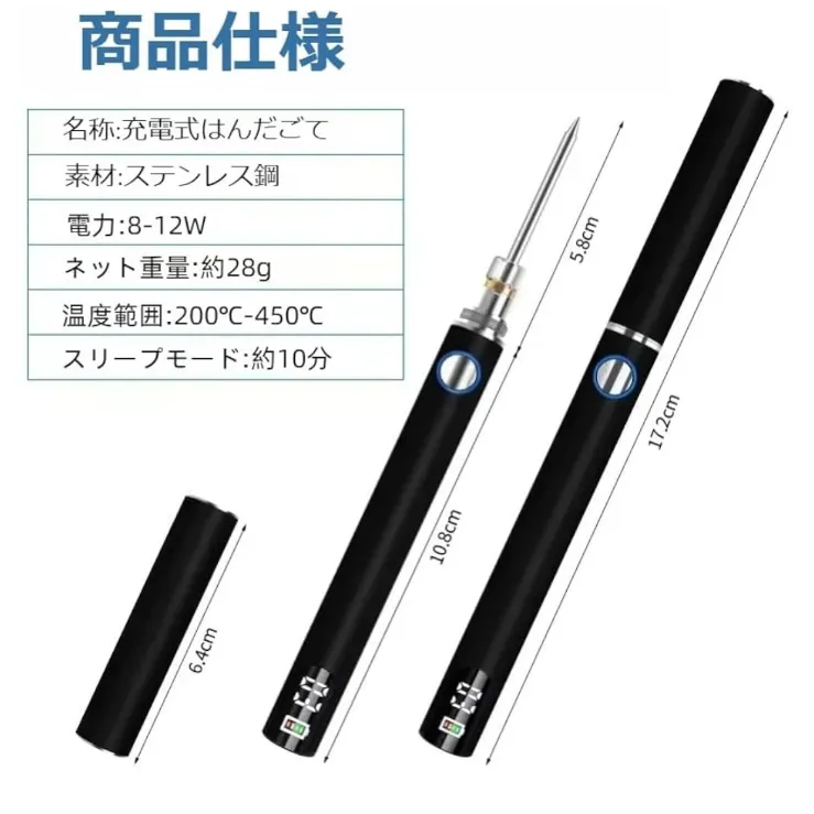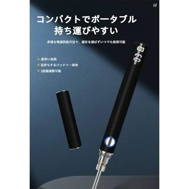 【故障修理】1、液晶点灯、加熱しない:①コテ先一回取り外し、再度取付 ②コテ先交換 2、スイッチ操作しても反応なし:①バッテリー残量確認、充電 ②電源が入ってないか、確認 3、半田が乗らない:こて先がはんだをはじくのは、こて先の酸化が原因です。 こて先が酸化していると熱の伝わりが悪くなり、良好なはんだ付けができなくなります。改善方法:①酸化したコテ先を研磨する。②使用しない時、長時間加熱しないこと。