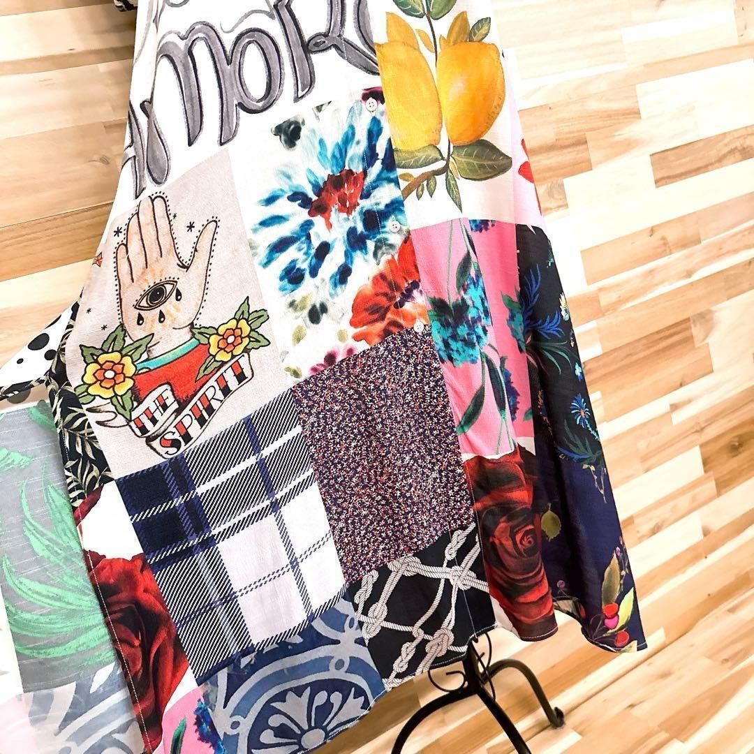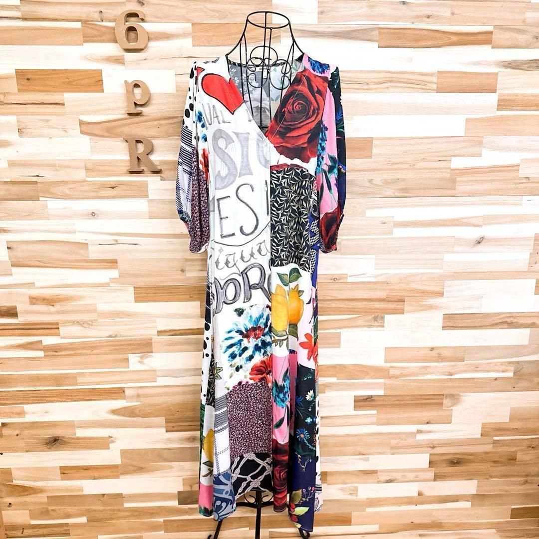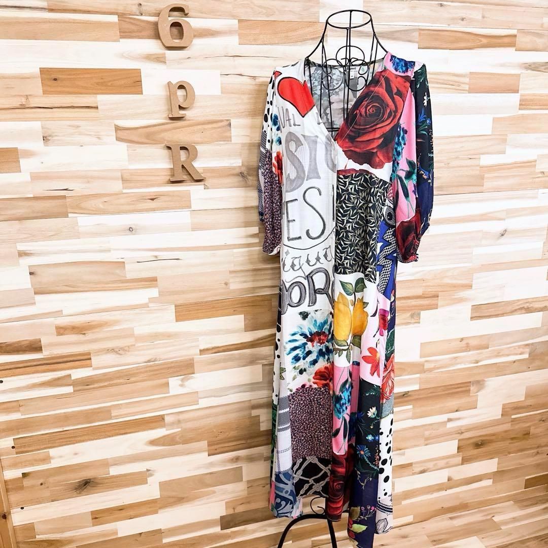 周囲の目を惹くハイセンスなカラーリング。バラや小花柄などのお花、装飾柄、レタリング、ロゴマニアと「愛」のメッセージが魅力的にミックスされ、パッチワークのようにプリントされたDesigualのワンピースです。既に完売しており今では入手困難となっているお品です。※LGスタイラーにて除菌リフレッシュ・スチームクリーニング済みです。