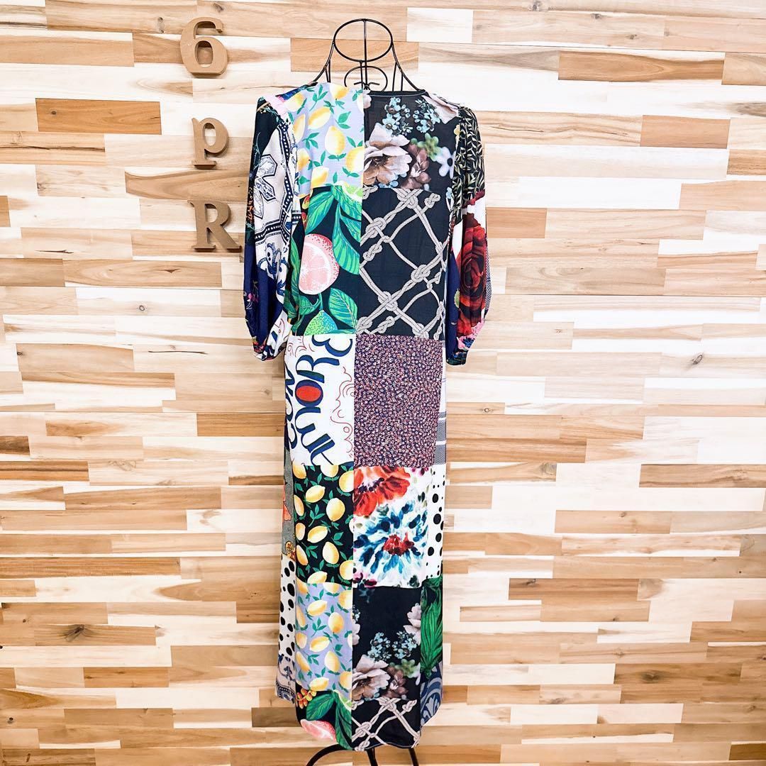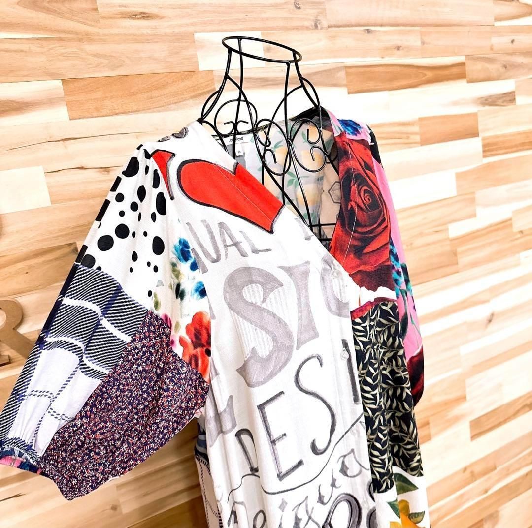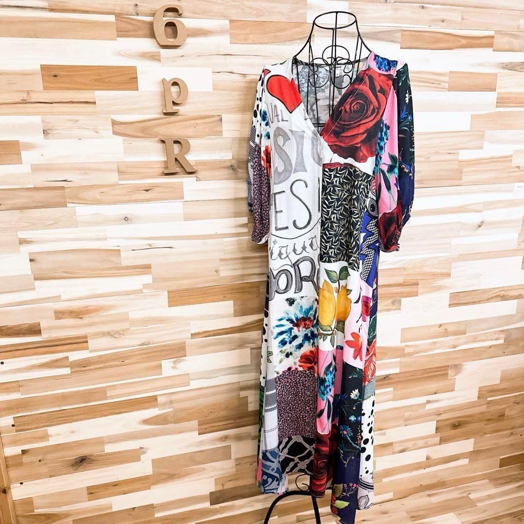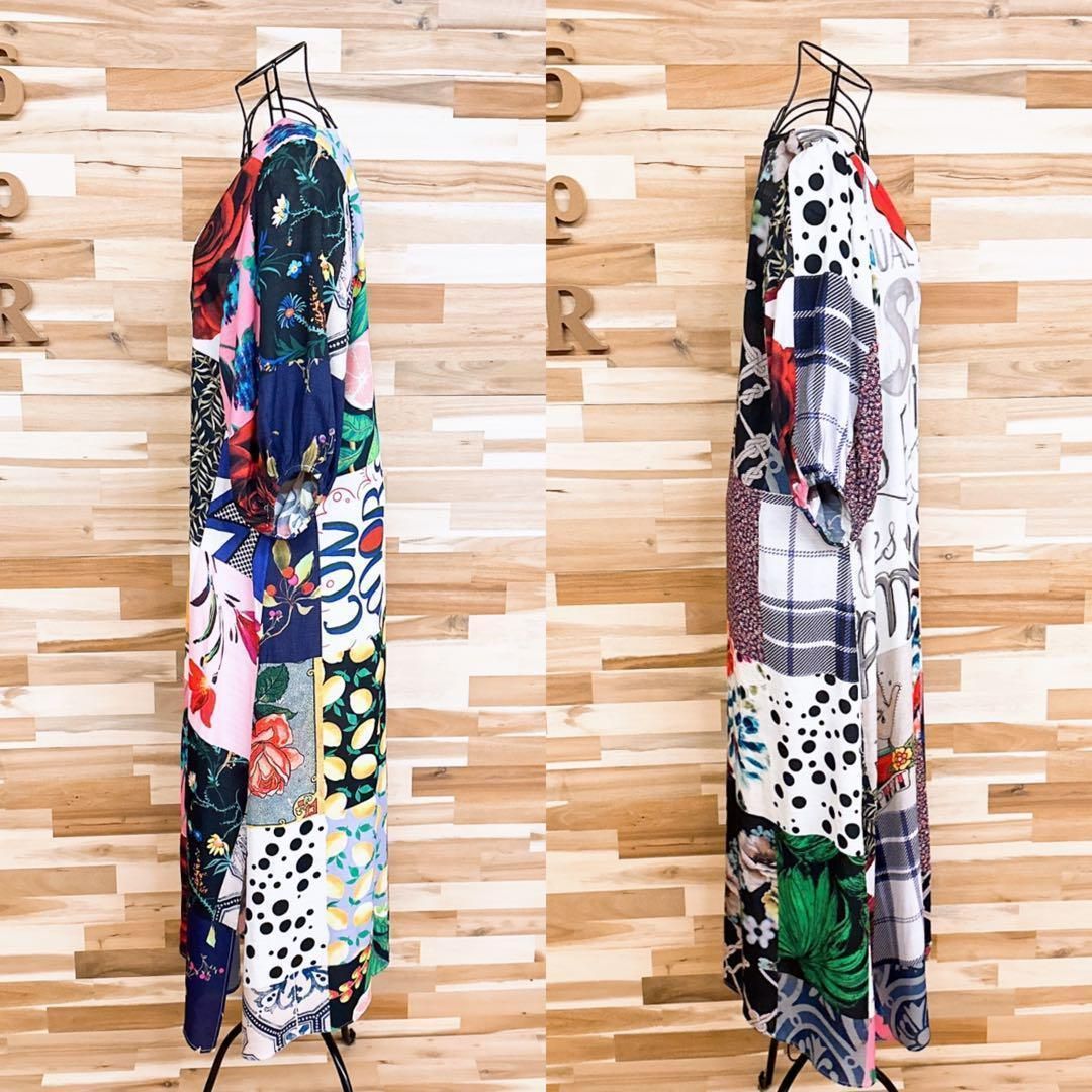周囲の目を惹くハイセンスなカラーリング。バラや小花柄などのお花、装飾柄、レタリング、ロゴマニアと「愛」のメッセージが魅力的にミックスされ、パッチワークのようにプリントされたDesigualのワンピースです。既に完売しており今では入手困難となっているお品です。※LGスタイラーにて除菌リフレッシュ・スチームクリーニング済みです。