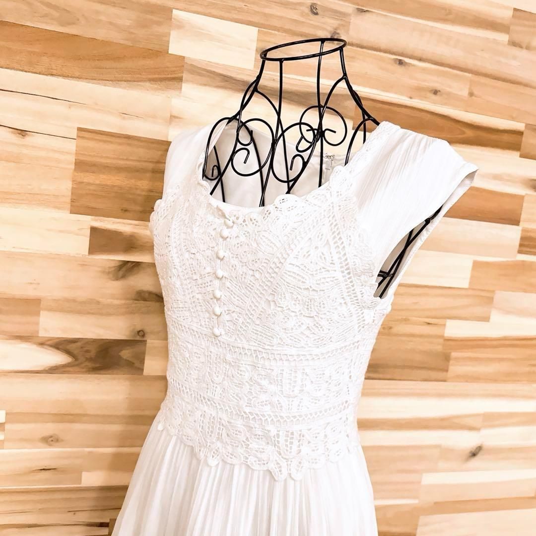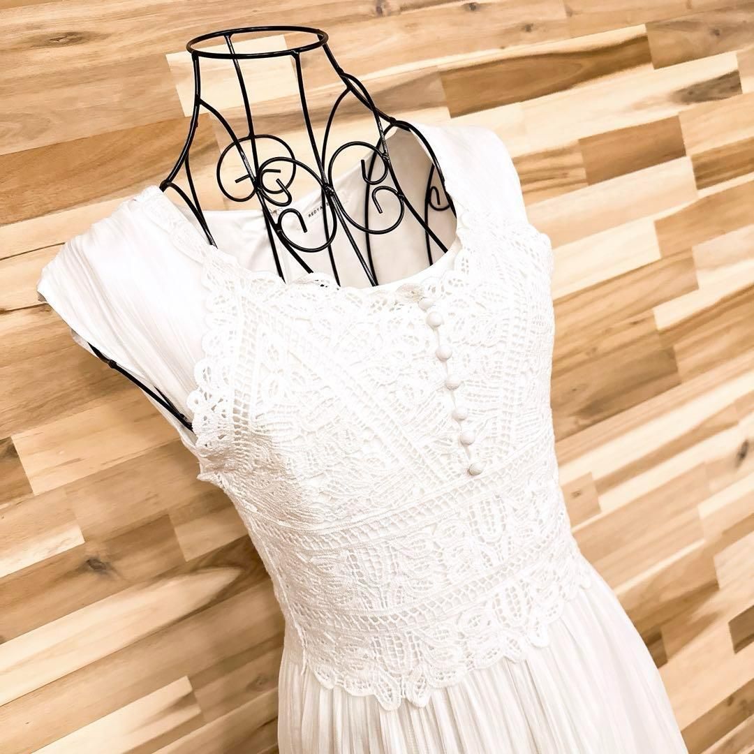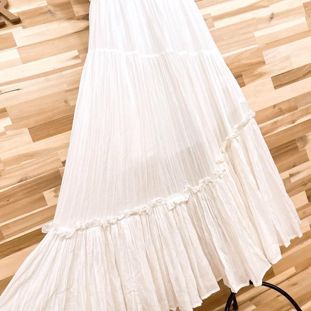 * 02-2125500084 / かぎ針編みキャミソールドッキングワンピース *繊細な編み込みビスチェがレイヤードされた、アシンメトリーのロングシルエット。裾に向かってふわっと広がるボリュームたっぷりのエアリーな素材感。清潔感がありクリーンな印象を与えてくれるホワイトカラーでまとめられた、大人かわいいREDYAZELのワンピースです。定価16500円。※LGスタイラーにて除菌リフレッシュ・スチームクリーニング済みです。