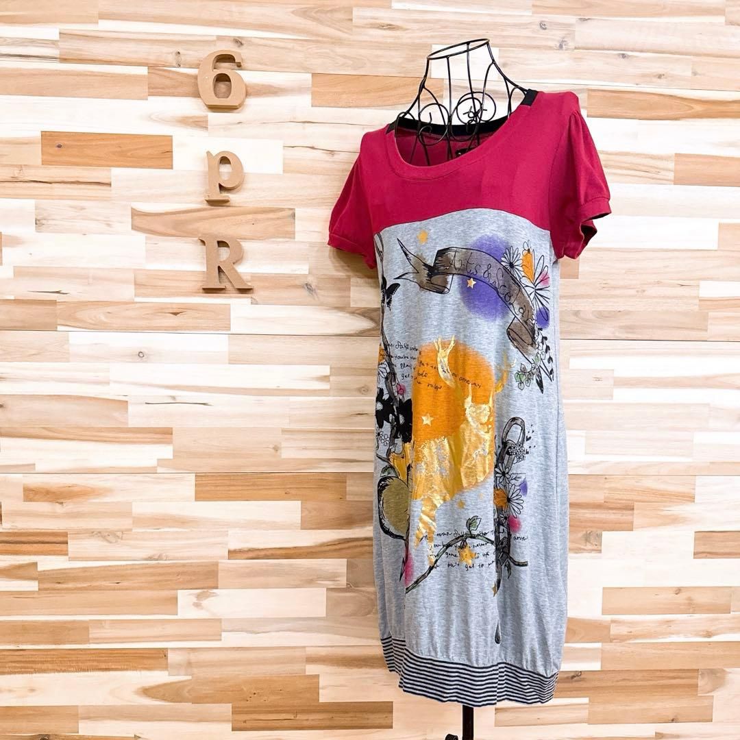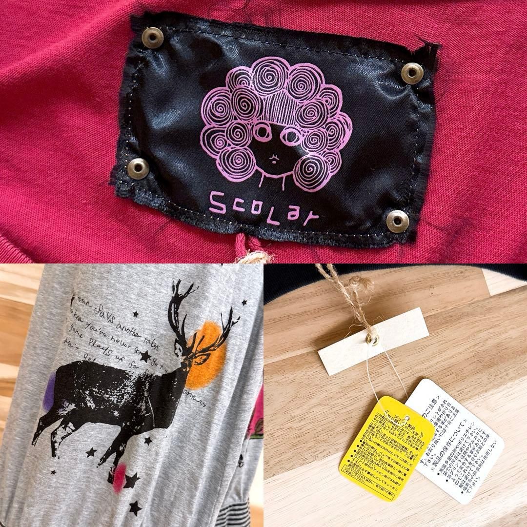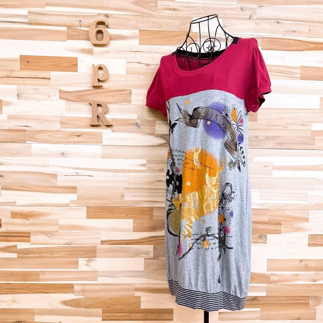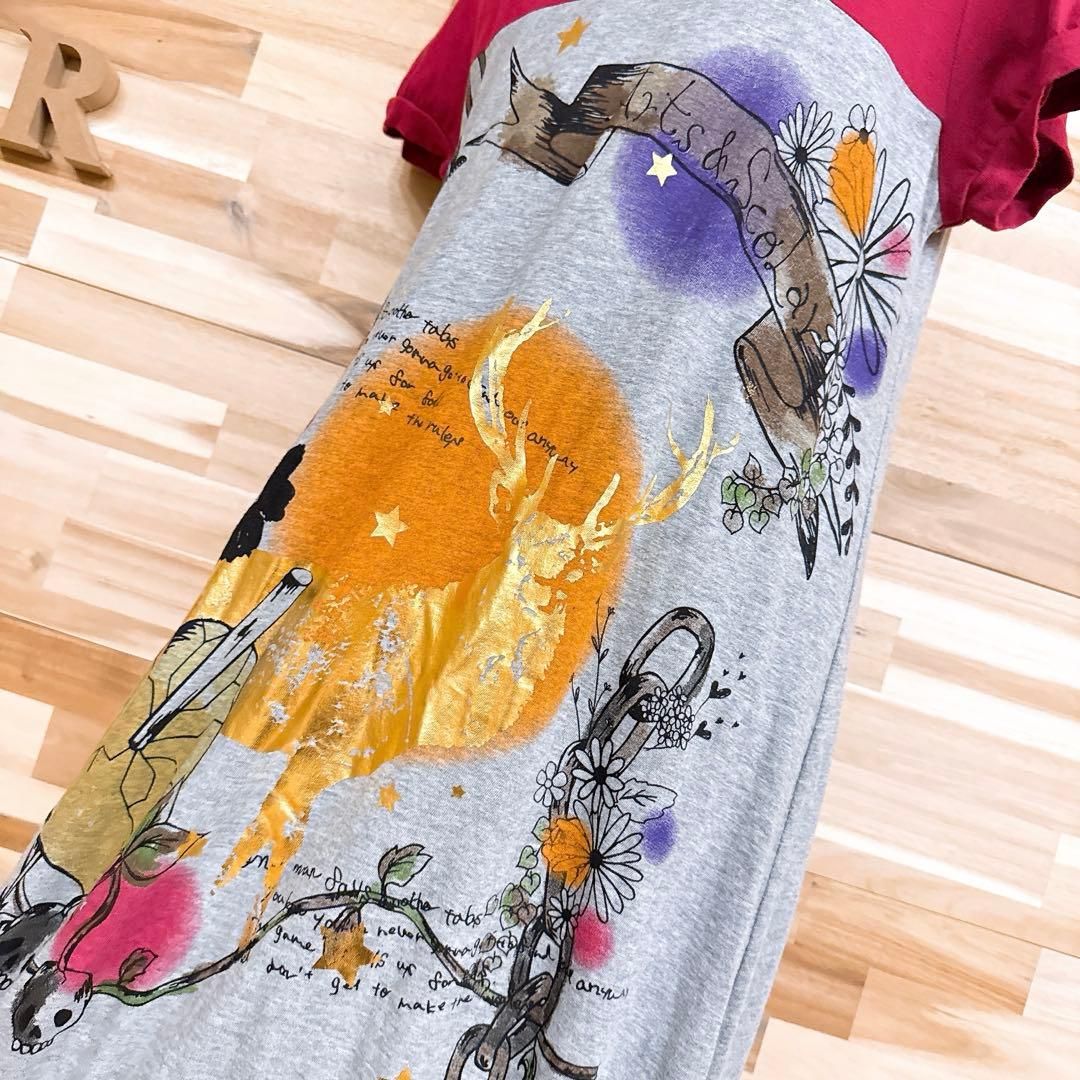 やや薄手の柔らかい肌触り。バーガンディの上身頃とライトグレーのボディが絶妙なコントラスト。艶感あるゴールドの鹿プリントや、カラフルなペイント風モチーフが印象的で、裾のボーダー切替がさりげないアクセントに。シンプルなボトムとの相性も良く、デイリーに気分を上げてくれるScoLarのワンピースです。